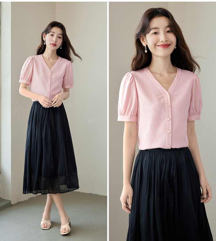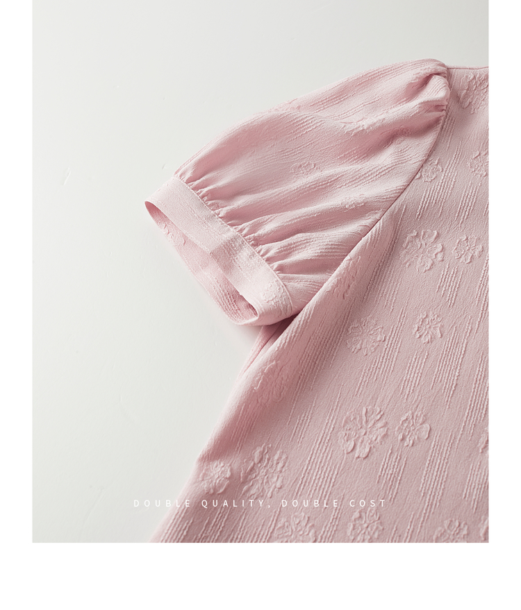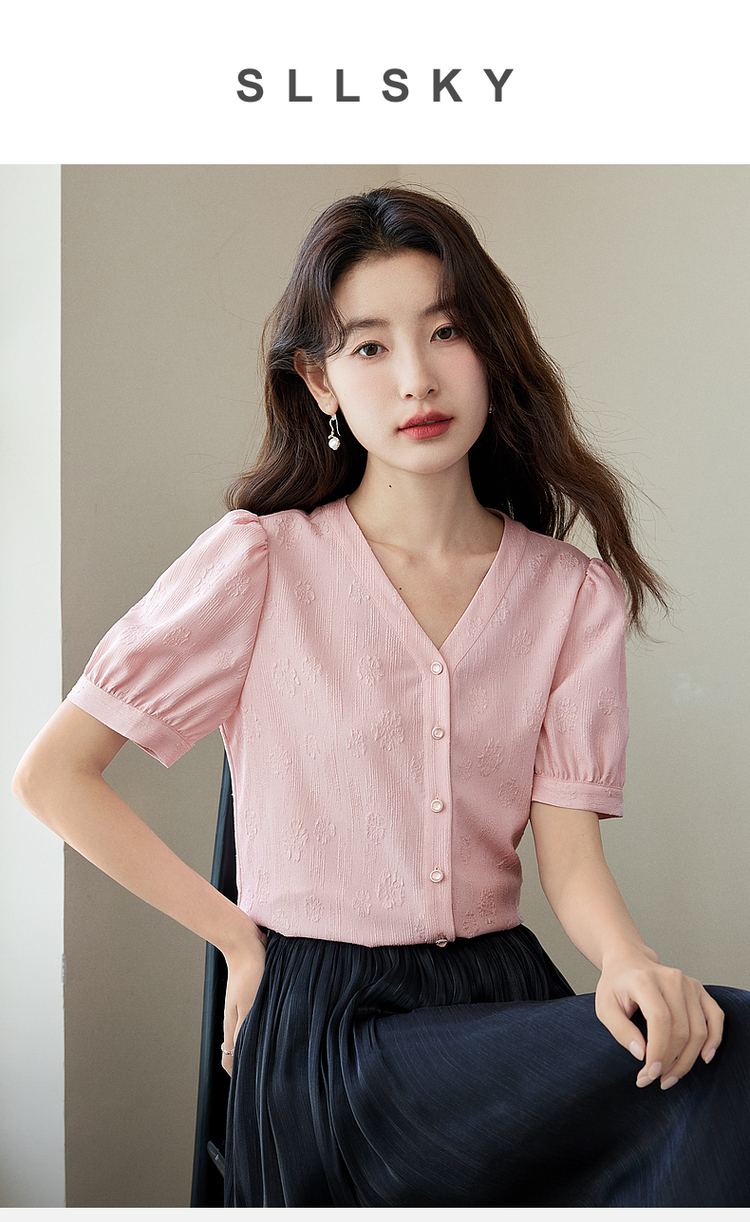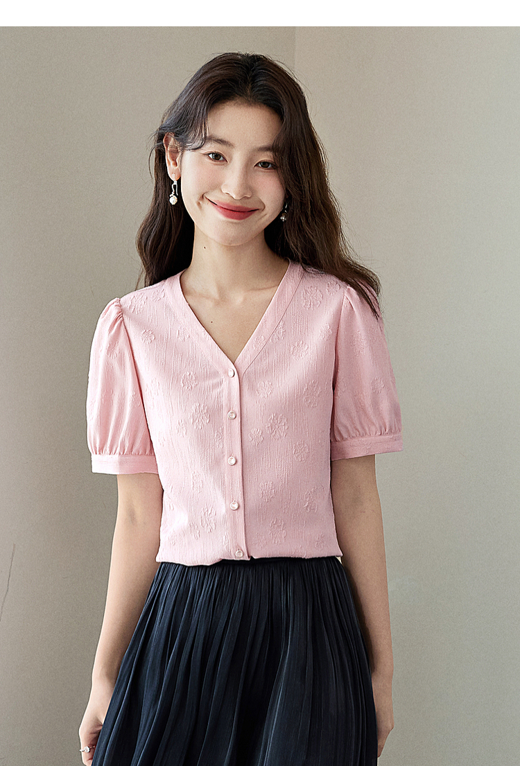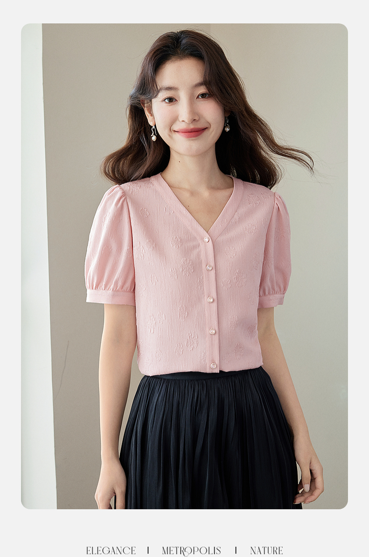 【专属特价】熙世界法式V领提花粉色衬衫女2025夏季新款气质显瘦泡泡袖上衣