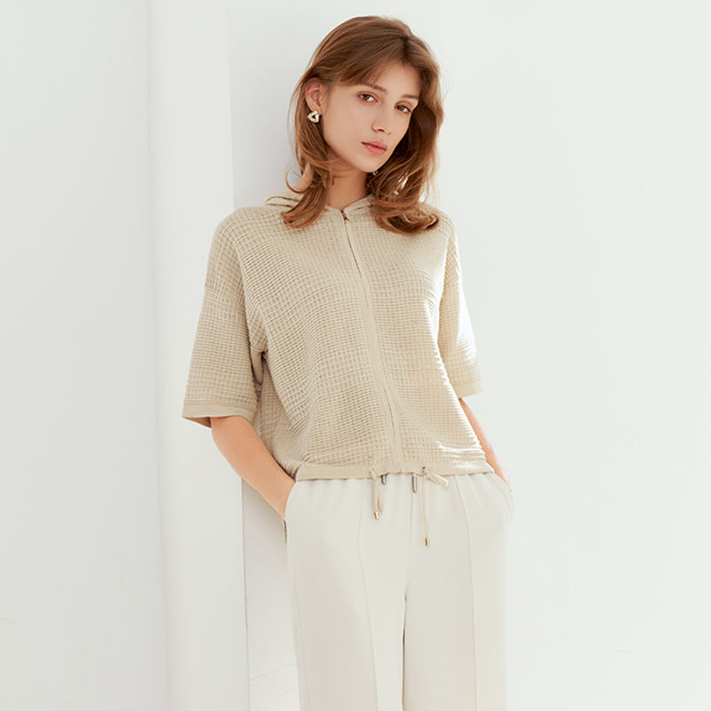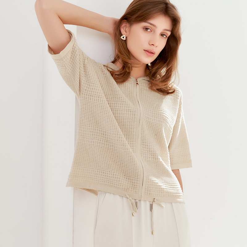 【连帽短袖针织开衫】23年春夏新品女士镂空针织开衫时尚短袖小外套