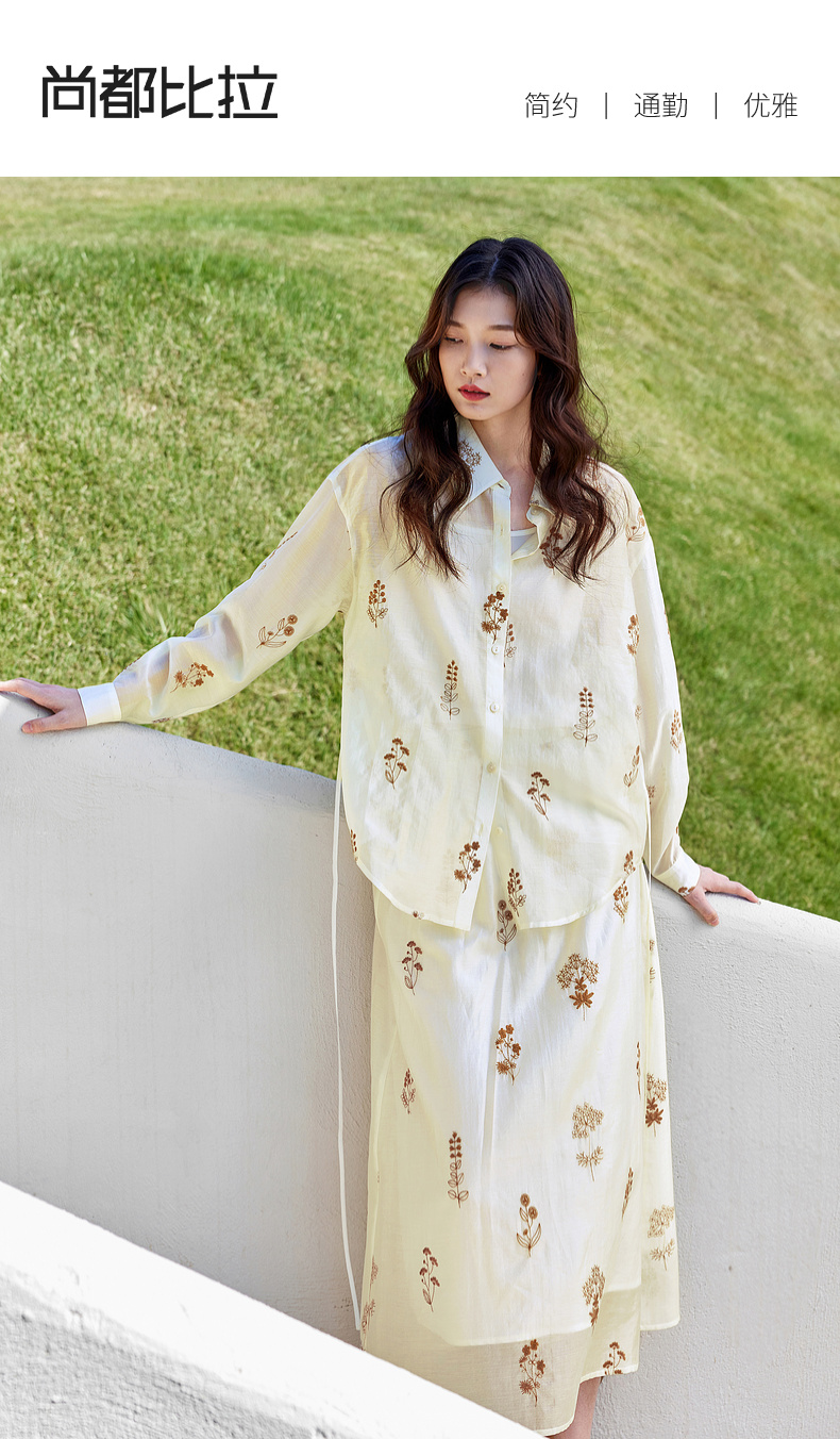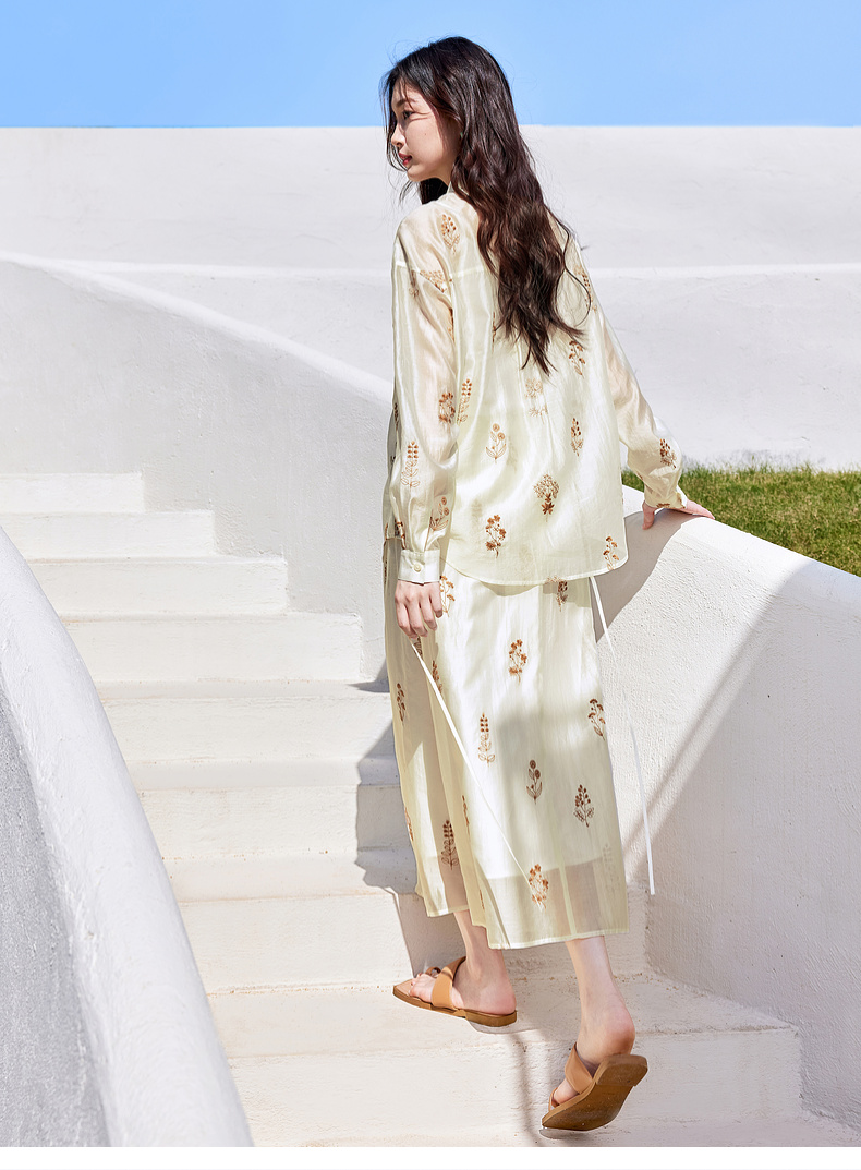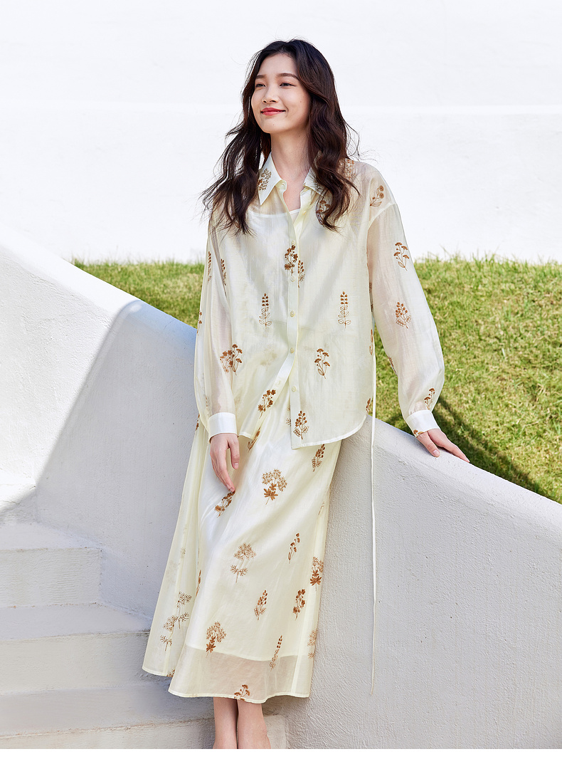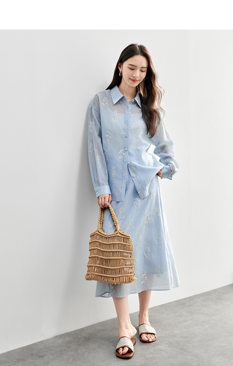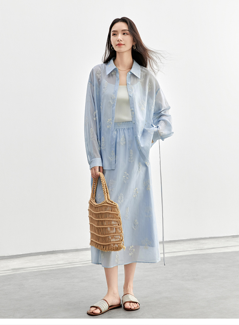【内购】优雅撞色刺绣翻领系绑带衬衫&松紧腰A字中长半身裙-151Z58161