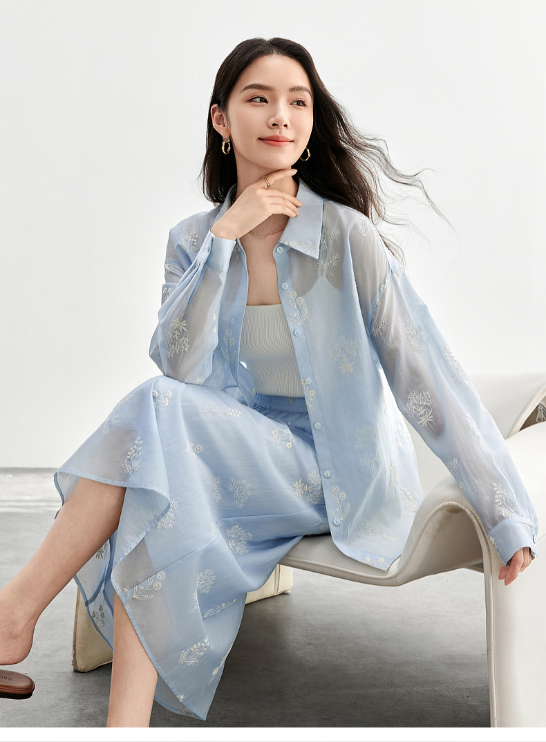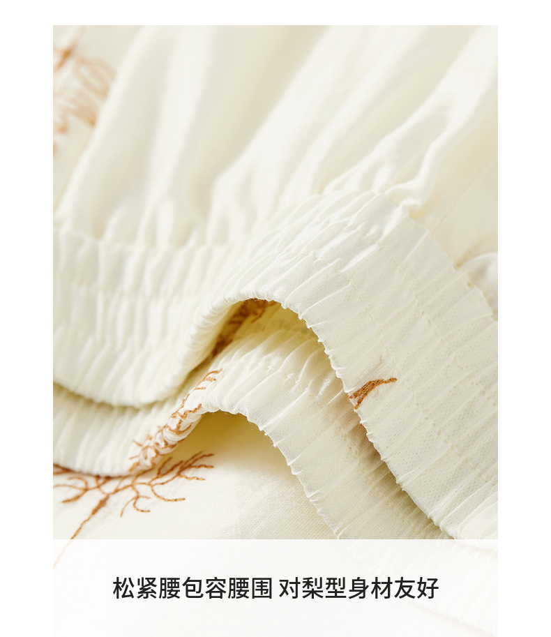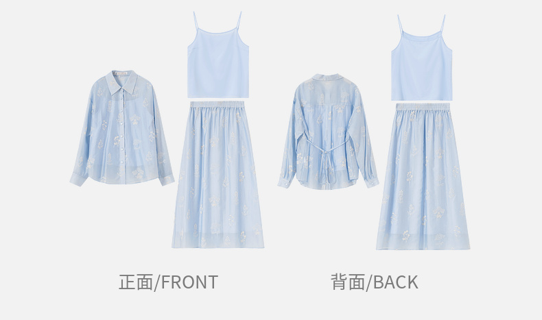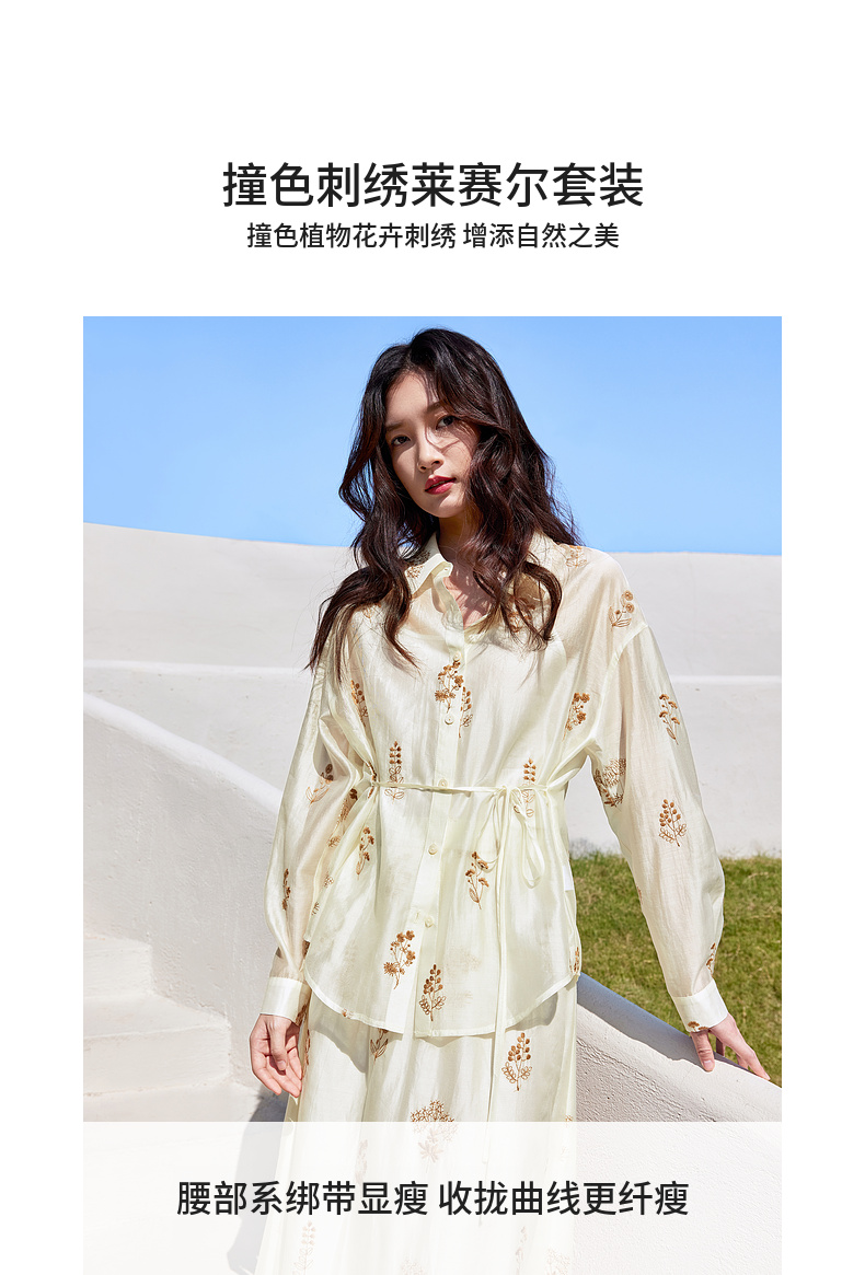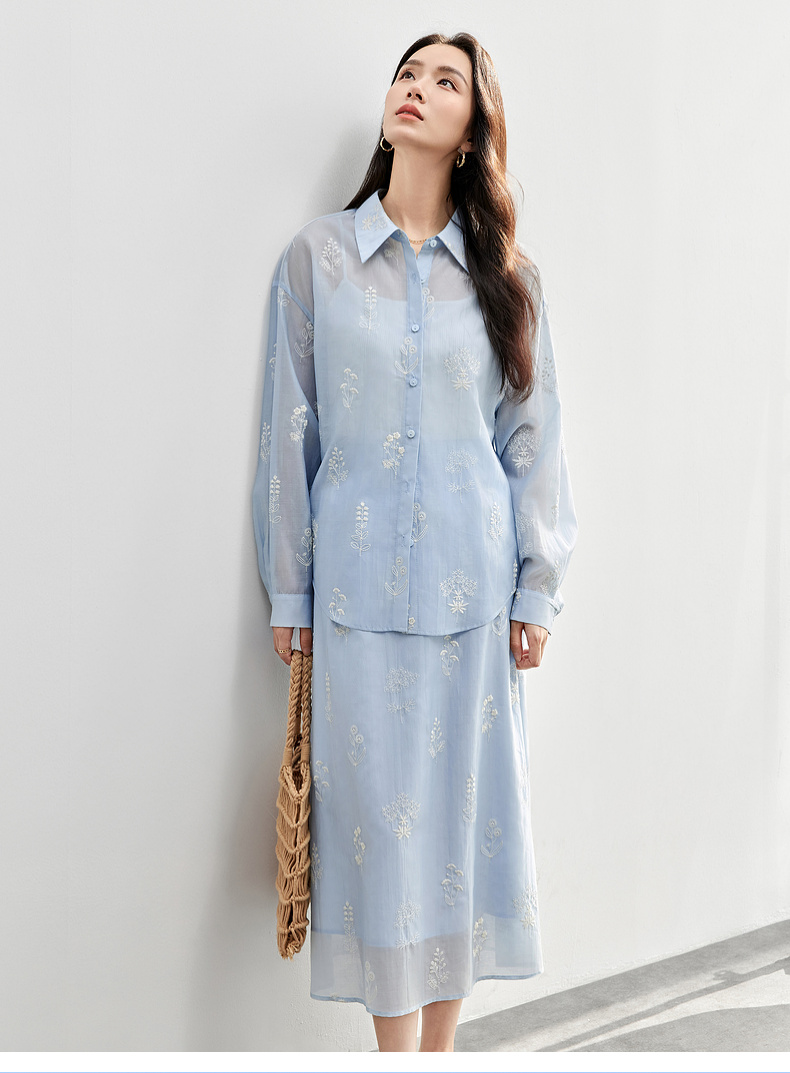 【内购】优雅撞色刺绣翻领系绑带衬衫&松紧腰A字中长半身裙-151Z58161