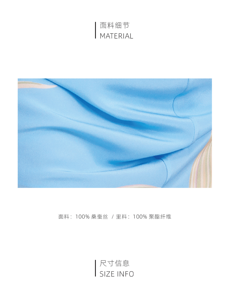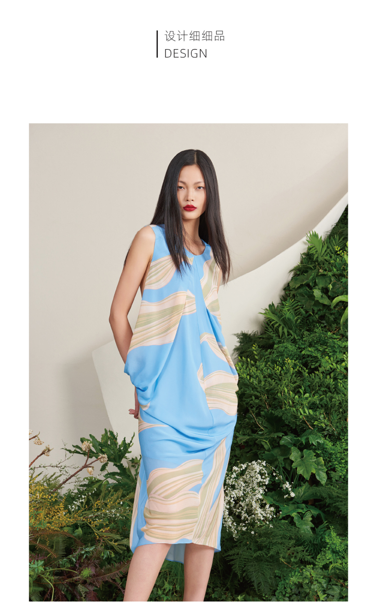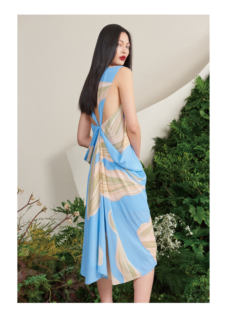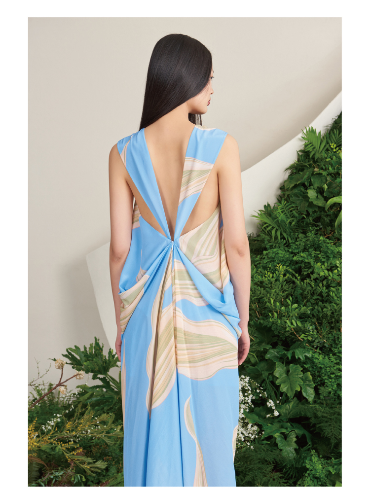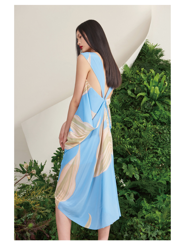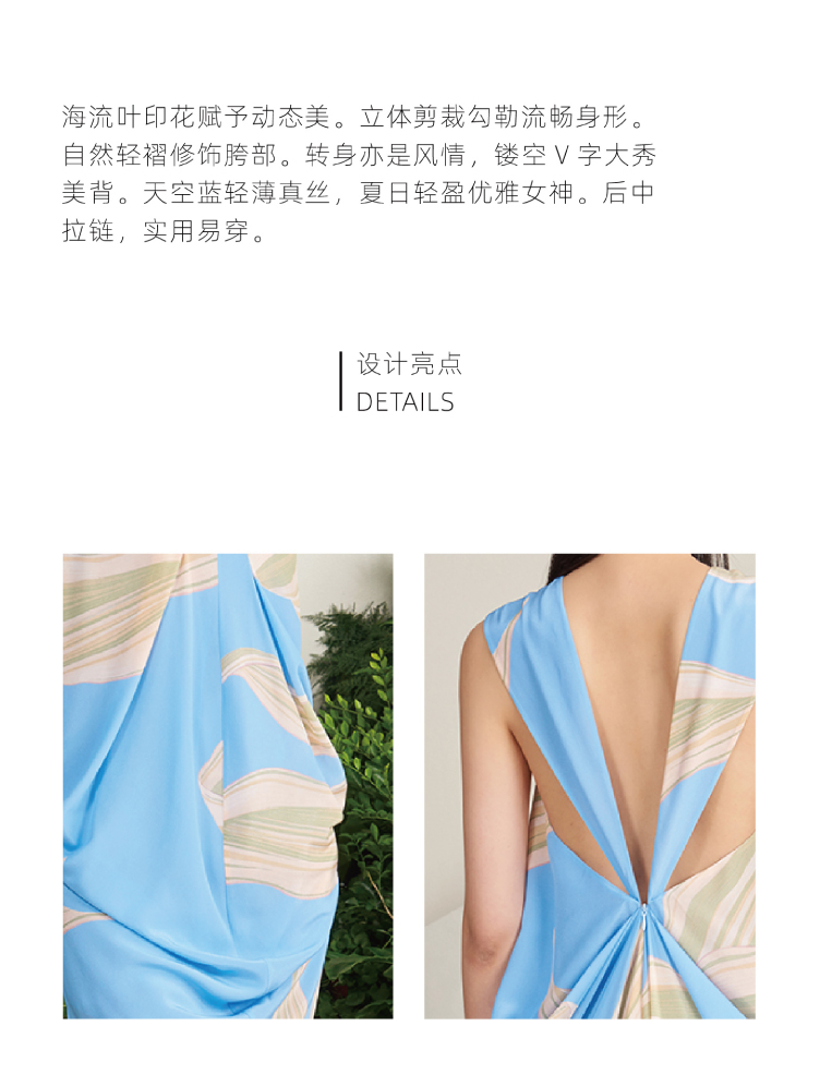 【木本曼陀罗】海流叶后背V字镂空天空蓝真丝立裁连衣裙/0000659B