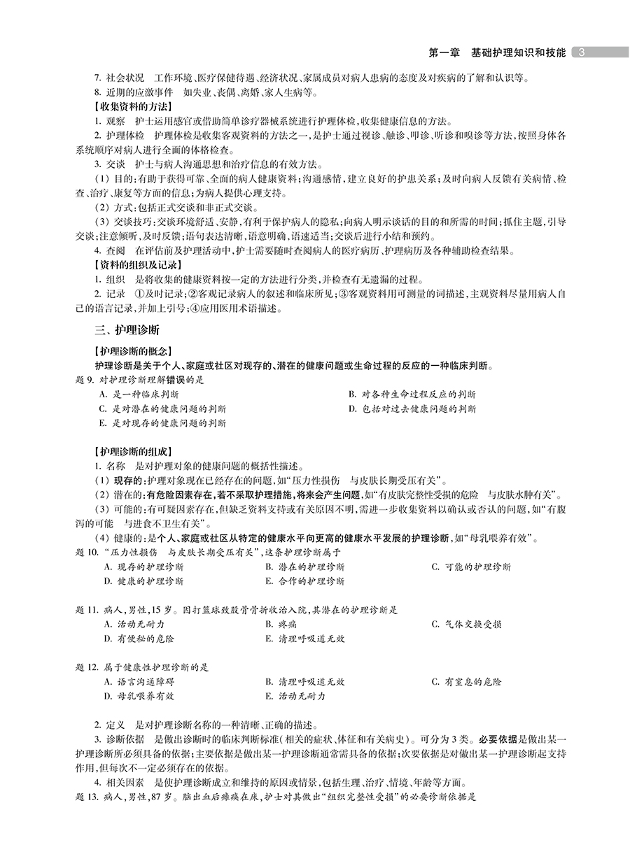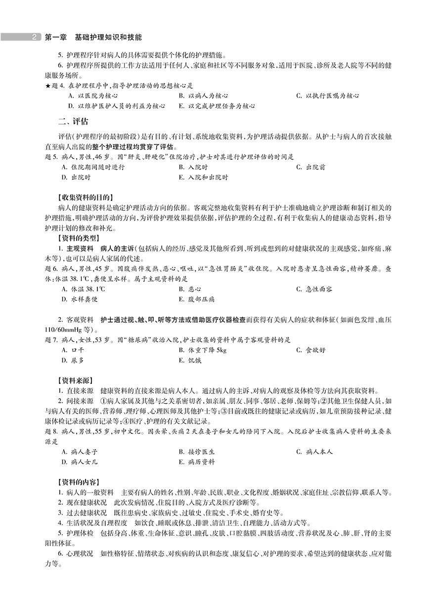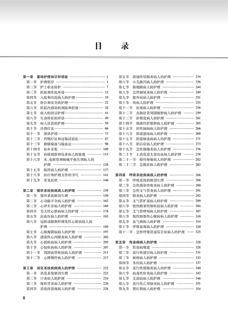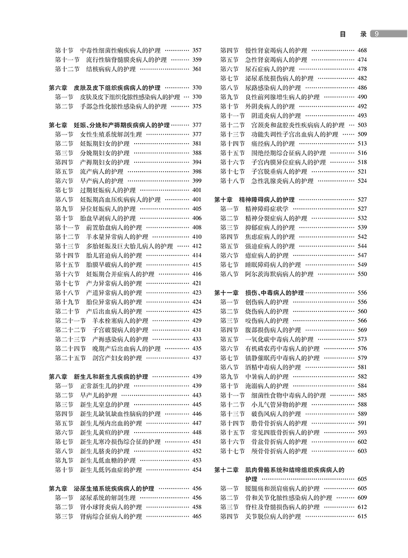 第一章 基础护理知识和技能 / 1 第一节 护理程序 / 1 第二节 护士职业防护 / 7 第三节 医院和住院环境/ 12 第四节 入院和出院病人的护理/ 19 第五节 卧位和安全的护理/ 22 第六节 医院内感染的预防和控制/ 28 第七节 病人的清洁护理/ 41 第八节 生命体征的评估/ 49 第九节 病人饮食的护理/ 59 第十节 冷热疗法/ 66 第十一节 排泄护理/ 73 第十二节 药物疗法和过敏试验法/ 87 第十三节 静脉输液与输血法/ 98 第十四节 标本采集 / 109 第十五节 病情观察和危重病人的抢救 / 115 第十六节 水、电解质和酸碱平衡失调病人的护理 / 128 第十七节 临终病人的护理 / 137 第十八节 医疗和护理文件的书写 / 141 第十九节 常见症状 / 146 第二章 循环系统疾病病人的护理 / 159 第一节 循环系统解剖生理 / 159 第二节 心功能不全病人的护理 / 162 第三节 心律失常病人的护理 / 169 第四节 先天性心脏病病人的护理 / 178 第五节 高血压病人的护理 / 183 第六节 冠状动脉粥样硬化性心脏病病人的护理 / 189 第七节 心脏瓣膜病病人的护理 / 197 第八节 感染性心内膜炎病人的护理 / 202 第九节 心肌疾病病人的护理 / 205 第十节 心包疾病病人的护理 / 207 第十一节 周围血管疾病病人的护理 / 211 第十二节 心搏骤停病人的护理 / 217 第三章 消化系统疾病病人的护理 / 222 第一节 消化系统解剖生理 / 222 第二节 口炎病人的护理 / 224 第三节 慢性胃炎病人的护理 / 226 第四节 消化性溃疡病人的护理 / 228 第五节 溃疡性结肠炎病人的护理 / 234 第六节 小儿腹泻病人的护理 / 236 第七节 肠梗阻病人的护理 / 244 第八节 急性阑尾炎病人的护理 / 249 第九节 腹外疝病人的护理 / 251 第十节 痔病人的护理 / 255 第十一节 肛瘘病人的护理 / 258 第十二节 直肠肛管周围脓肿病人的护理 / 259 第十三节 肝硬化病人的护理 / 261 第十四节 细菌性肝脓肿病人的护理 / 265 第十五节 肝性脑病病人的护理 / 266 第十六节 胆道感染病人的护理 / 269 第十七节 胆道蛔虫病病人的护理 / 271 第十八节 胆石症病人的护理 / 273 第十九节 急性胰腺炎病人的护理 / 276 第二十节 上消化道大量出血病人的护理 / 278 第二十一节 慢性便秘病人的护理 / 282 第二十二节 急腹症病人的护理 / 283 第四章 呼吸系统疾病病人的护理 / 288 第一节 呼吸系统的解剖生理 / 288 第二节 急性感染性喉炎病人的护理 / 290 第三节 急性支气管炎病人的护理 / 291 第四节 肺炎病人的护理 / 292 第五节 支气管扩张病人的护理 / 299 第六节 慢性阻塞性肺疾病病人的护理 / 304 第七节 支气管哮喘病人的护理 / 307 第八节 慢性肺源性心脏病病人的护理 / 310 第九节 血气胸病人的护理 / 314 第十节 呼吸衰竭病人的护理 / 320 第十一节 急性呼吸窘迫综合征病人的护理 / 325 第五章 传染病病人的护理 / 328 第一节 传染病概述 / 328 第二节 流行性感冒病人的护理 / 331 第三节 麻疹病人的护理 / 333 第四节 水痘病人的护理 / 337 第五节 流行性腮腺炎病人的护理 / 340 第六节 病毒性肝炎病人的护理 / 342 第七节 艾滋病病人的护理 / 346 第八节 流行性乙型脑炎病人的护理 / 351 第九节 猩红热病人的护理 / 354 第十节 中毒性细菌性痢疾病人的护理 / 357 第十一节 流行性脑脊髓膜炎病人的护理 / 359 第十二节 结核病病人的护理 / 361 第六章 皮肤及皮下组织疾病病人的护理 / 370 第一节 皮肤及皮下组织化脓性感染病人的护理 / 370 第二节 手部急性化脓性感染病人的护理 / 375 第七章 妊娠、分娩和产褥期疾病病人的护理/ 377 第一节 女性生殖系统解剖生理 / 377 第二节 妊娠期妇女的护理 / 381 第三节 分娩期妇女的护理 / 388 第四节 产褥期妇女的护理 / 394 第五节 流产病人的护理 / 398 第六节 早产病人的护理 / 399 第七节 过期妊娠病人的护理 / 401 第八节 妊娠期高血压疾病病人的护理 / 401 第九节 异位妊娠病人的护理 / 405 第十节 胎盘早剥病人的护理 / 406 第十一节 前置胎盘病人的护理 / 408 第十二节 羊水量异常病人的护理 / 410 第十三节 多胎妊娠及巨大胎儿病人的护理 / 412 第十四节 胎儿窘迫病人的护理 / 414 第十五节 胎膜早破病人的护理 / 415 第十六节 妊娠期合并症病人的护理 / 416 第十七节 产力异常病人的护理 / 421 第十八节 产道异常病人的护理 / 423 第十九节 胎位异常病人的护理 / 424 第二十节 产后出血病人的护理 / 425 第二十一节 羊水栓塞病人的护理 / 429 第二十二节 子宫破裂病人的护理 / 431 第二十三节 产褥感染病人的护理 / 433 第二十四节 晚期产后出血病人的护理 / 435 第二十五节 剖宫产妇女的护理 / 437 第八章 新生儿和新生儿疾病的护理 / 439 第一节 正常新生儿的护理 / 439 第二节 早产儿的护理 / 443 第三节 新生儿窒息的护理 / 445 第四节 新生儿缺氧缺血性脑病的护理 / 446 第五节 新生儿颅内出血的护理 / 447 第六节 新生儿黄疸的护理 / 448 第七节 新生儿寒冷损伤综合征的护理 / 451 第八节 新生儿脐炎的护理 / 452 第九节 新生儿低血糖的护理 / 453 第十节 新生儿低钙血症的护理 / 454 第九章 泌尿生殖系统疾病病人的护理 / 456 第一节 泌尿系统的解剖生理 / 456 第二节 肾小球肾炎病人的护理 / 458 第三节 肾病综合征病人的护理 / 465 第四节 慢性肾衰竭病人的护理 / 468 第五节 急性肾衰竭病人的护理 / 474 第六节 尿石症病人的护理 / 478 第七节 泌尿系统损伤病人的护理 / 482 第八