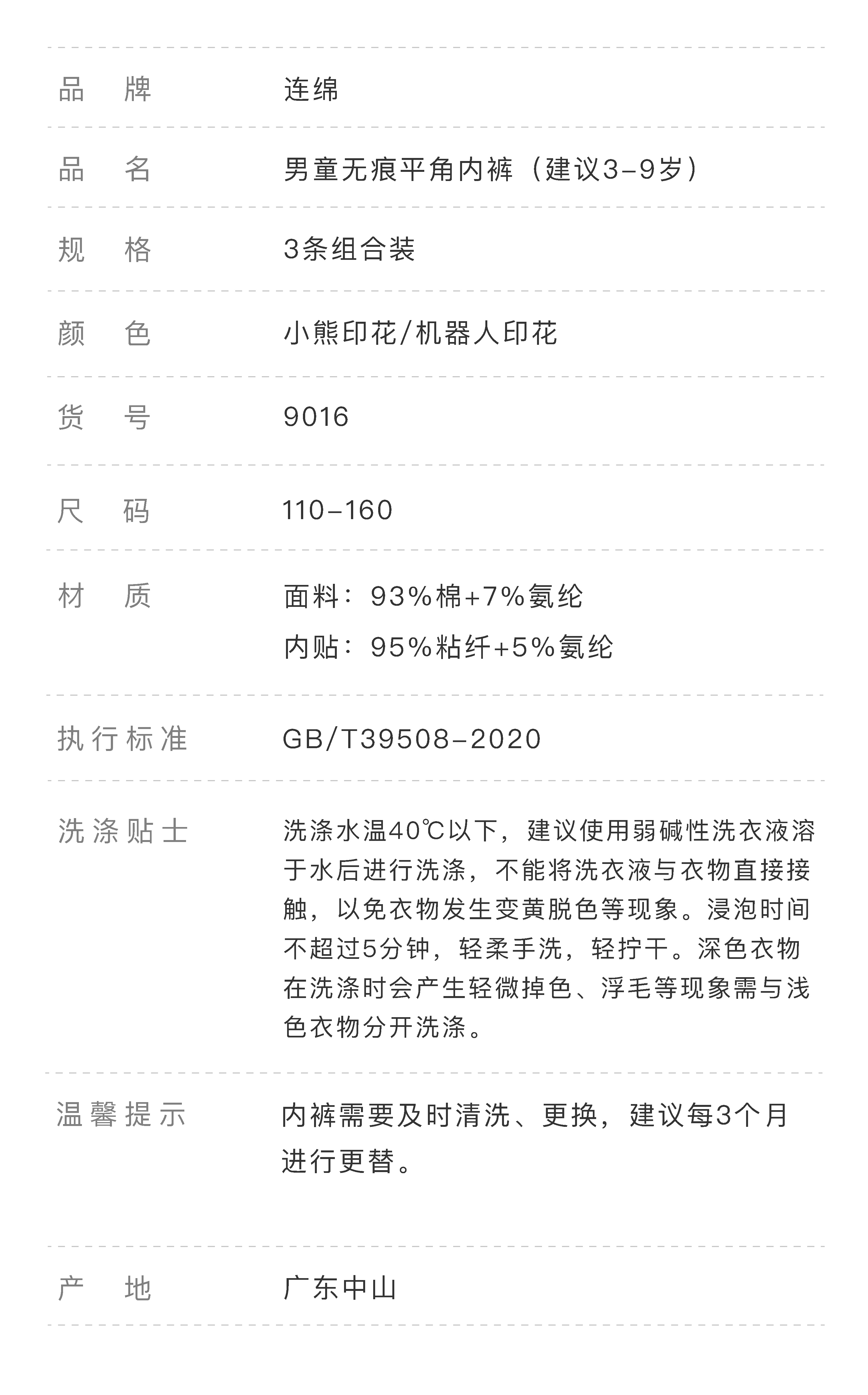 连绵· 男童舒棉无痕平角内裤 3条装(3-9岁)