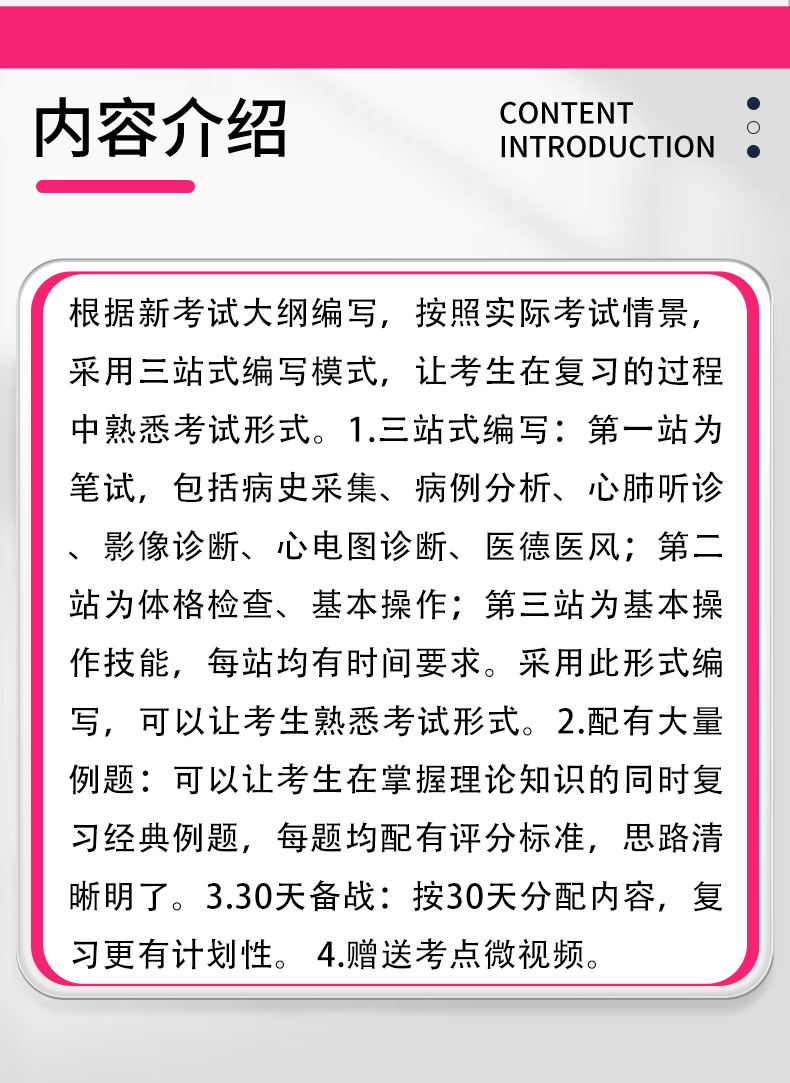 根据新考试大纲编写,按照实际考试情景,采用三站式编写模式,让考生在复习的过程中熟悉考试形式。 1.三站式编写:第一站为笔试,包括病史采集、病例分析、心肺听诊、影像诊断、心电图诊断、医德医风;第二站为体格检查、基本操作;第三站为基本操作技能,每站均有时间要求。采用此形式编写,可以让考生熟悉考试形式。 2.配有大量例题:可以让考生在掌握理论知识的同时复习经典例题,每题均配有评分标准,思路清晰明了。 3.30天备战:按30天分配内容,复习更有计划性。 4.赠送考点微视频。