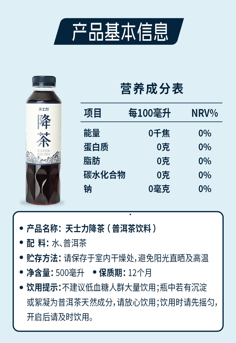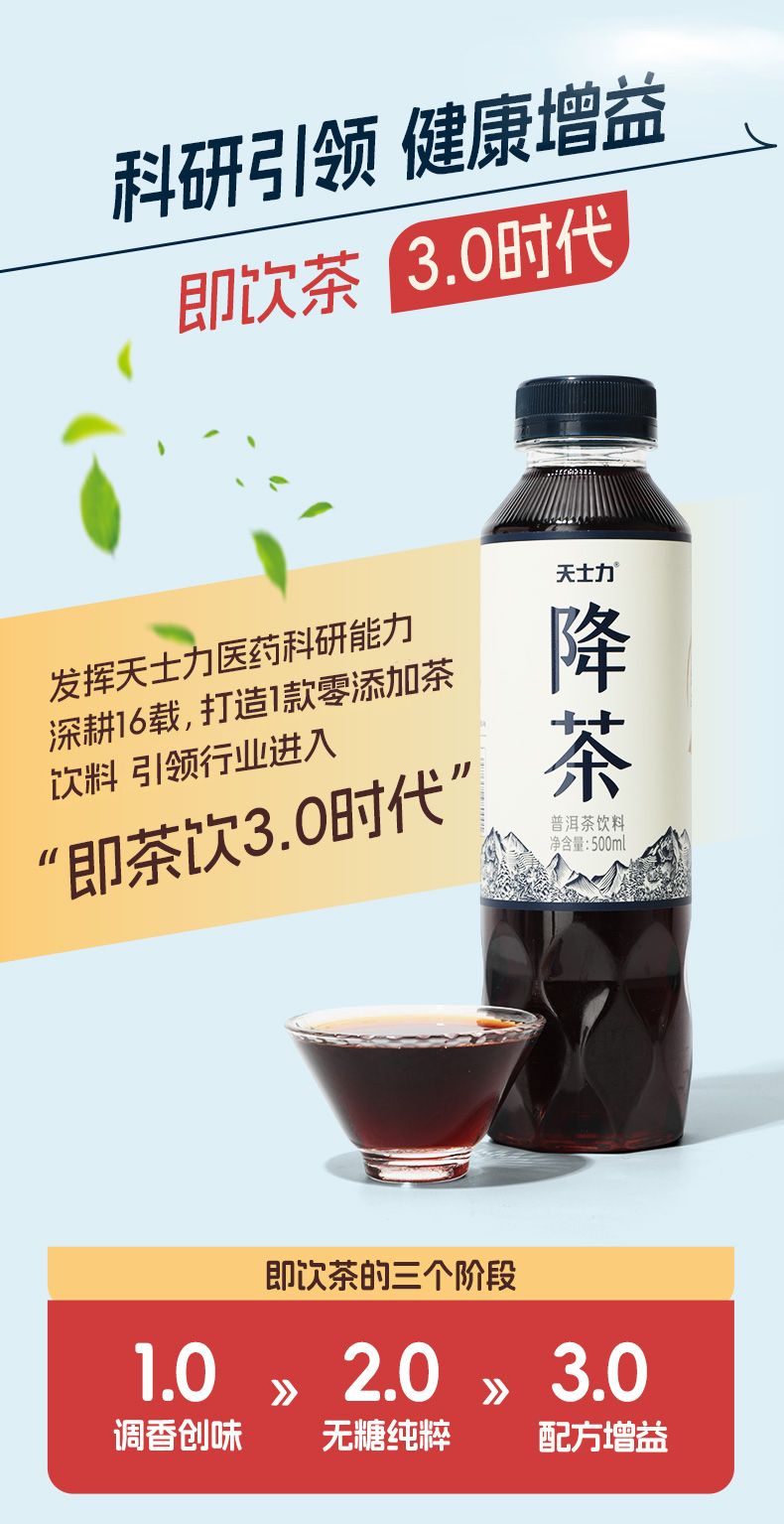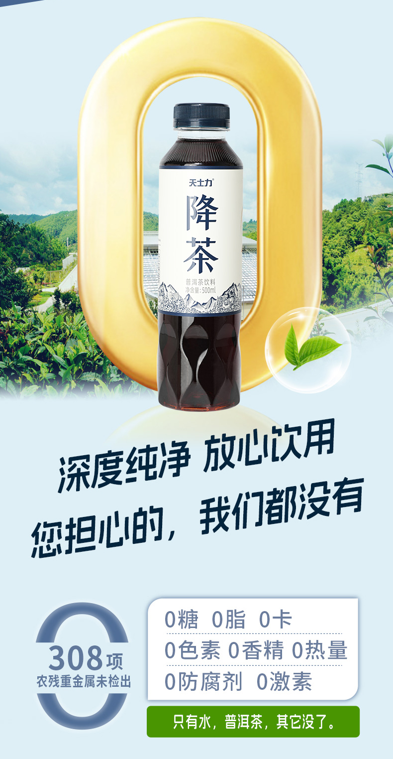 天士力降茶 普洱茶饮料500ml/瓶*15瓶/箱 0糖0脂0卡