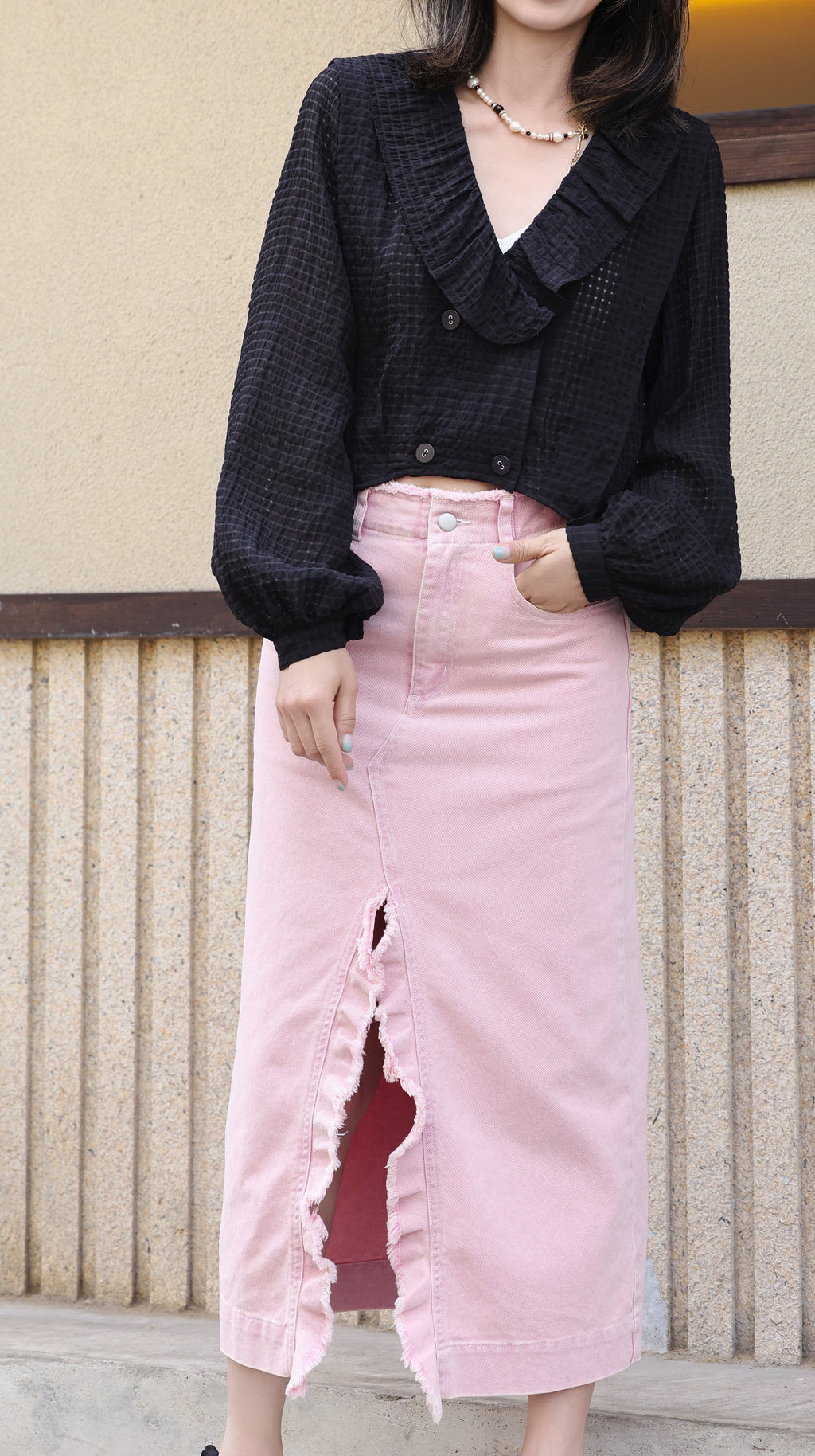 TYNVIE 荷叶边领子气球袖裹身短款衬衫-黑色格纹