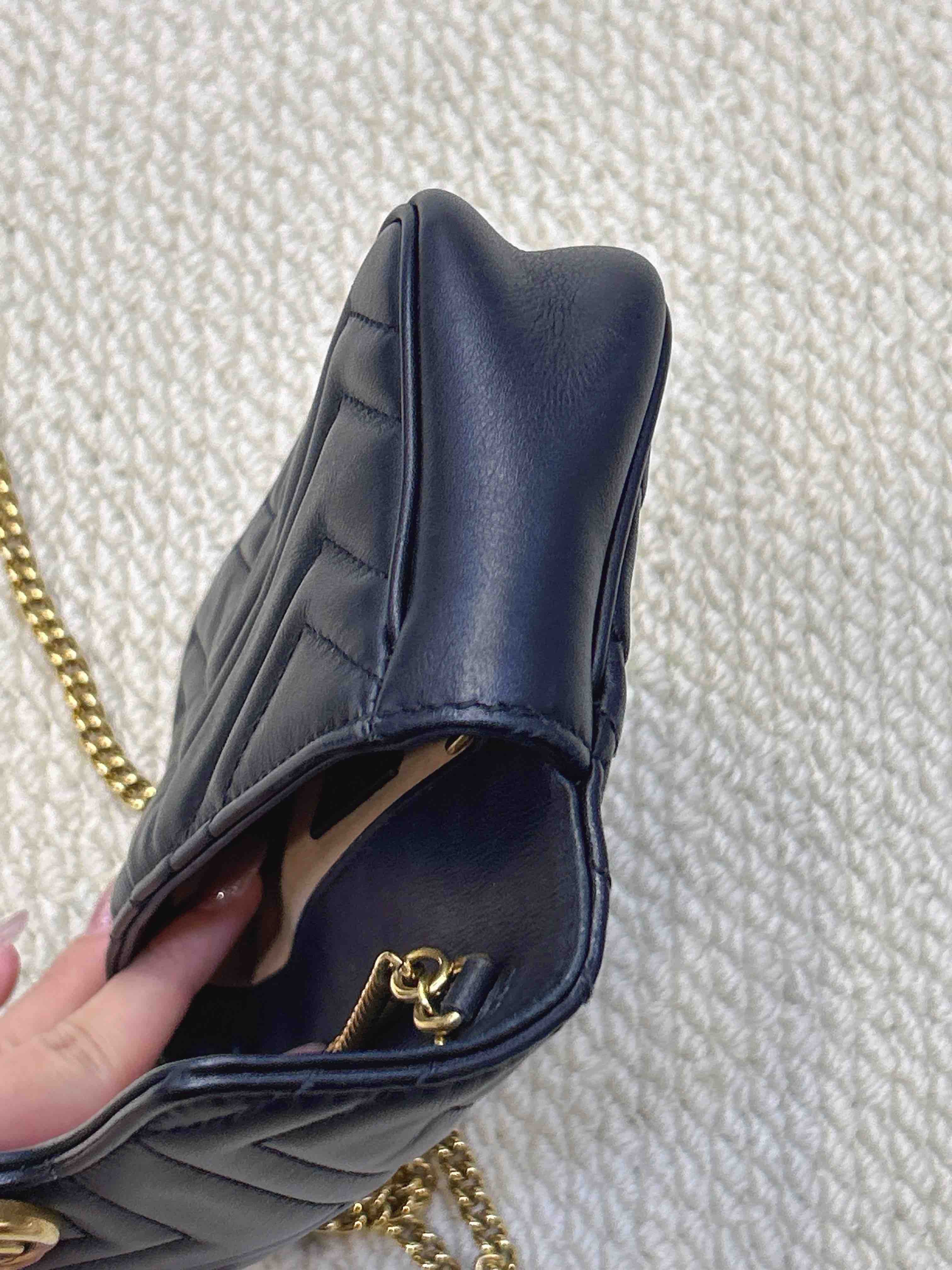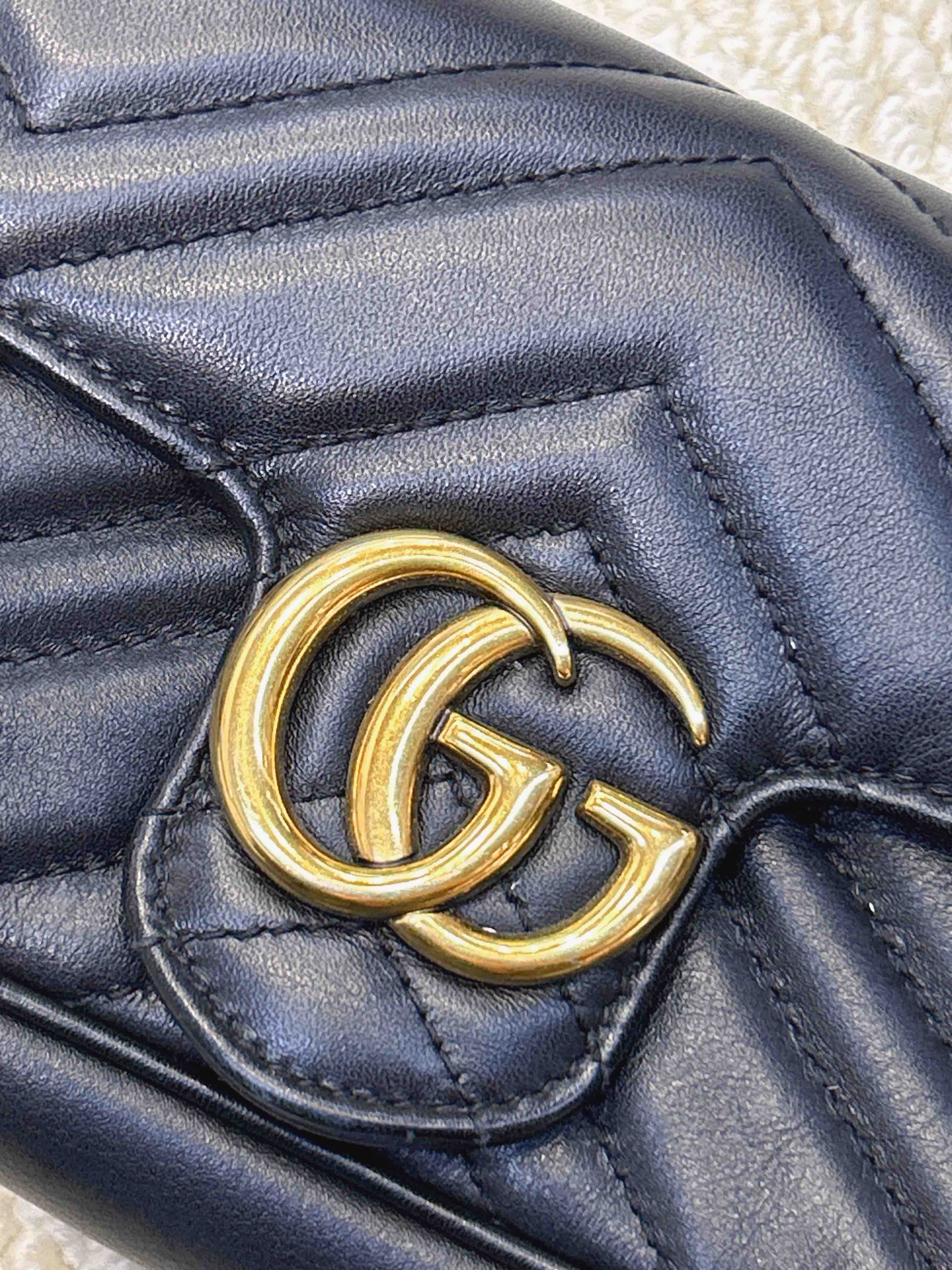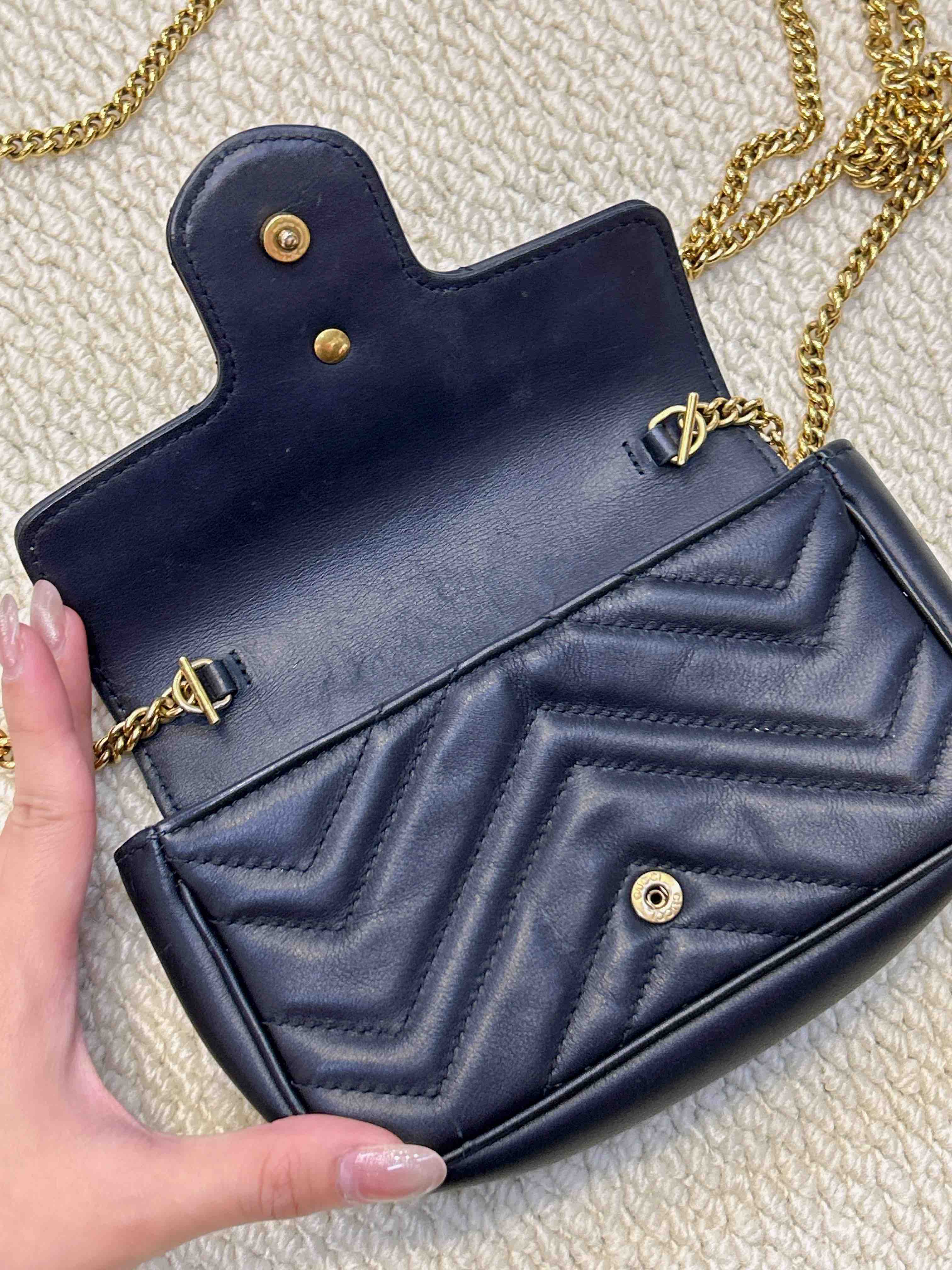 【商品详情】正品二手 Gucci mini 黑金 牛皮 双g 马蒙 斜挎包🥝 97新 17x9 缺钥匙扣 底边有一处微微使用磨损感绝 内翻盖轻微使用感 经典百搭