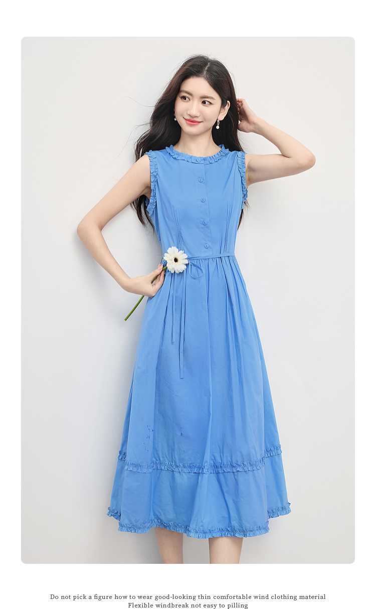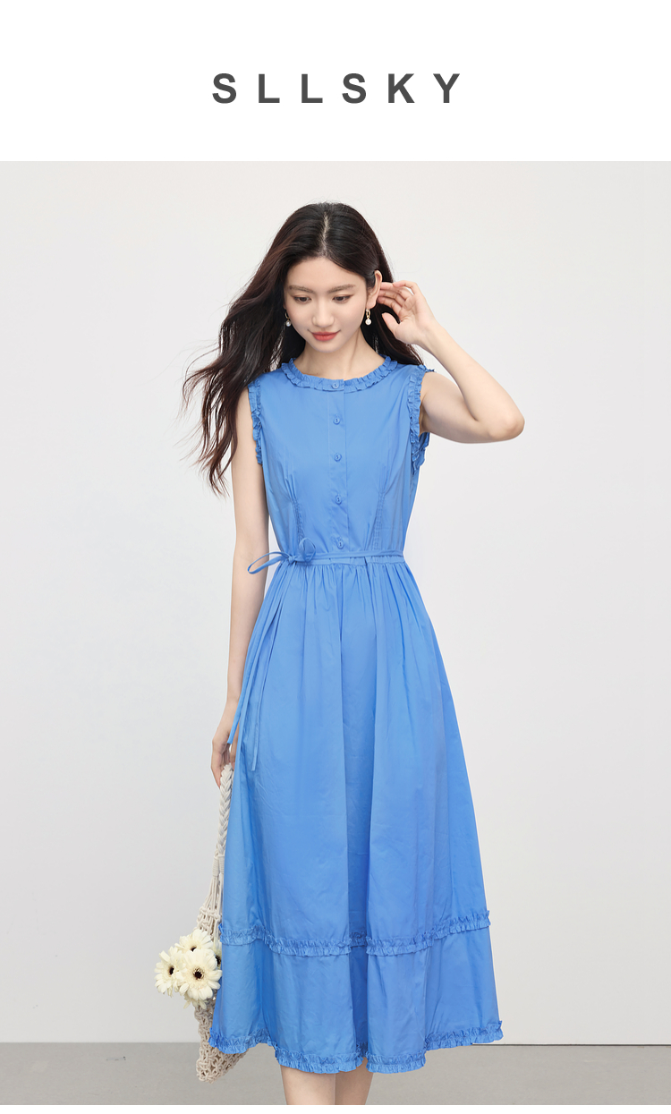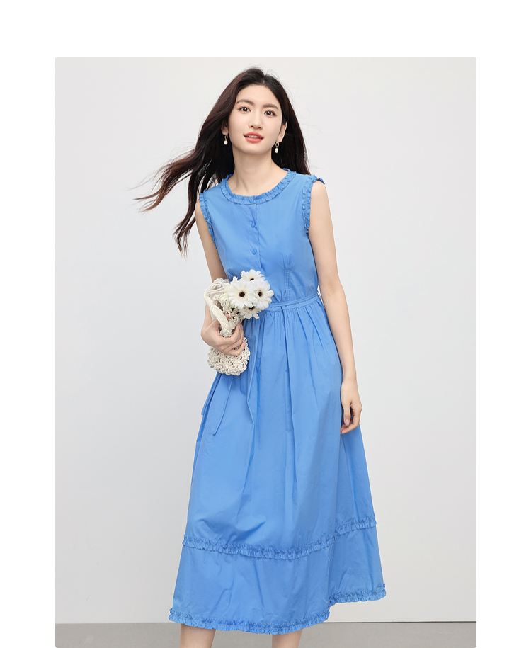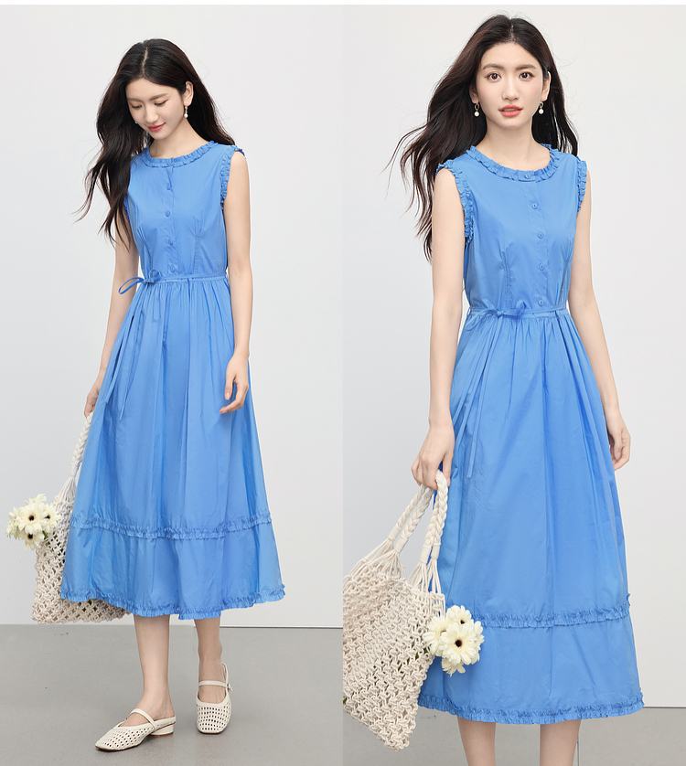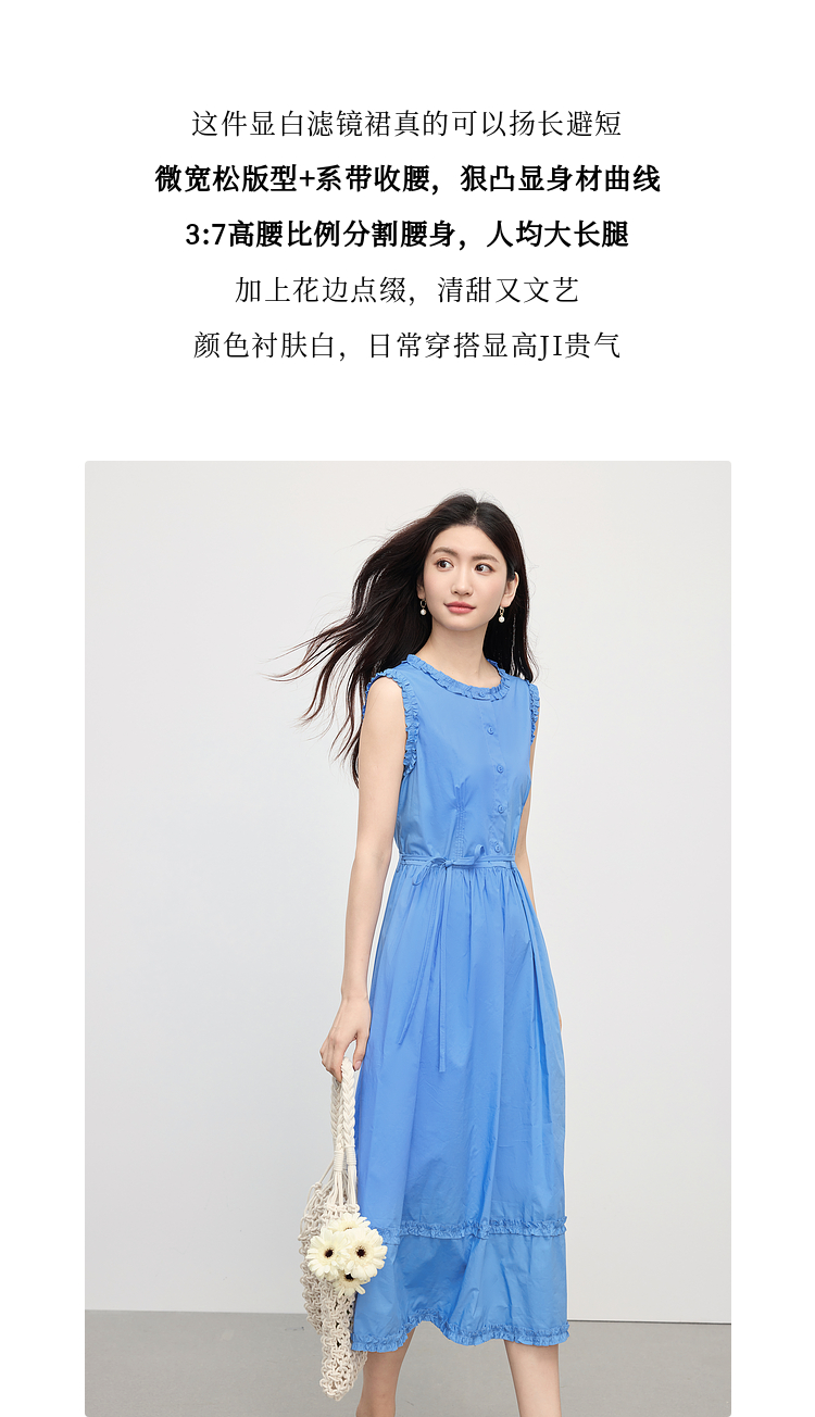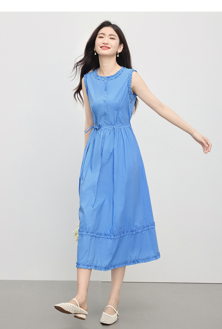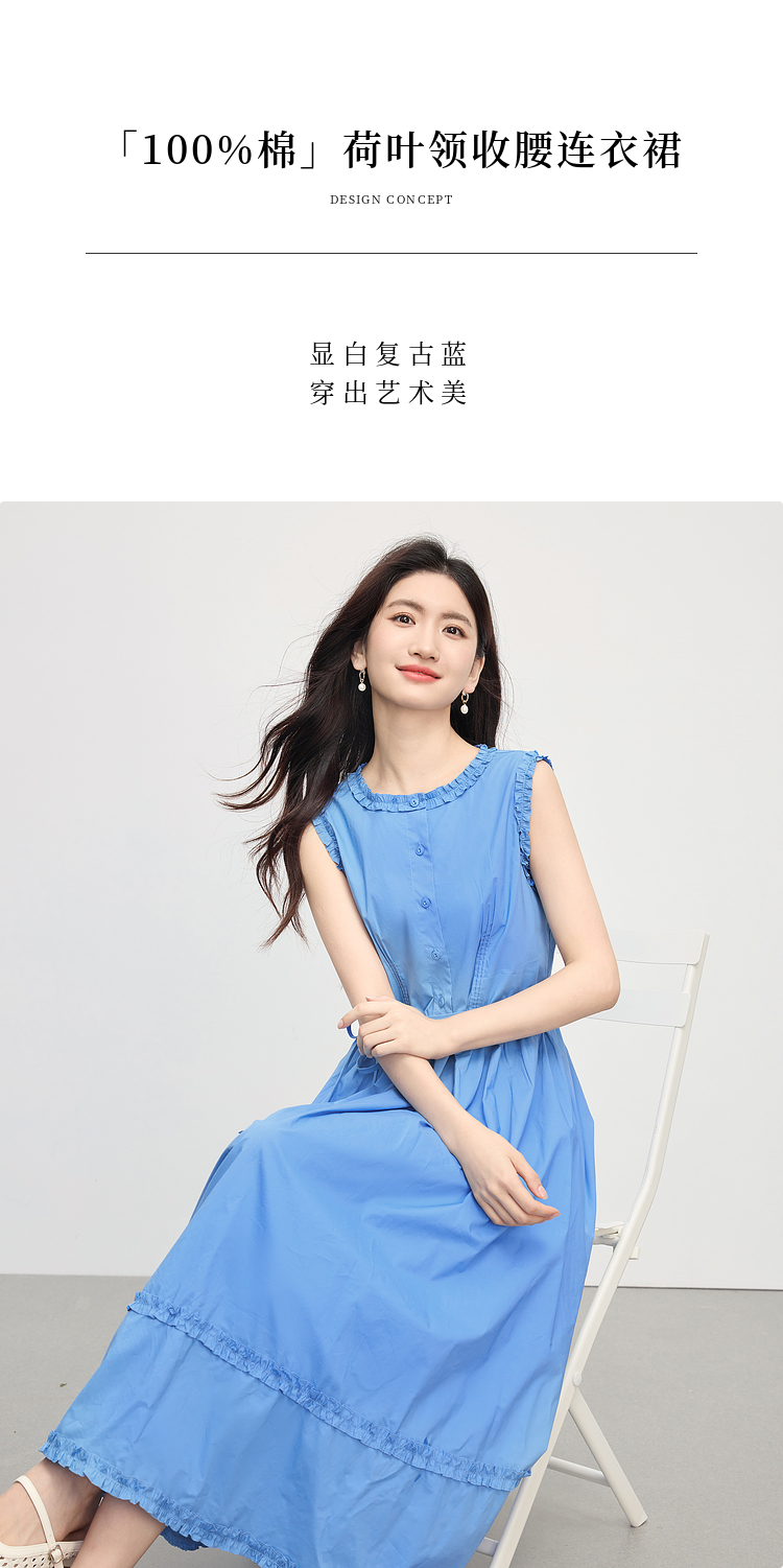 【07/16新品】熙世界100%棉蓝色连衣裙女2025夏季新款木耳边圆领系带收腰背心裙