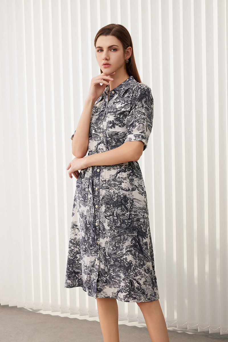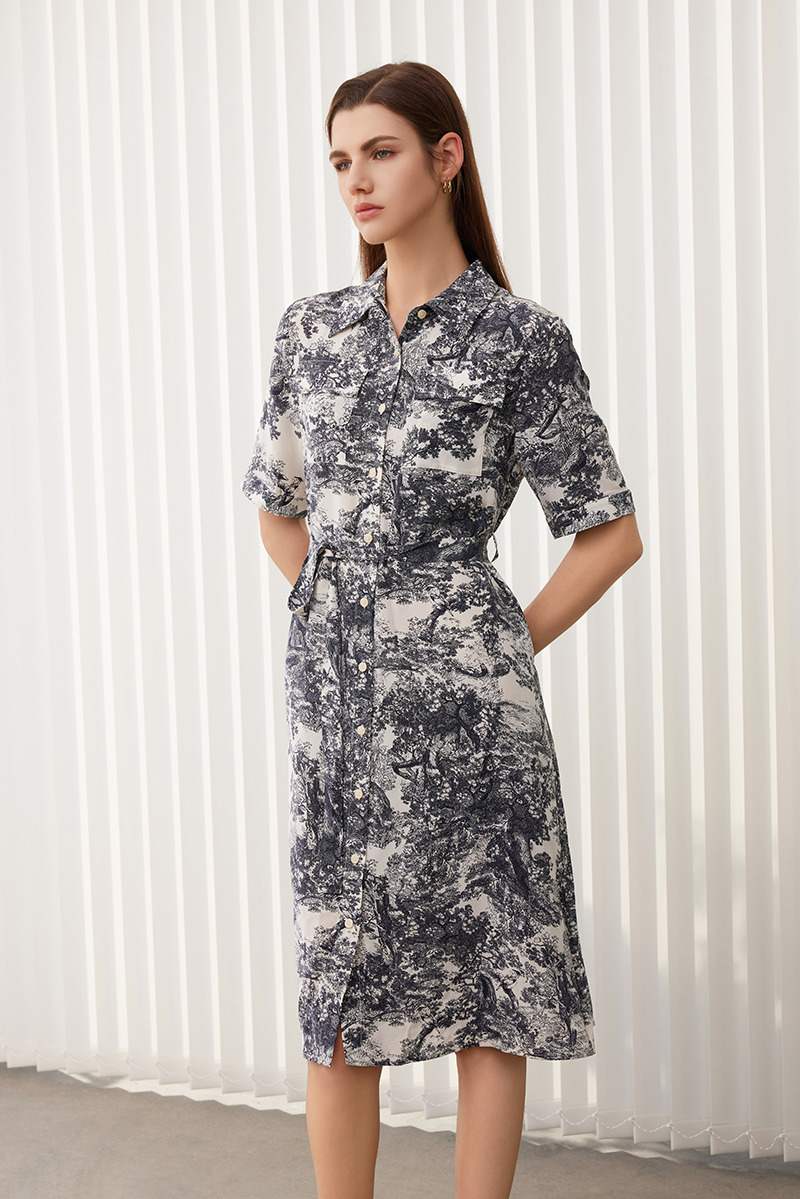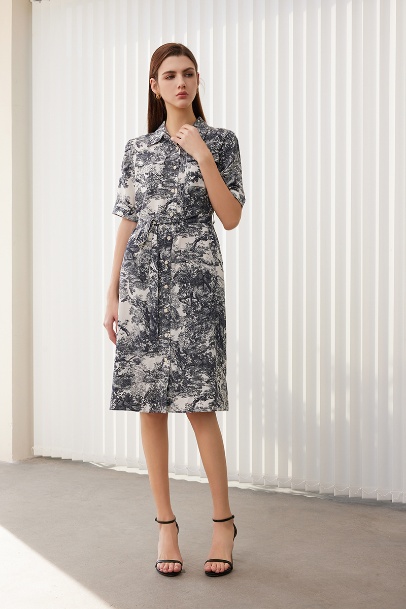 【水墨印花真丝连衣裙】24年春夏新品女士100%桑蚕丝系带收腰衬衫款裙子