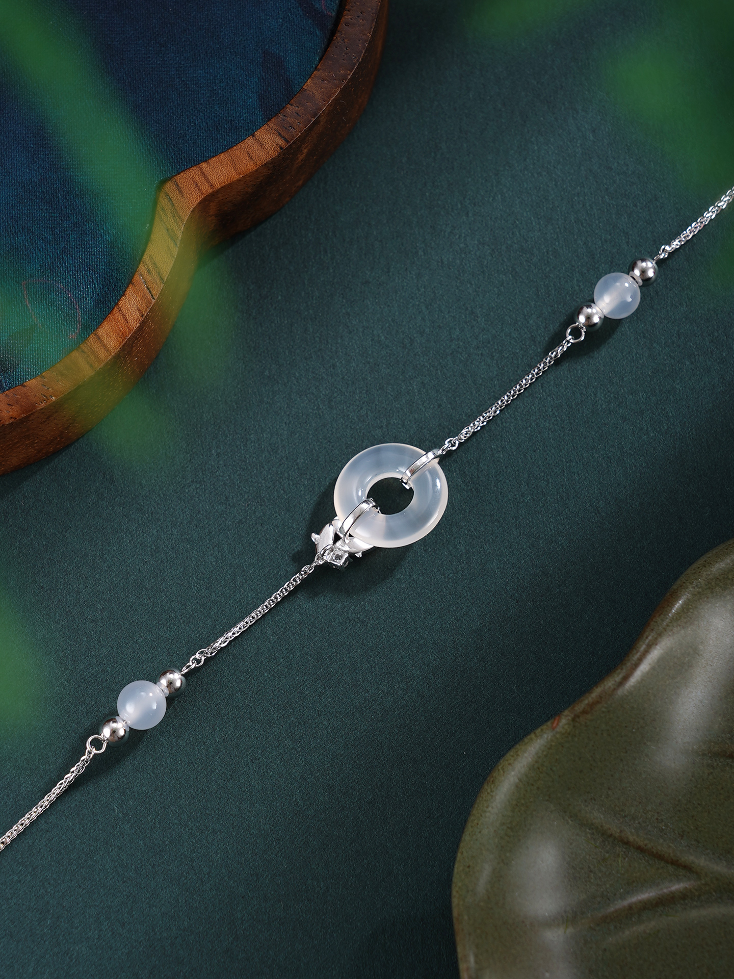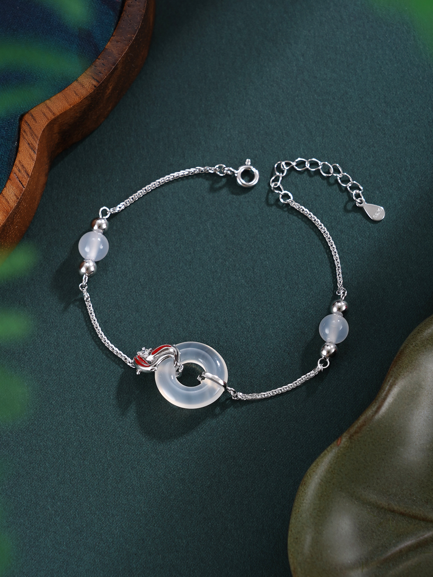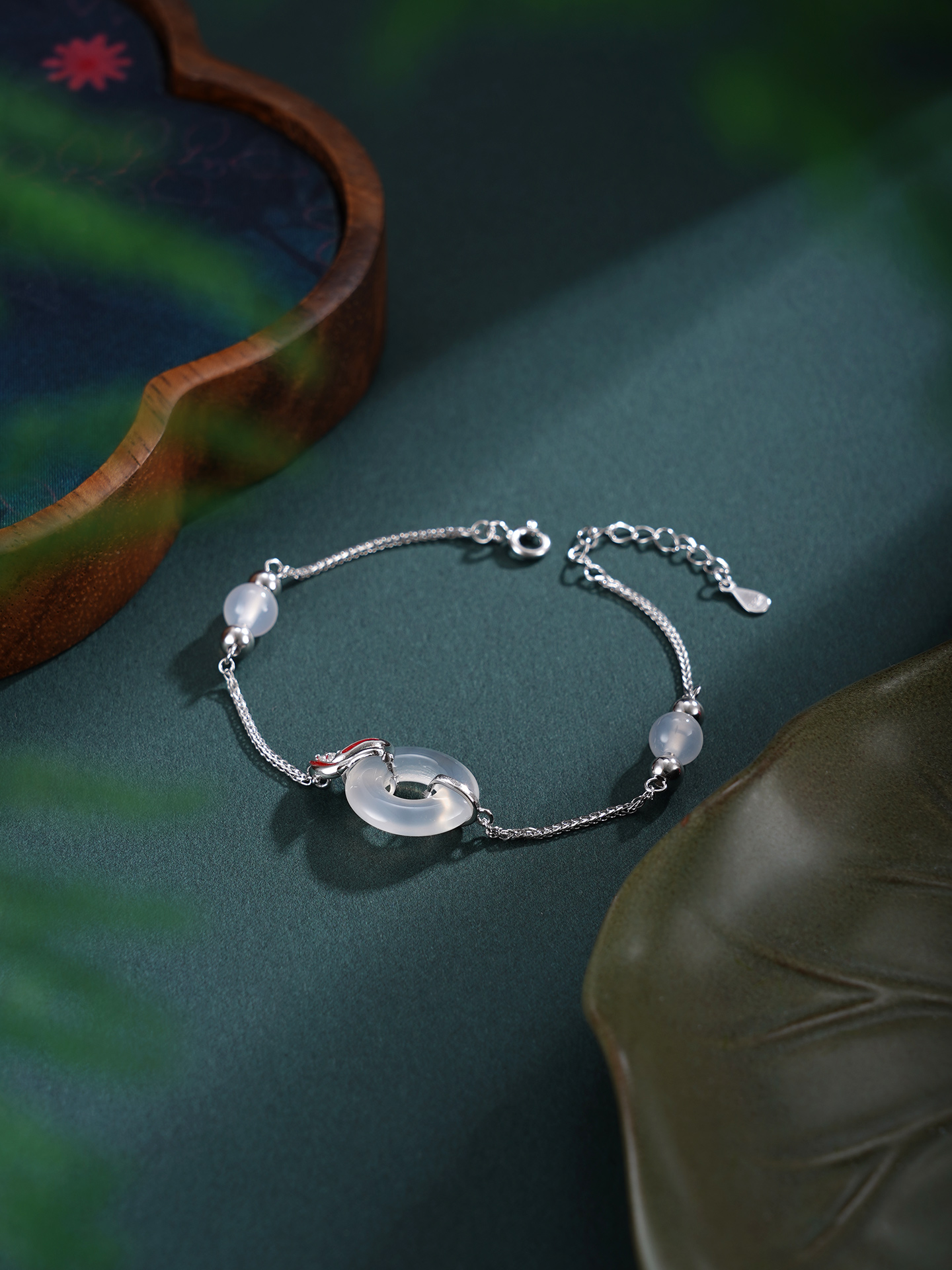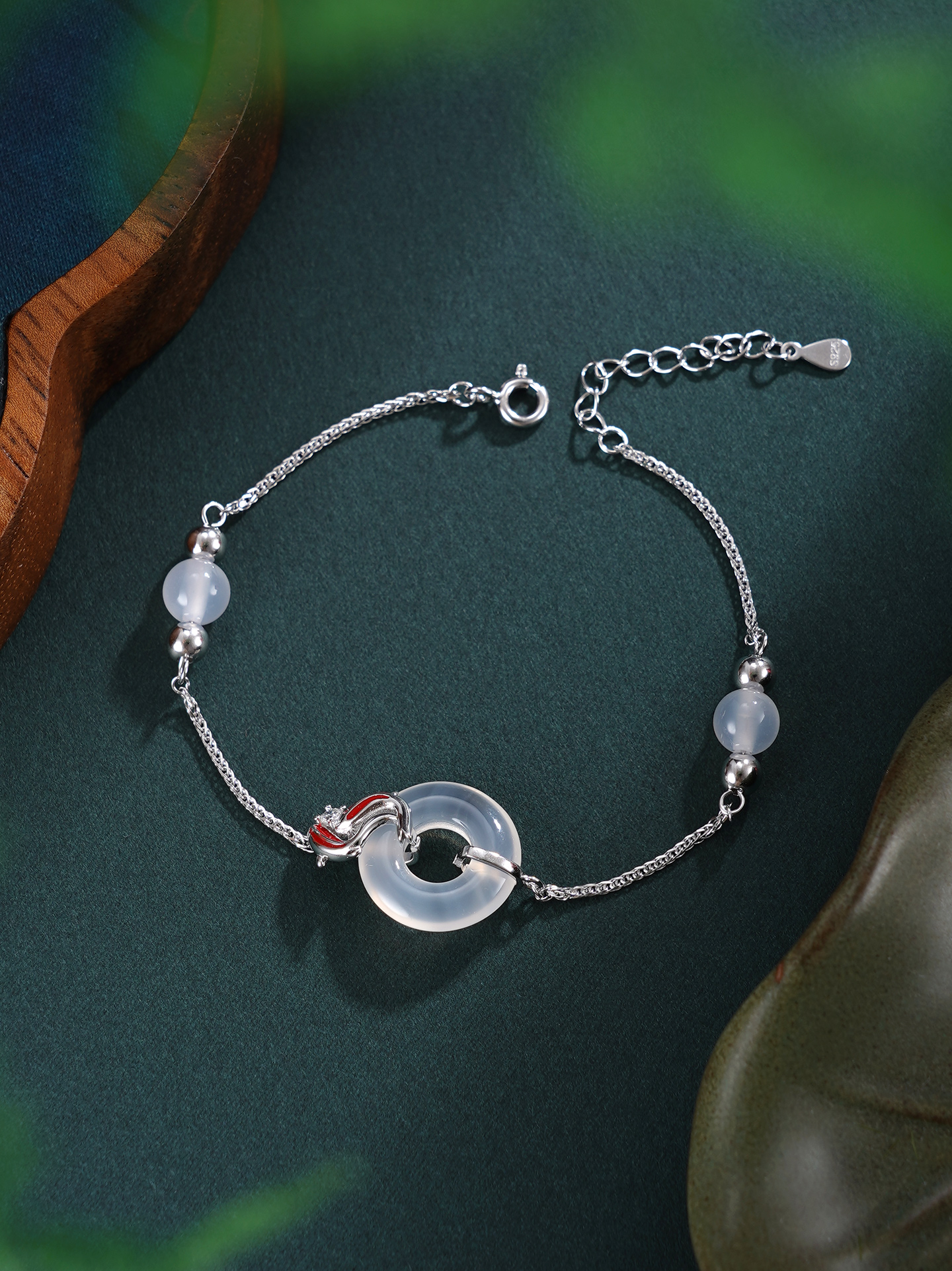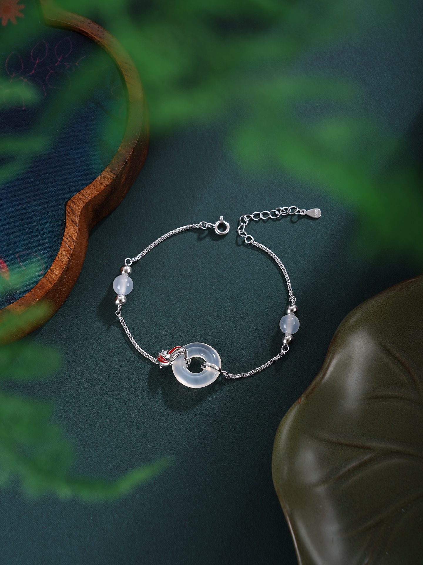 【寓意】:手链设计巧妙,锦鲤缠绕平安扣,灵趣巧妙,富有深意。寓意扣住平安,迎接幸运。