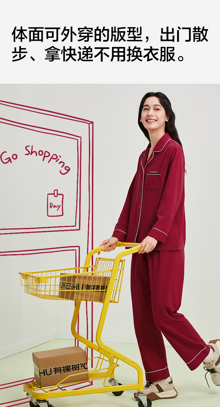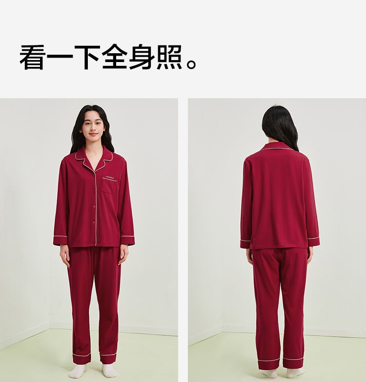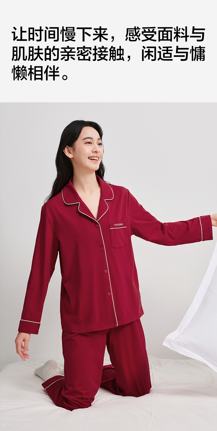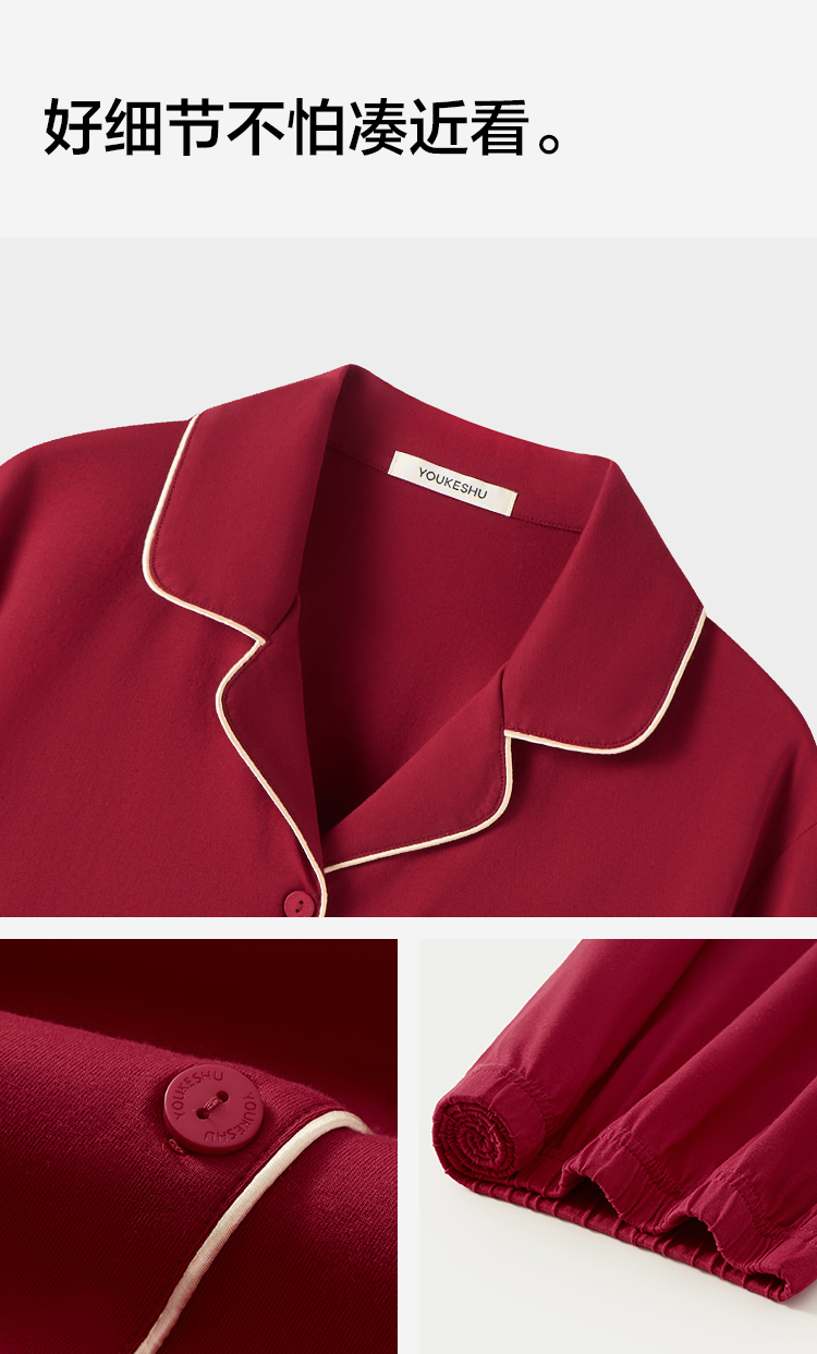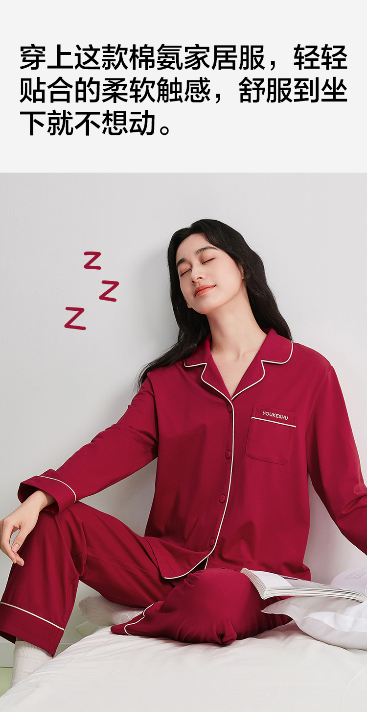 【有棵树】女士长袖开衫家居服女红本命睡衣套装(95%棉 5%氨纶)