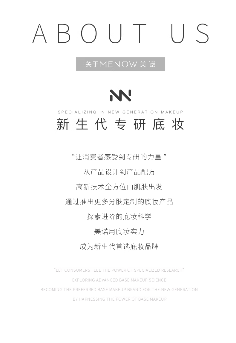 - 全球性彩妆品牌,专注开发高品质的适用性美妆产品。拥有20多年美妆经验,产品远销欧美等80多个国家。美诺彩妆致力于给用户带来“爱与美,年轻,不一样的品质彩妆体验”。