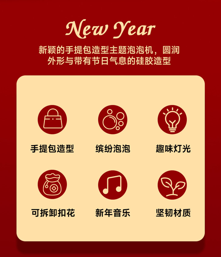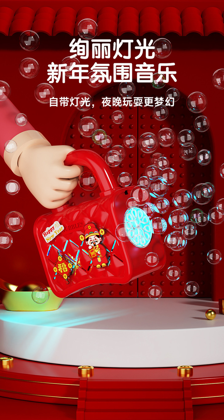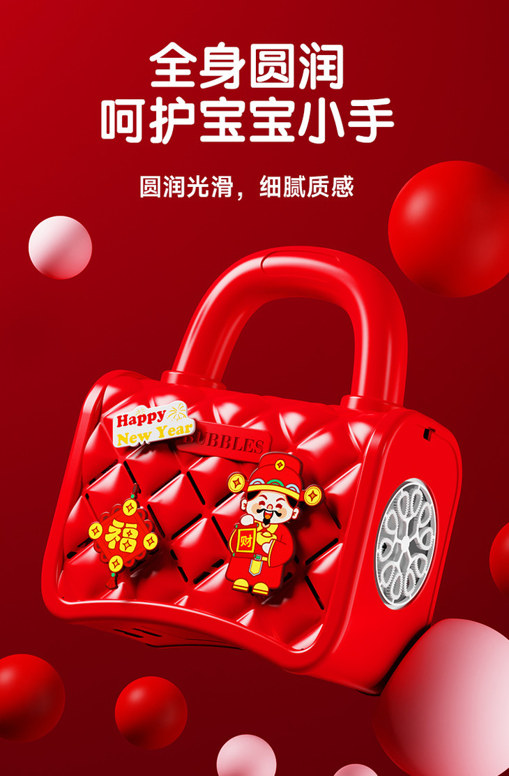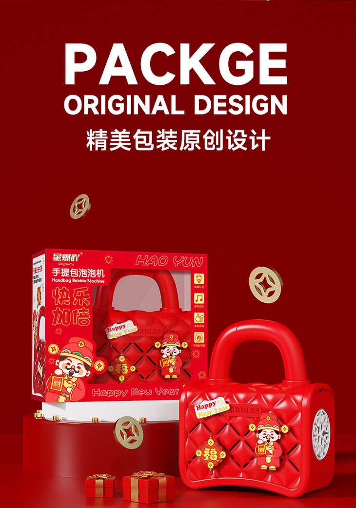 🎀过年啦过年啦,红红火火过新年!! 设计师脑洞大开,🎁手提包式设计,造型新颖独特且方便携带 🪄这个新年快乐加倍,不开心是因为买的不够,一个不够就再买一个 新年一起手提泡泡🎊玩出七彩人生~~ 精致的外观还可作为时尚的新年配饰,为出行增添一抹亮丽色彩 🧧路上手提摆件,广场开启泡泡派对,这种感觉太美妙了