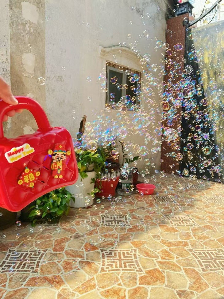💎作为新年礼物,设计精美彩盒包装,送礼自用皆宜,💴29.9元就能买到精美礼盒包装手提包泡泡机 即无送礼经济负担🔮又送到小朋友心坎上礼物,这比红包更夺得小朋友欢心 🎁🎁整机采用环保无毒的材料制作,泡泡液也经过严格检测,对儿童皮肤无刺激 机身结构稳固,无尖锐边角🧸有效避免玩耍过程中可能造成的意外伤害, 给孩子们打造一个安全无🛎忧的新年娱乐环境,也为新年的场景增添了一份童话般的浪漫与奇幻