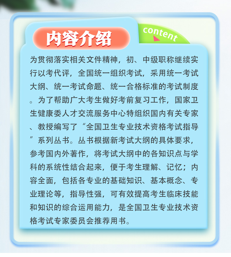 为贯彻落实相关文件精神,初、中级职称继续实行以考代评,全国统一组织考试,采用统一考试大纲、统一考试命题、统一合格标准的考试制度。为了帮助广大考生做好考前复习工作,国家卫生健康委人才交流服务中心特组织国内有关专家、教授编写了“全国卫生专业技术资格考试指导”系列丛书。丛书根据新考试大纲的具体要求,参考国内外著作,将考试大纲中的各知识点与学科的系统性结合起来,便于考生理解、记忆;内容全面,包括各专业的基础知识、基本概念、专业理论等,指导性强,可有效提高考生临床技能和知识的综合运用能力,是全国卫生专业技术资格考试专家委员会推荐用书。