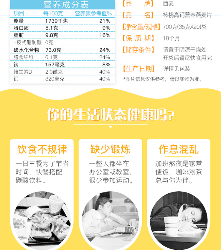 核桃高钙燕麦片700g高钙+高纤+维生素D改善饮食不规律加班熬夜营养补给