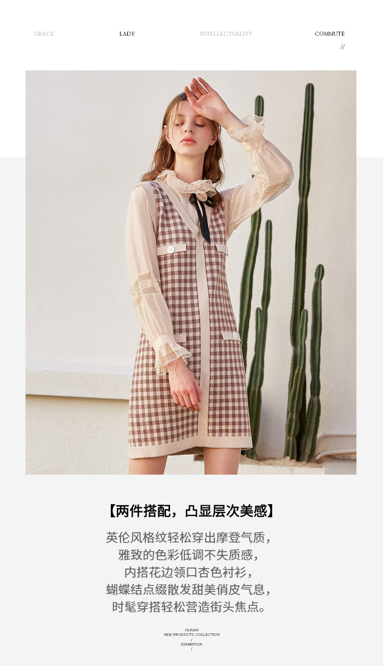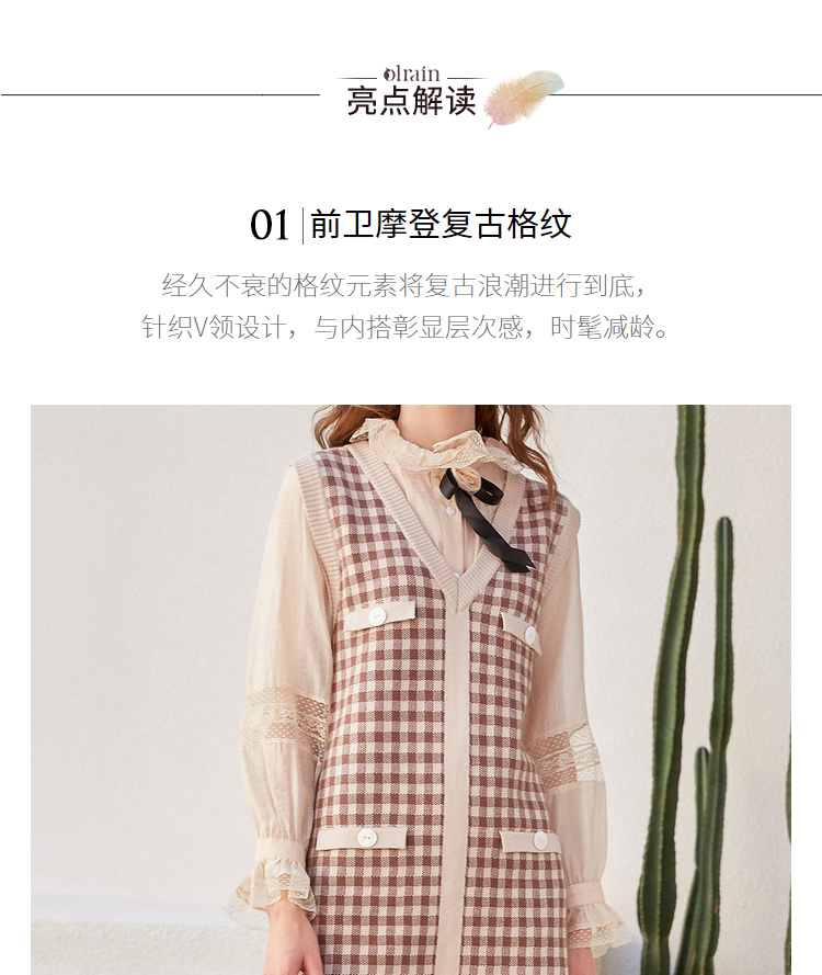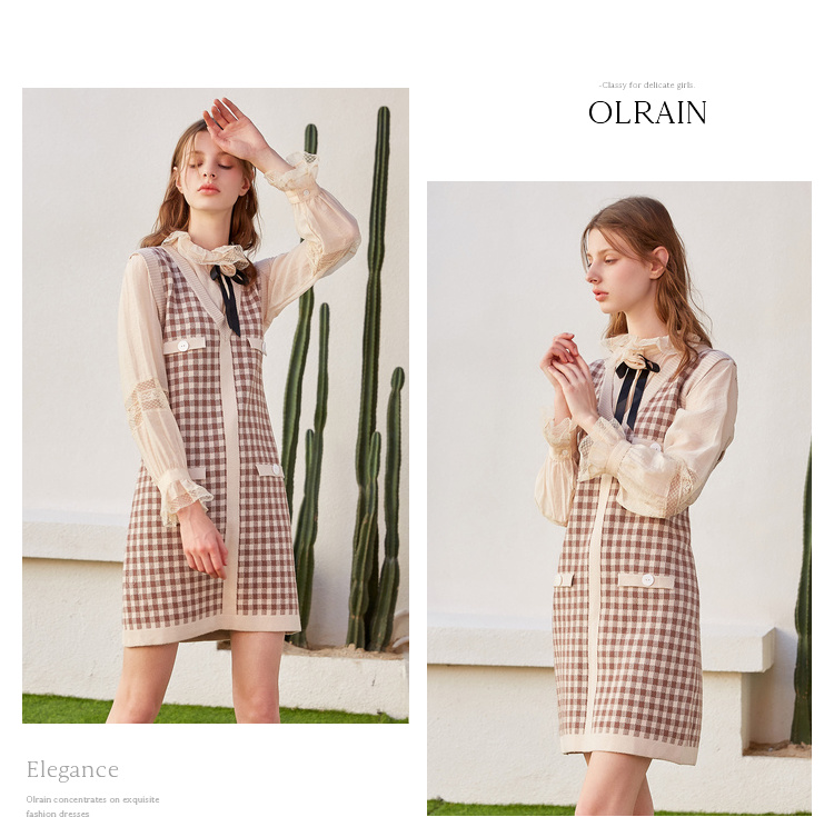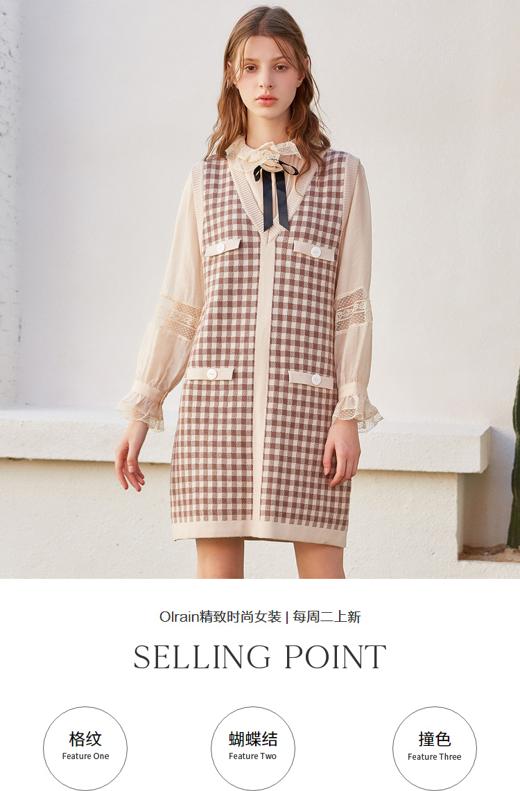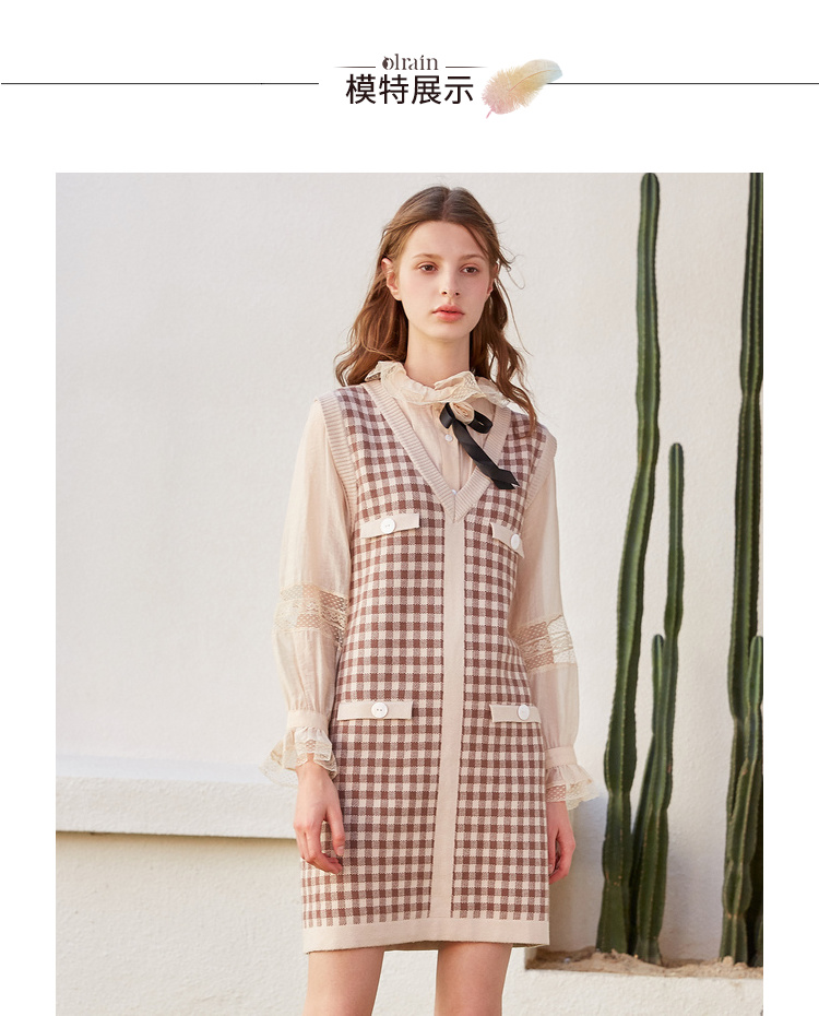 欧芮儿 春装女2020新款女装格子针织连衣裙女裙子