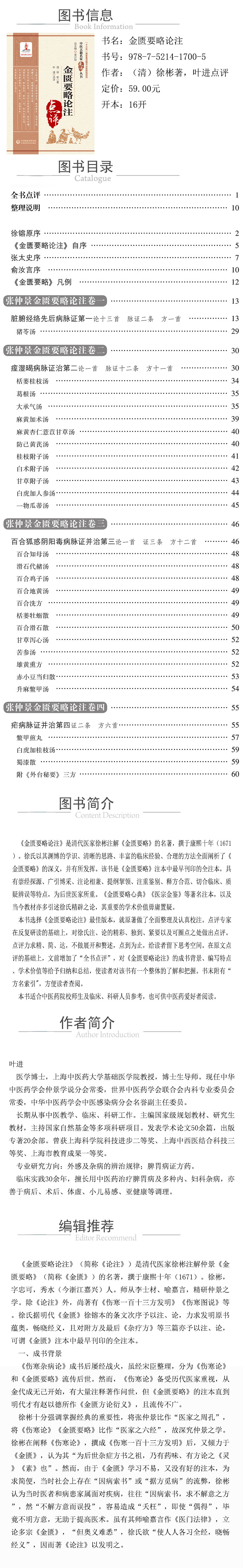 《金匮要略论注》是清代医家徐彬注解《金匮要略》的名著,撰于康熙十年(1671)。徐氏以其渊博的学识、清晰的思路、丰富的临床经验、合理的方法全面阐析了《金匮要略》的深义,并有所发挥。该书是《金匮要略》注本中最早刊印的全注本,具有崇经探源,广引博采,注论相兼,提纲挈领,注重鉴别,释方合范,切合临床,质疑辨误等特点,为后世医家所重。《金匮要略心典》《医宗金鉴》等有名注本乃至当今教材亦多引述徐氏的精辟之论,其重要的学术价值毋庸置疑。本书选择《金匮要略论注》上佳版本,就原著作了全面的整理及认真的校注。点评专家在反复研读的基础上,对徐氏注、论的精彩、独到、紧要以及可商之处作出点评。点评力求精、简、达意,不做展开和赘述,点到为止,给读者留下思考空间。在原文点评的基础上,又对《金匮要略论注》的成书背景、编写特点、学术价值等给予归纳和总结,作出全书点评,使读者对该书有一个整体的了解和把握。本书是中医药院校师......