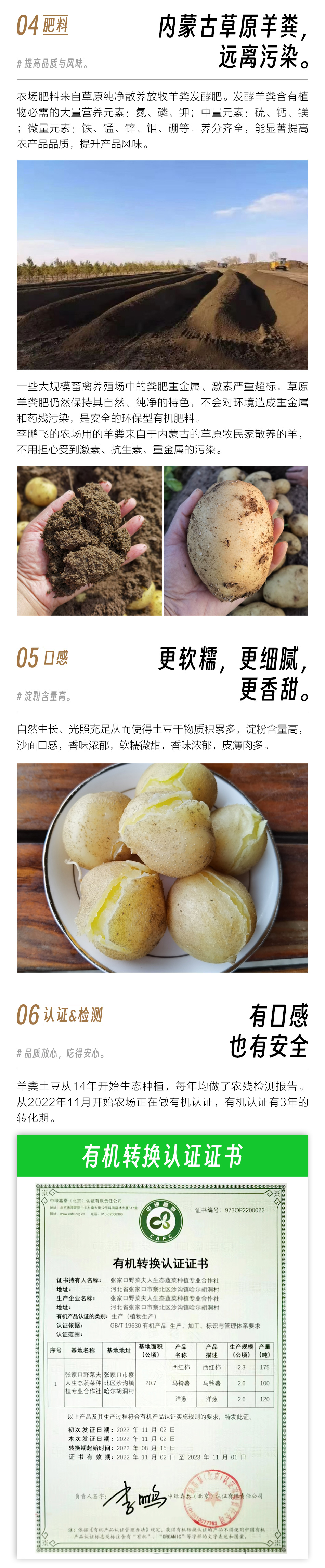 【净重】:2.5kg 【生产者】:李鹏飞 【贮存方式】:阴凉通风处,避光保存 【产地】:河北省张家口市张北县察北管理区 【生产方式】:2006年起采用生态方式生产,露地种植,轮作不同科属农作物,不使用化肥、农药、除草剂和生长激素,人工除草,肥料来源于当地的羊粪堆肥。