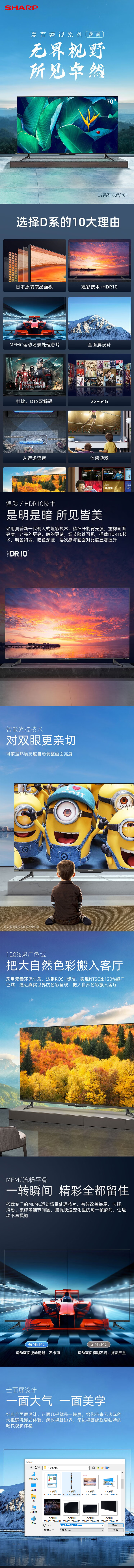 夏普(13433)70D7DA 70英寸 4K超高清 全面屏 智能网络 液晶平板电视机 无线WiFi 投屏 薄款 2+64G内存 70英寸