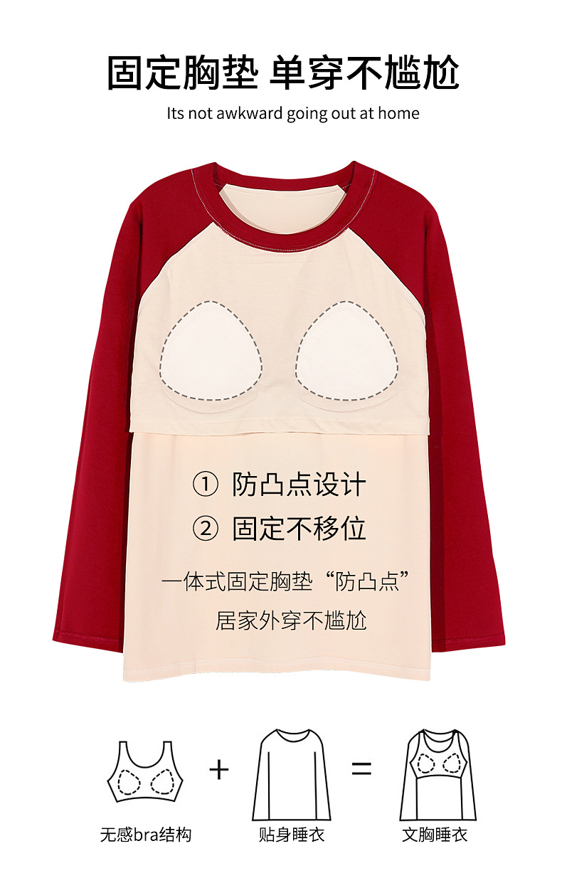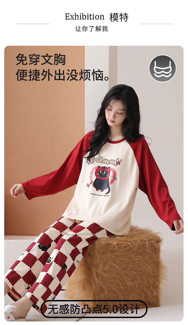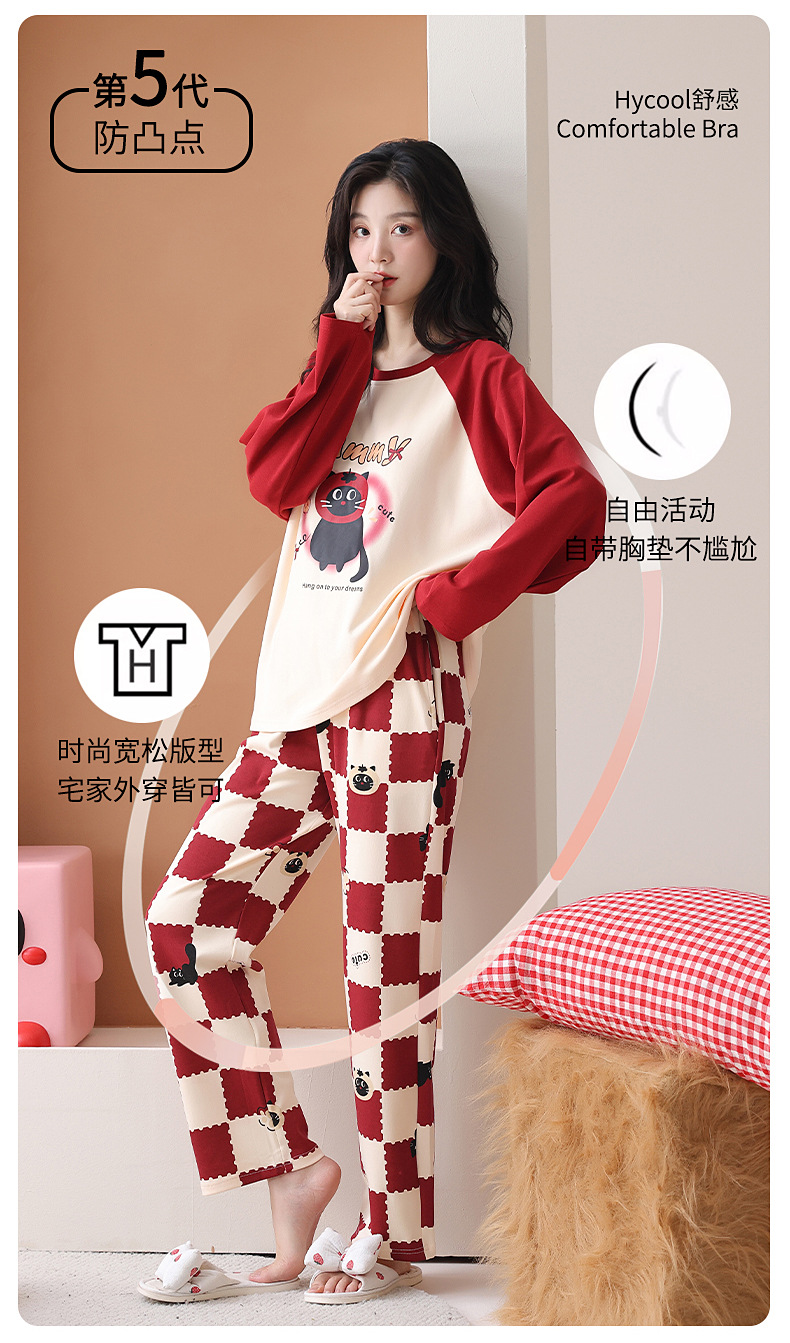 可人儿春秋季带胸垫奥力棉女士长袖长裤睡衣可外出纯棉家居服套装
