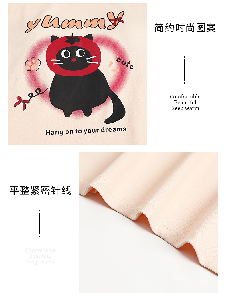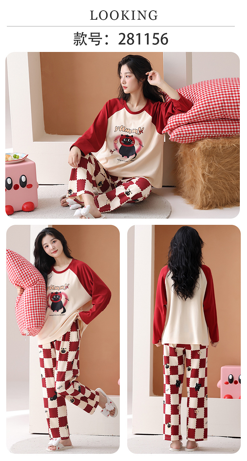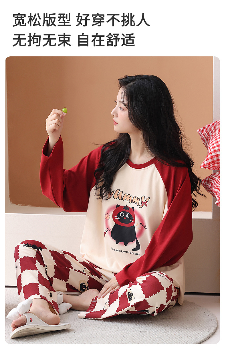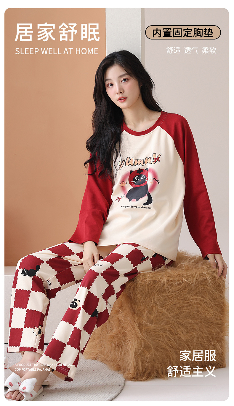 可人儿春秋季纯棉睡衣女士休闲圆领长袖带胸垫少女学生家居服套装