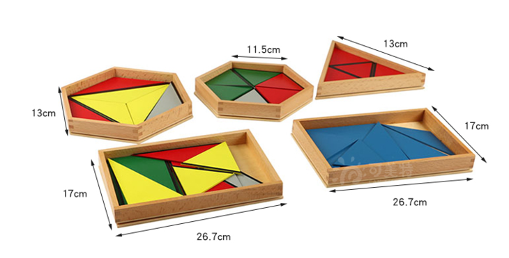 教具构成:5盒三角形(蓝色长方形盒,彩色长方形盒,大六边形盒,小六边形盒,三角形盒)