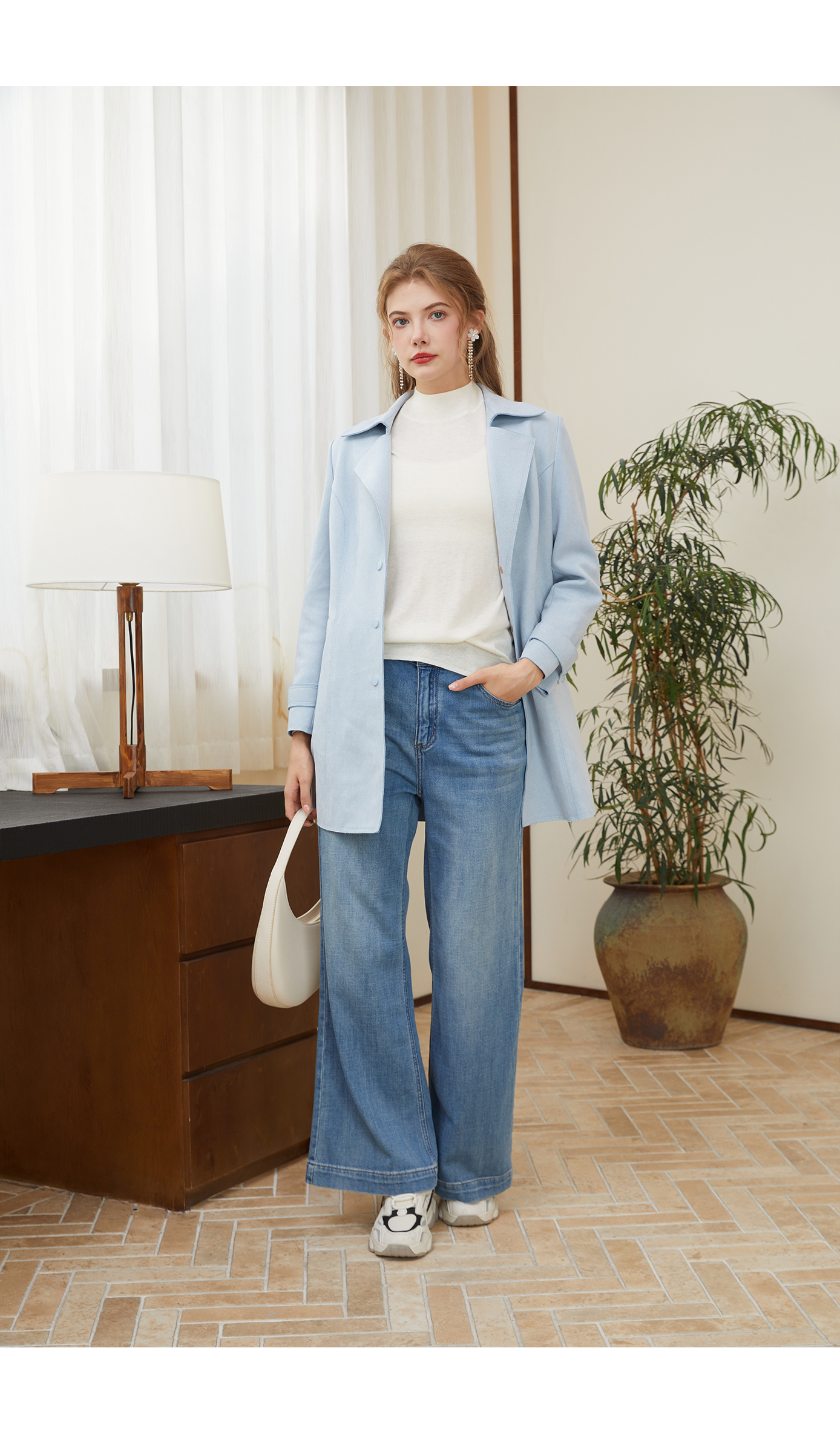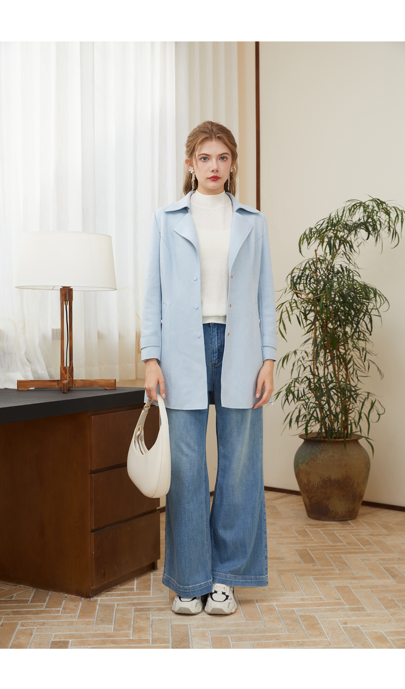 司歌翻领中长款女外套收腰单排扣秋冬R921087X