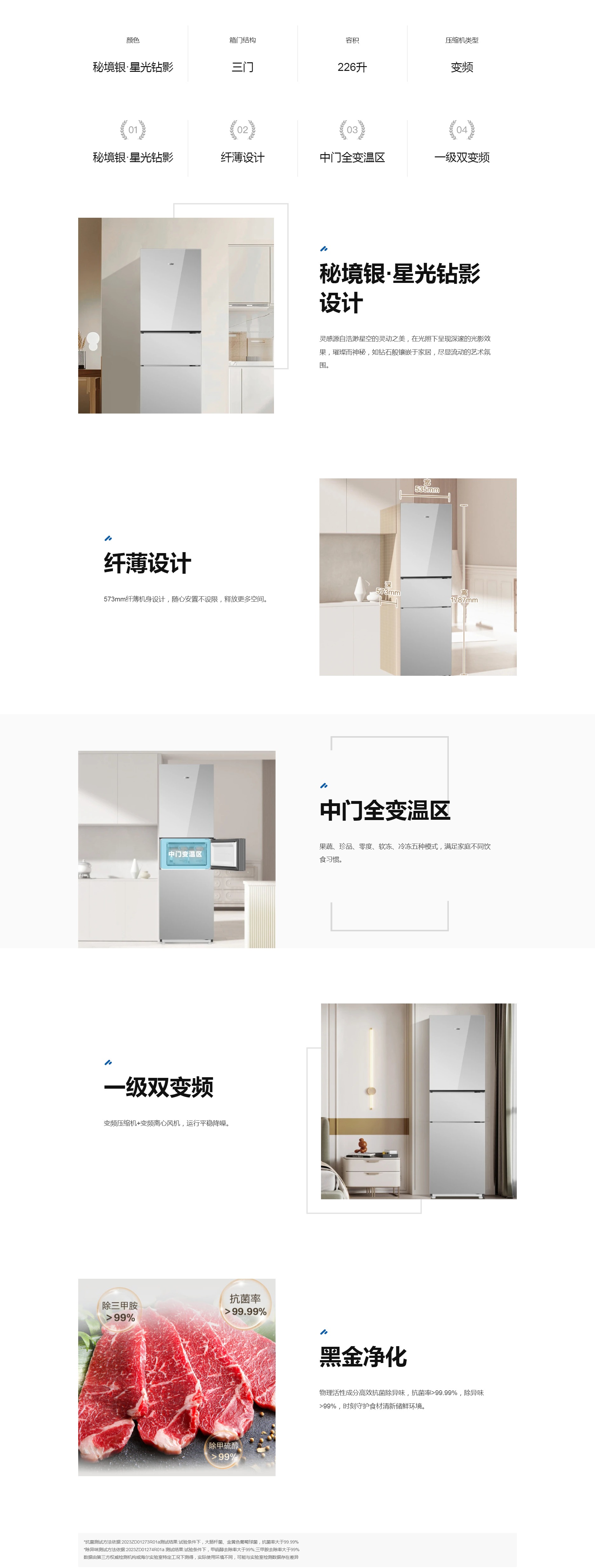 海尔 冰箱 BCD-226WGHC3E9SW 226升 三门 风冷 变频 一级能效 电脑控温 彩晶面板 秘境银·星光钻影
