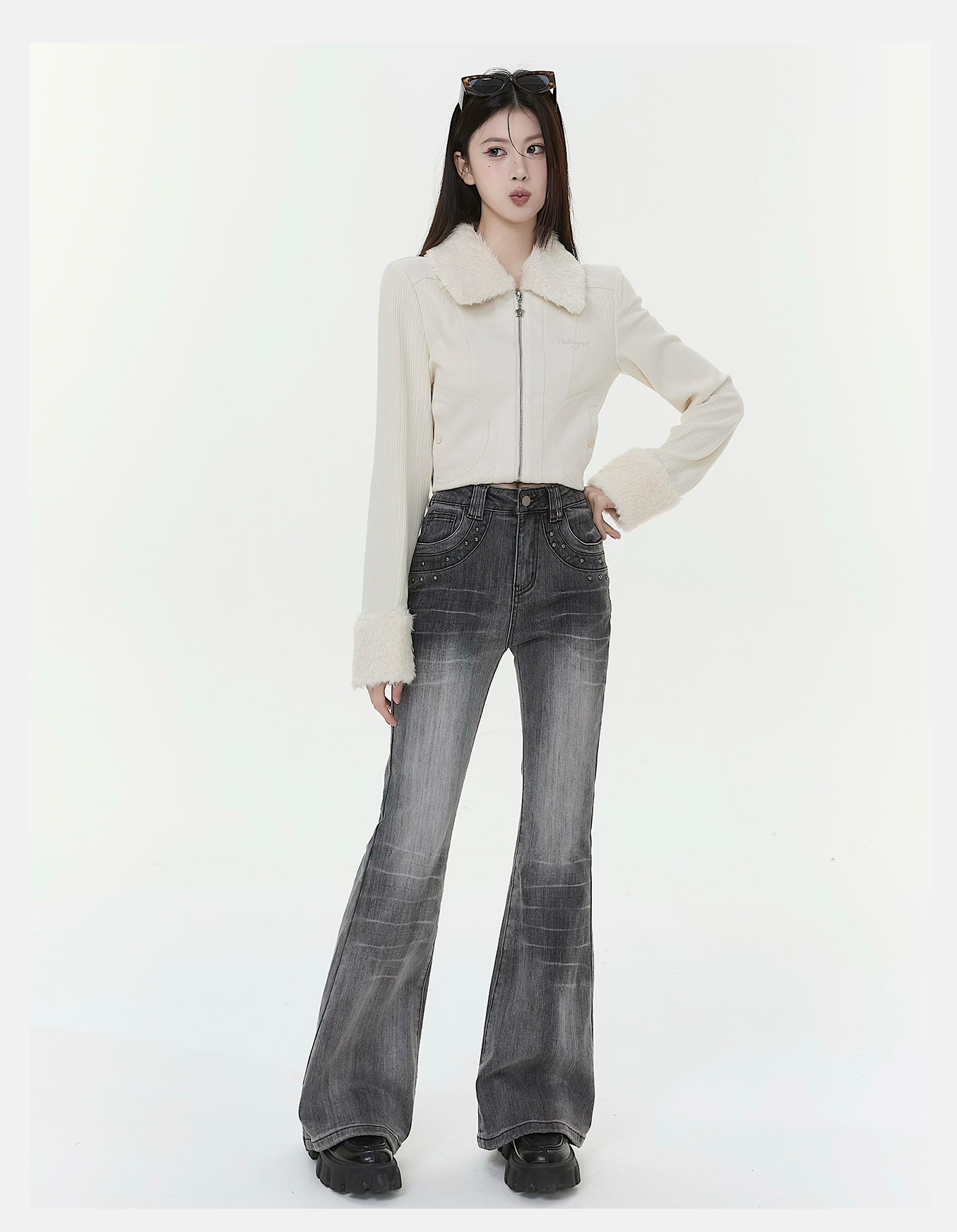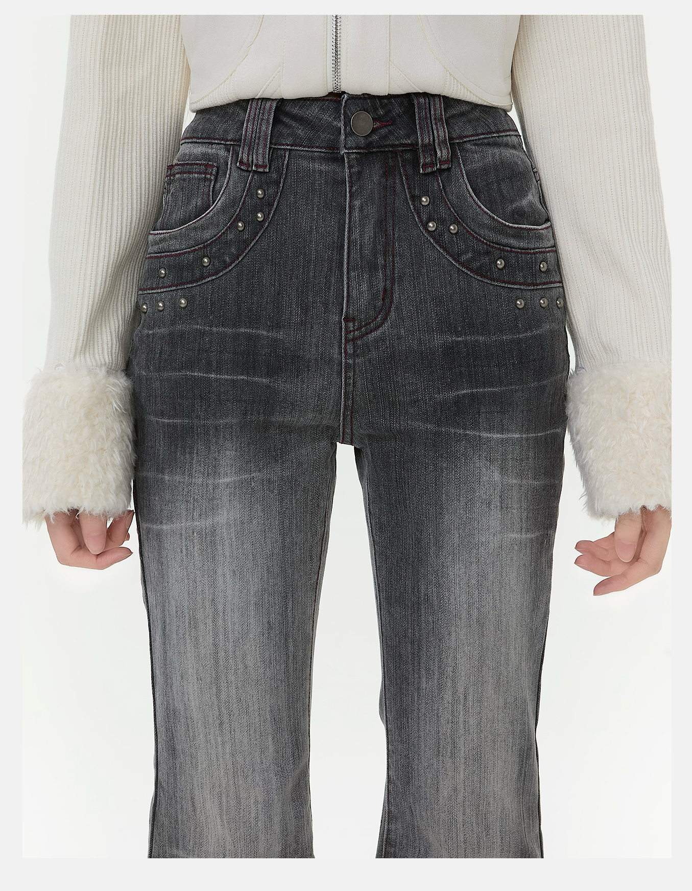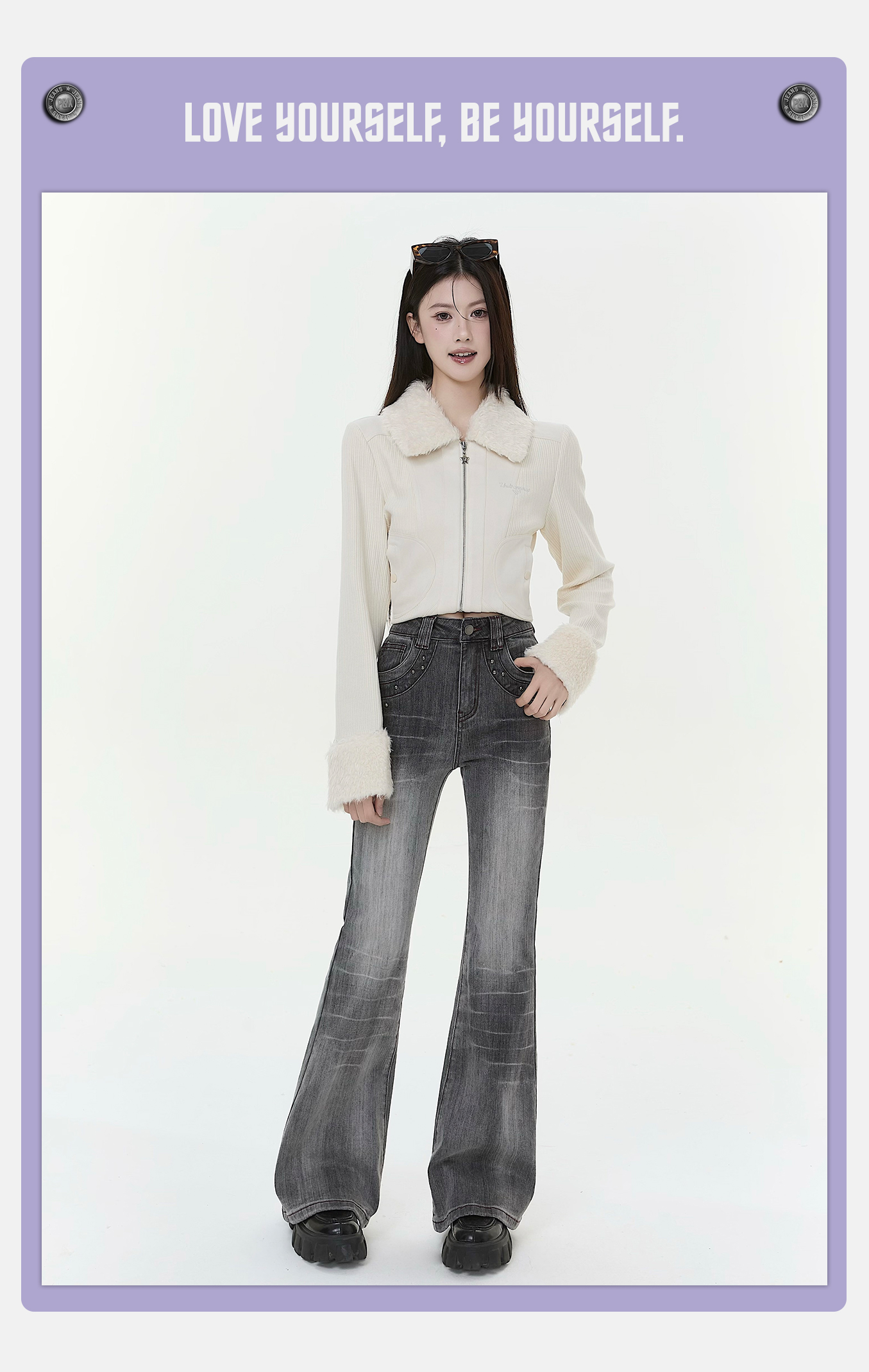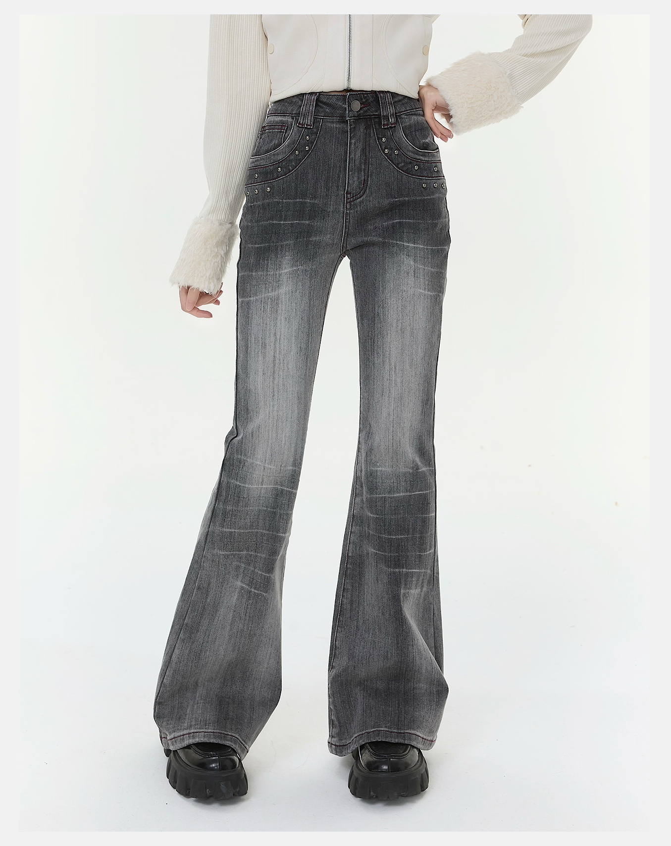 P&X设计师女装2025冬季修身紧身微喇叭裤牛仔长裤825410169 灰黑