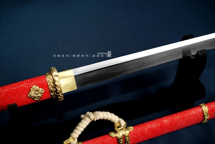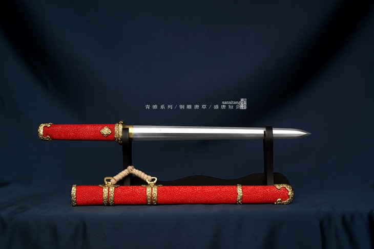 这只换了红色鱼皮 全亮的金具 带鞘全长52 只要2000多就能入手了 对于这个配置来说 性价比太高了 我们自己炼的两种钢夹在一起锻打而成 带一些花纹还挺好看 这次专门加了一些磨 表面更顺滑一些 全铜雕花金具 进口的整块优质鱼皮包裹木胎 手工打磨 天然不上漆 质感十足 配个小麻绳提胯 送锦袋 精致的小东西 送人贼好
