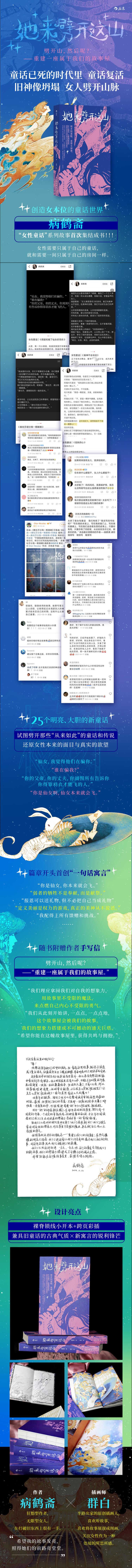 ◎童话已死的时代里,童话复活。旧神像坍塌,女人劈开山脉。 ◎安徒生说:“能感知到二十床垫子和二十床被子下的一颗小豌豆的姑娘才是真正的公主。”病鹤斋说:“定义美丽是权力的游戏,真正的美神从不说话。” ◎25个明亮、大胆的新童话,试图劈开那些“从来如此”的童话和传说,还原女性本来的面目与真实的欲望。 青狼王头也不回,冷静地说:“母亲跑得远,女儿才能跑得远。” 远志听到了来自遥远彼方的风声,是她和母亲一起往前飞奔的风声。——《劈山》 ◎新锐插画师群白倾情献绘。裸脊锁线小开本+跨页彩插,兼具旧童话的古典气质与新寓言的锐利锋芒。 1.一起奔向远方的小田鼠与仙女。2.鸟笼里的舞会和追逐权杖的夜莺。3.在大帽子里奋笔疾书的魔术师兔子小姐。4.奔月的女人与她无数的同伴。 ◎篇章开头首创“一句话寓言”—— “你是仙女,你本来就会飞。” “母亲啊,只有女儿才能为你劈开此山。” “定义美丽是权力的游戏,真正的美神从不说话。” ...... ◎劈开山,然后呢?——重建一座属于我们的故事屋。 女性需要只属于自己的童话,就和需要一间只属于自己的房间一样。 “是啊,你怎能在凡人写的书中找到狐妖的过去呢?就像我也无法在书中找到女子真正的模样。”——《狐妖的心》 “女人一起生活,在他们看来是天方夜谭。在故事里,女人一起生活的地方要么是仙女湖,等着被采摘;要么就是盘丝洞,让他们恐惧。好像打散我们,才是最合理的。”——《仙女湖与盘丝洞》 ◎随书附赠作者手写信,给每一个曾困惑或即将困惑于被诅咒、被拯救叙事里的“她”—— “我们理应拿回我们对自我的想象力,用故事里不受限的魔法,来点燃自己内心不受限的勇气。 “我们从此刻开始讲,一点点,一点点地,这个故事屋会被我们的故事,我们的想象力搭建成不可撼动的通天巨塔。 “希望你能在这幢故事屋里,获得共鸣与拥抱。”