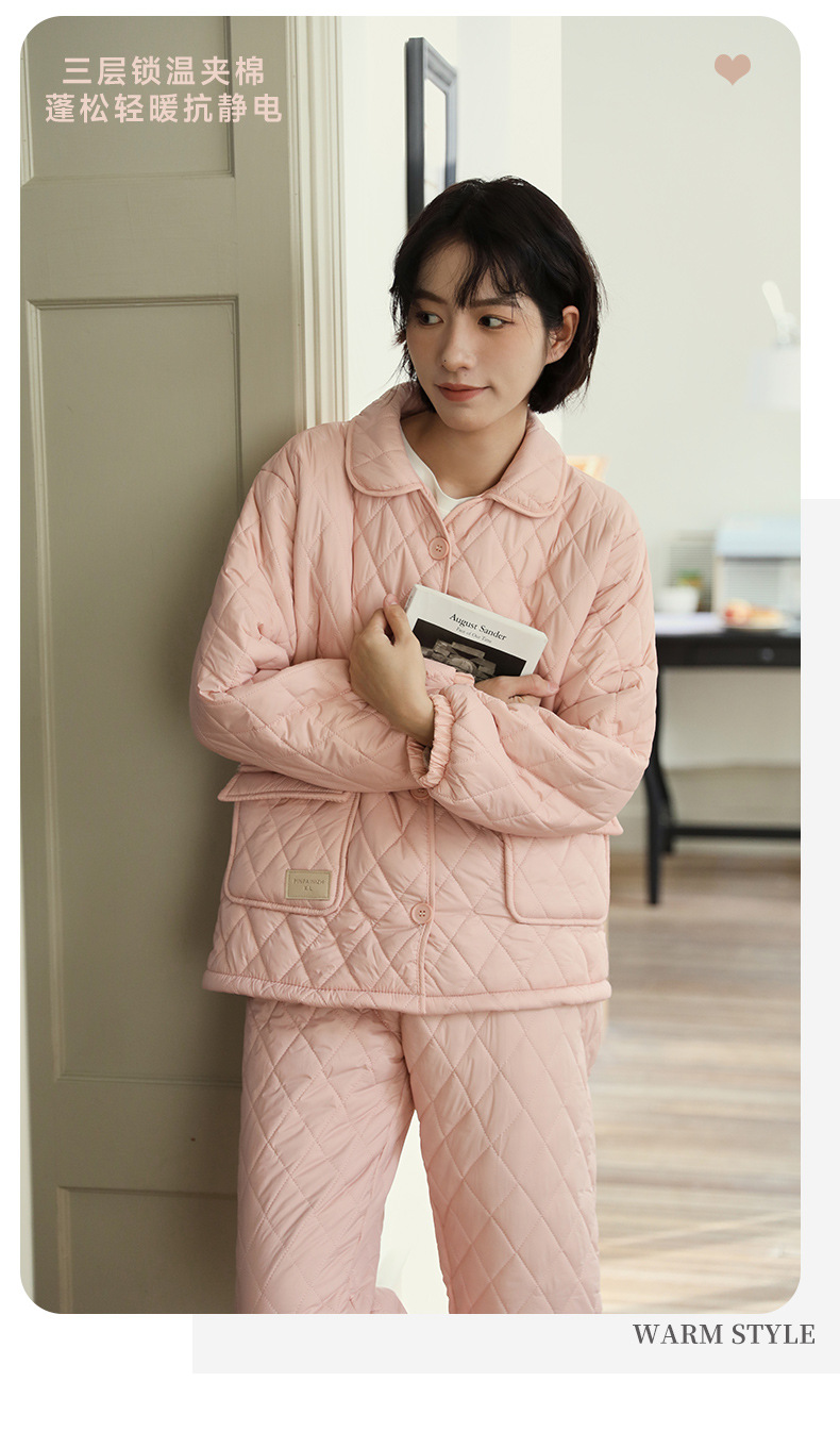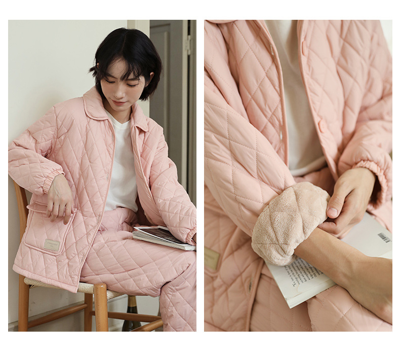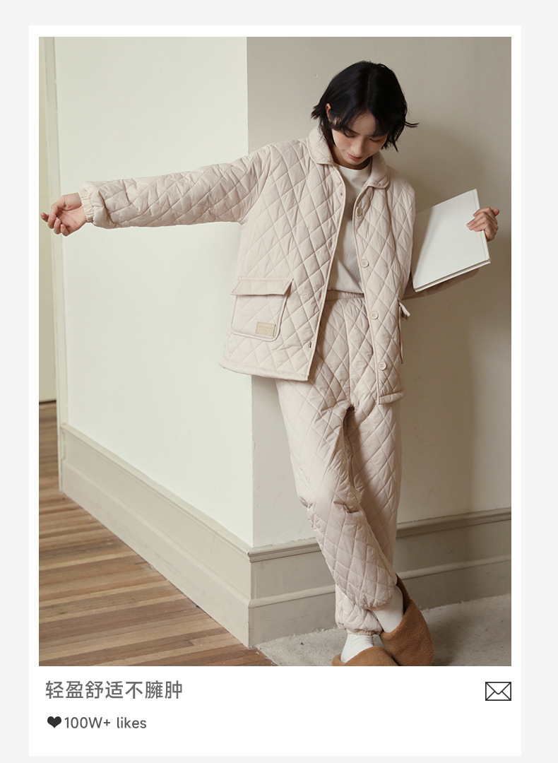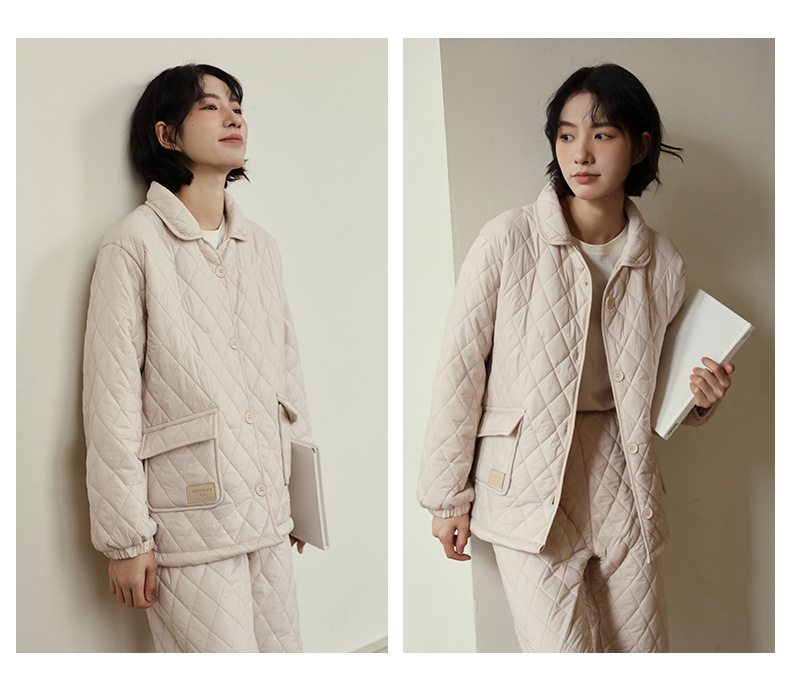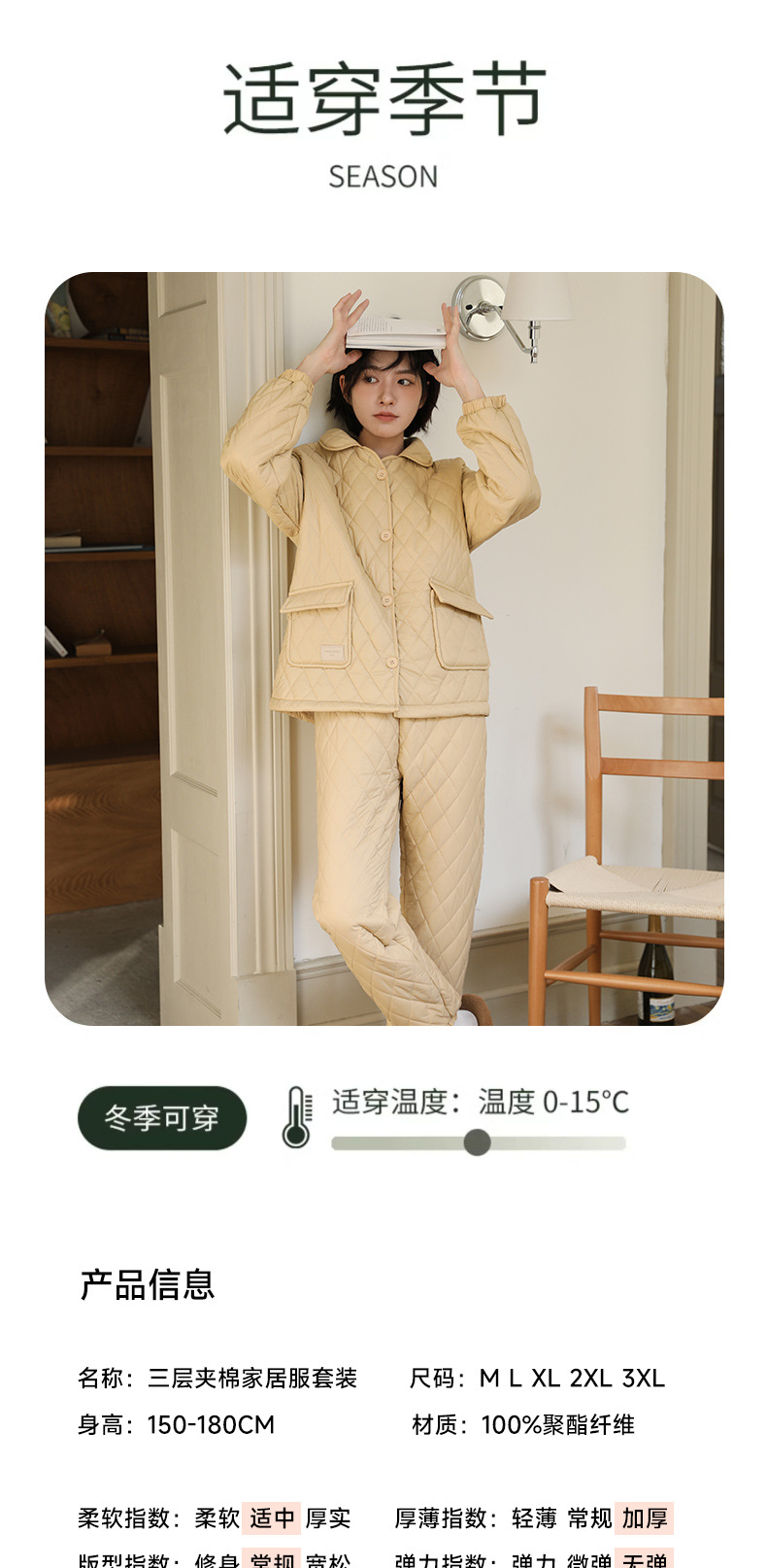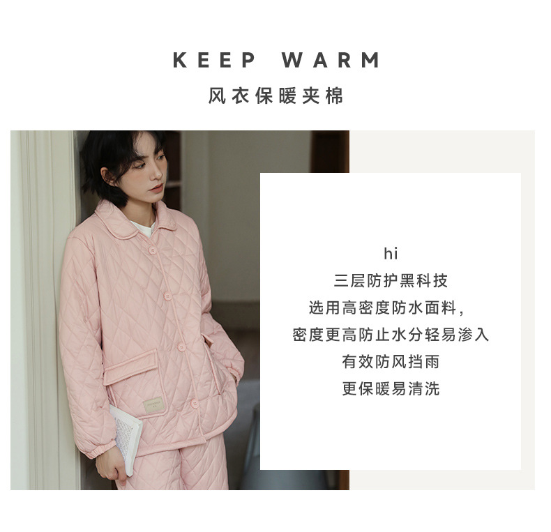女士三层夹棉家居服套装 可外穿防风防水时尚洋气加绒加厚防寒睡衣