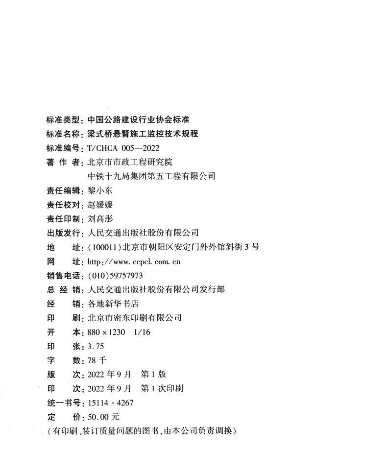 书名:梁式桥悬臂施工监控技术规程(T/CHCA 005—2022)