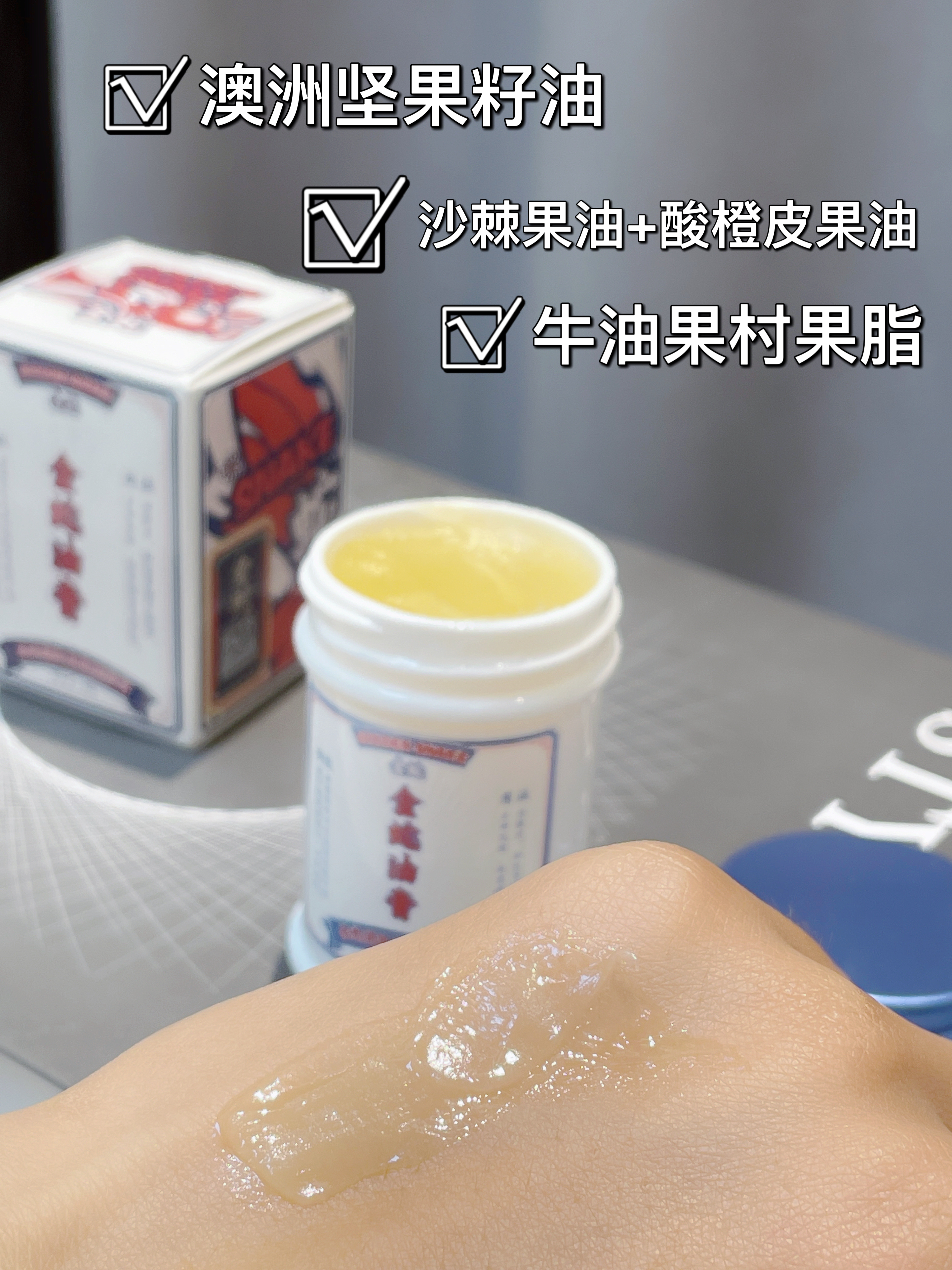 【成分】蛇油膏:矿脂,矿油,蜂蜡,蛇油,澳洲坚果籽油,牛油果树果脂,角鲨烷,沙棘国有,酸橙果皮油
