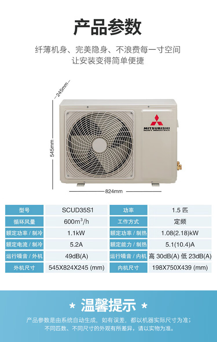 三菱重工1.5匹定频一拖一家用中央空调UDS系列 分体式风管机