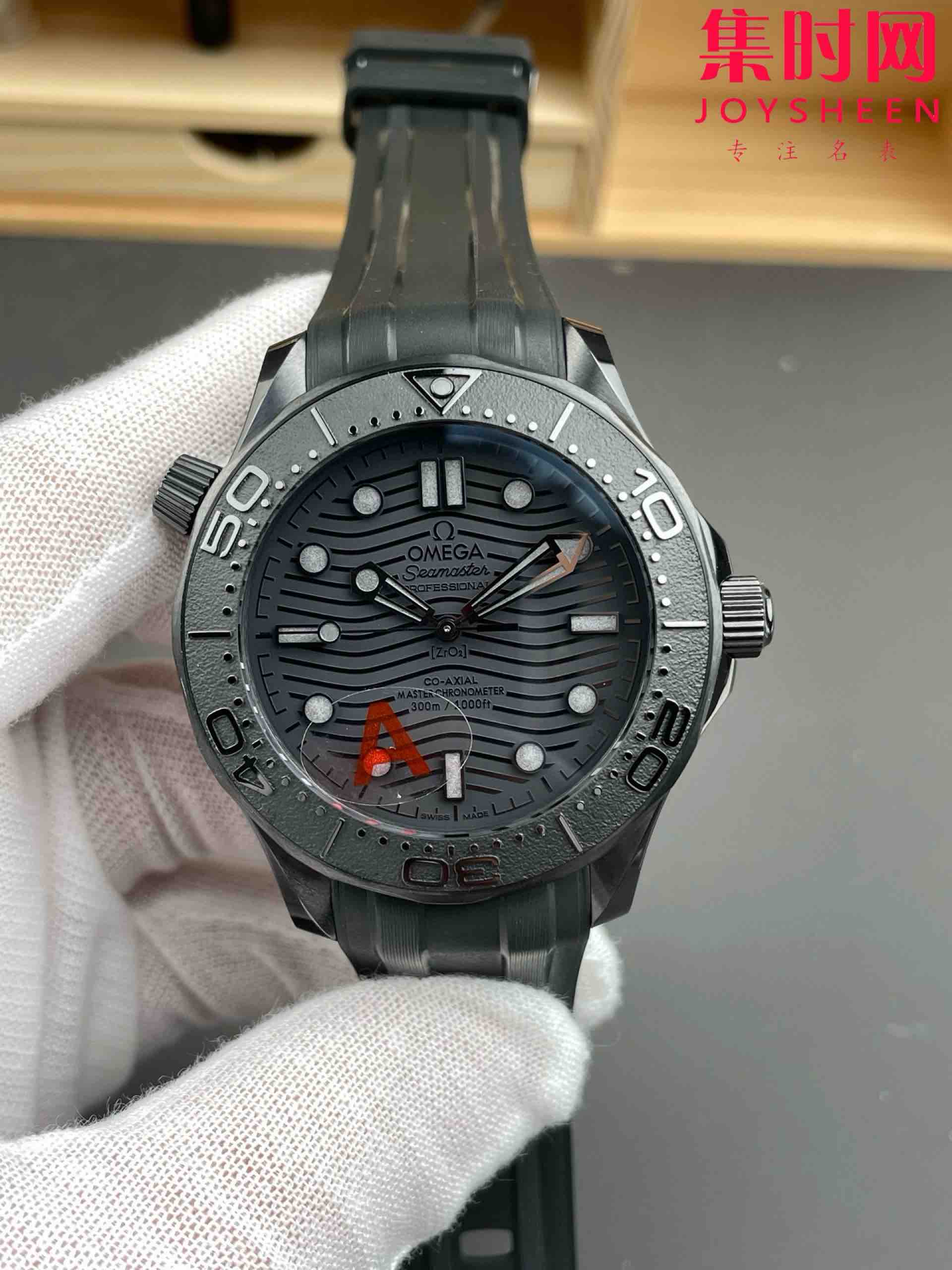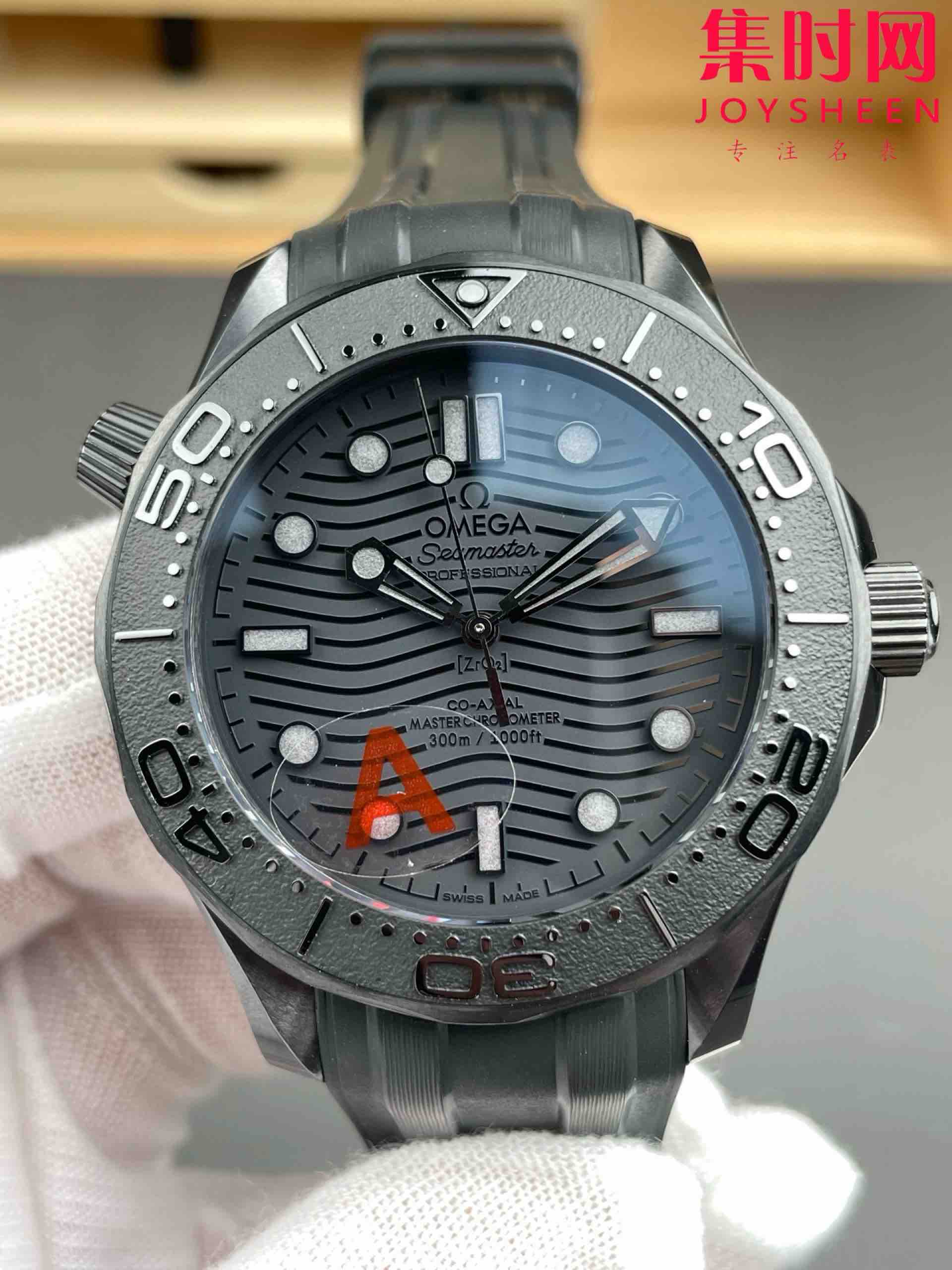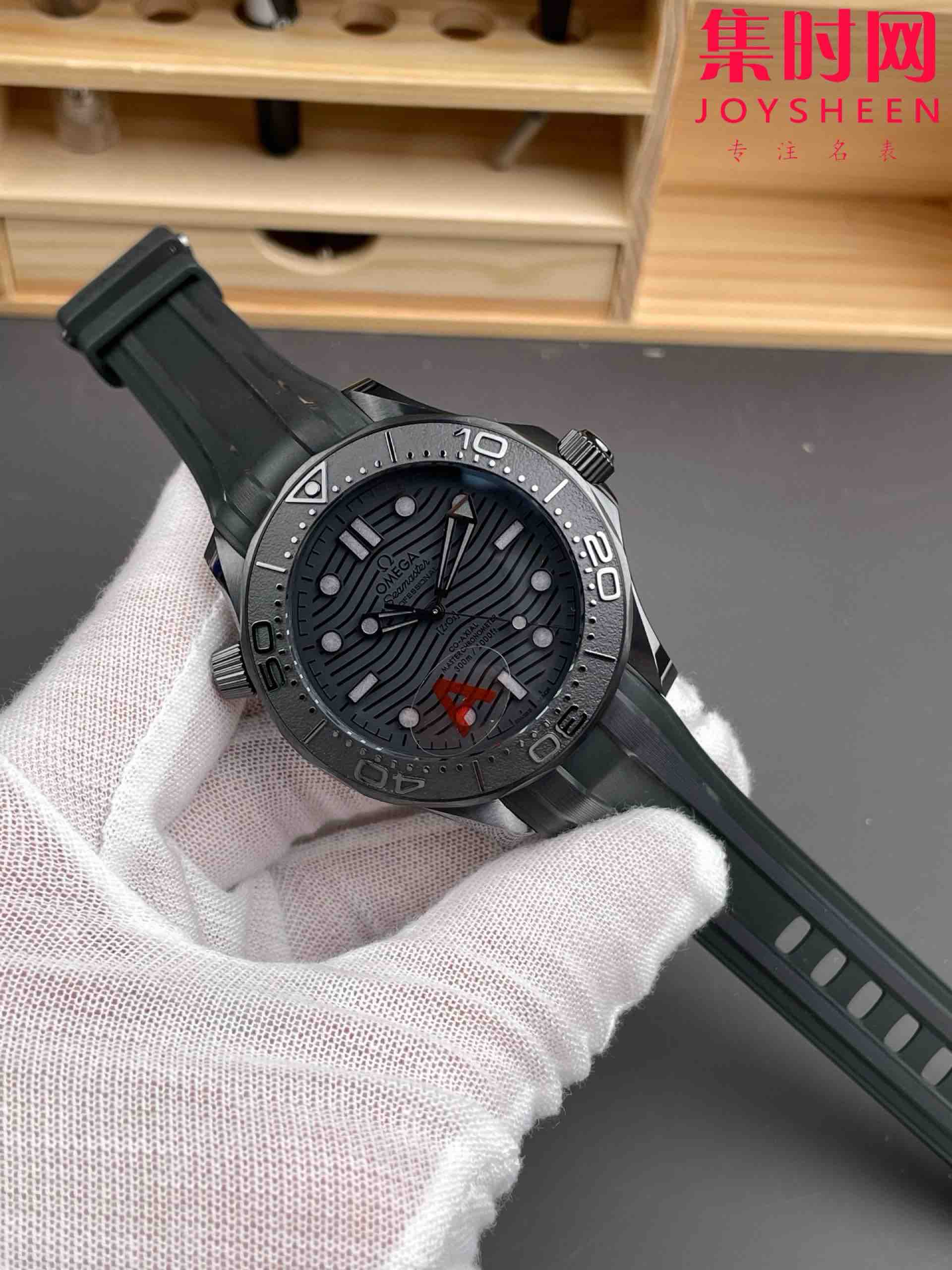 墨黑海马 桀骜登场 欧米茄新品VS海马300米系列 全黑陶瓷海马 男士腕表 8806一体机 表径43.5mm 表壳、表圈、波纹图案表盘均采用黑色氧化锆1Zr021陶瓷制成。镂空指针及12点位的圆点,均覆有Super-LumiNova夜光涂层。蓝宝石水晶镜面 天然橡胶表带 机芯的运转美态清晰可见。透过采用波纹边缘设计的蓝宝石玻璃表背,可以欣赏到VS定制Cal.8806一体全自动机械机芯。 亮点:直接在陶瓷表壳生牙,把管直接拧上陶瓷壳,这样不会掉把管,防水效果更出色。底盖也是直接直接拧在陶瓷壳上,整壳陶瓷打造,不用再加金属中胆!