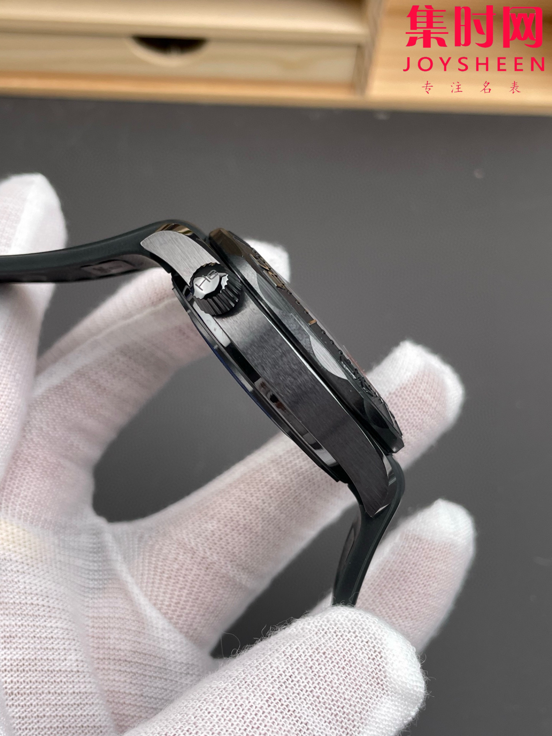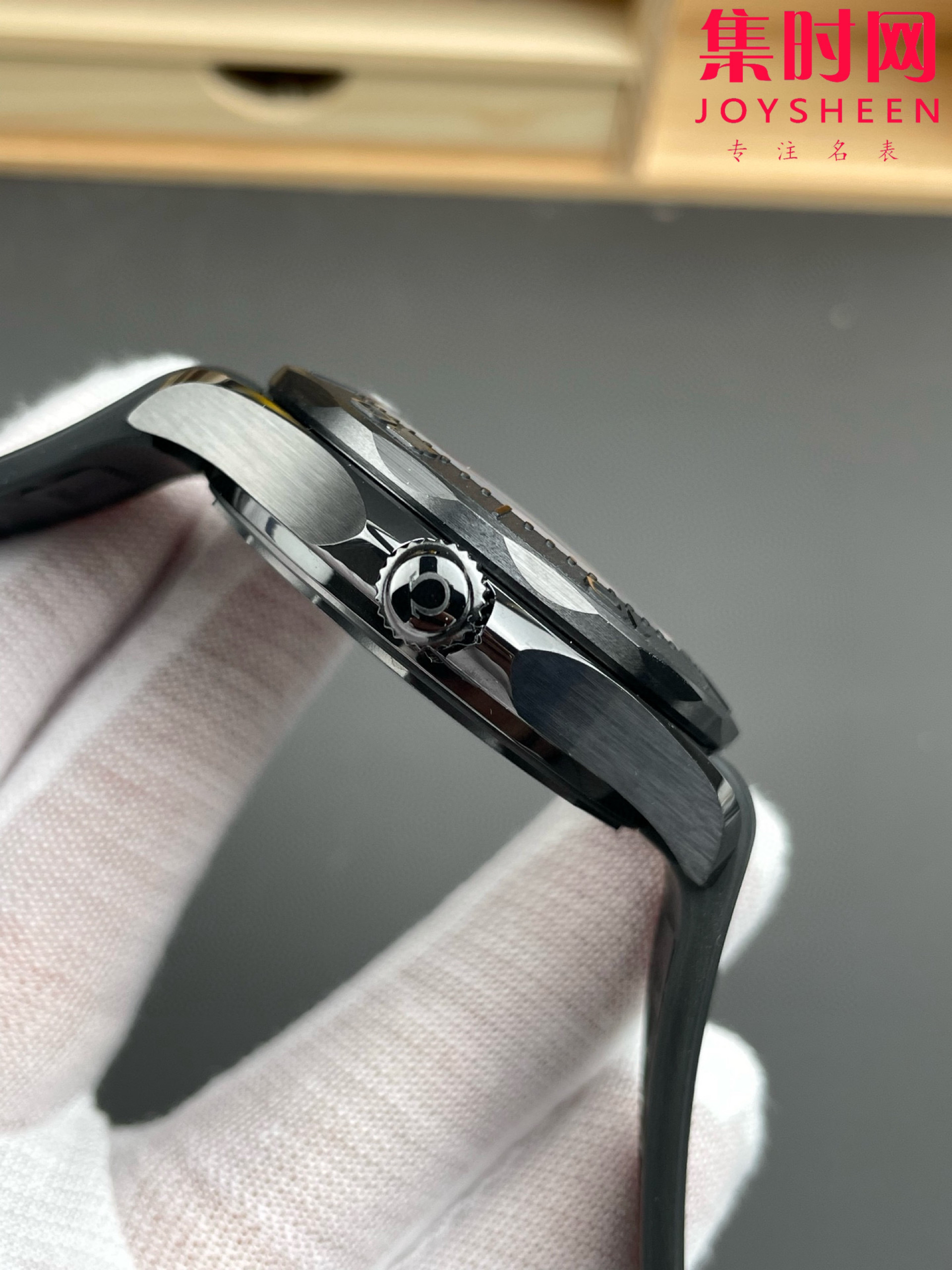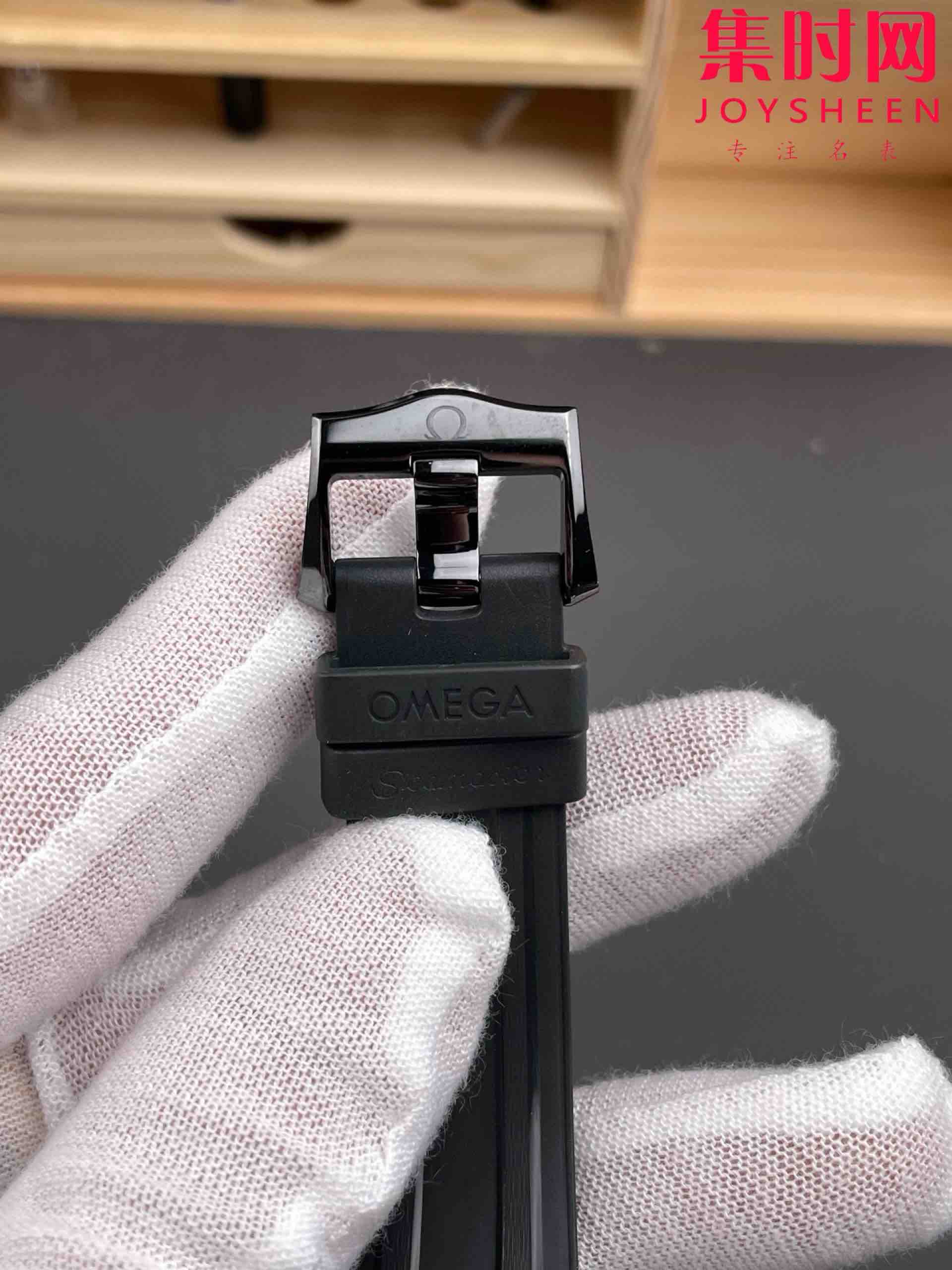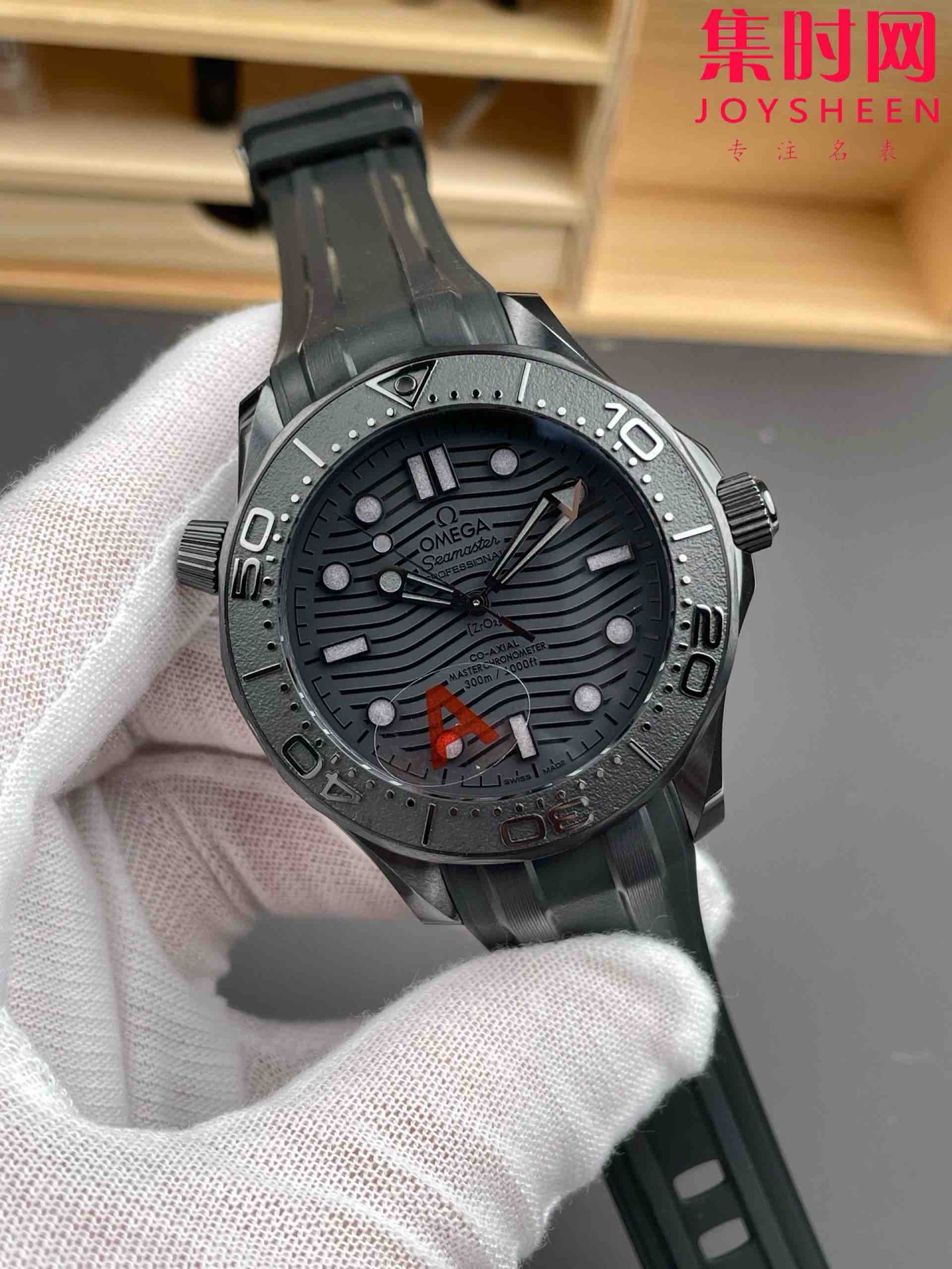 墨黑海马 桀骜登场 欧米茄新品VS海马300米系列 全黑陶瓷海马 男士腕表 8806一体机 表径43.5mm 表壳、表圈、波纹图案表盘均采用黑色氧化锆1Zr021陶瓷制成。镂空指针及12点位的圆点,均覆有Super-LumiNova夜光涂层。蓝宝石水晶镜面 天然橡胶表带 机芯的运转美态清晰可见。透过采用波纹边缘设计的蓝宝石玻璃表背,可以欣赏到VS定制Cal.8806一体全自动机械机芯。 亮点:直接在陶瓷表壳生牙,把管直接拧上陶瓷壳,这样不会掉把管,防水效果更出色。底盖也是直接直接拧在陶瓷壳上,整壳陶瓷打造,不用再加金属中胆!