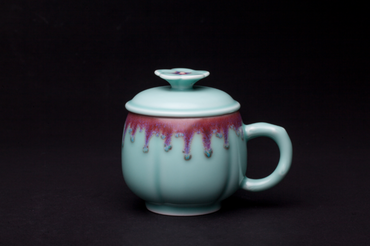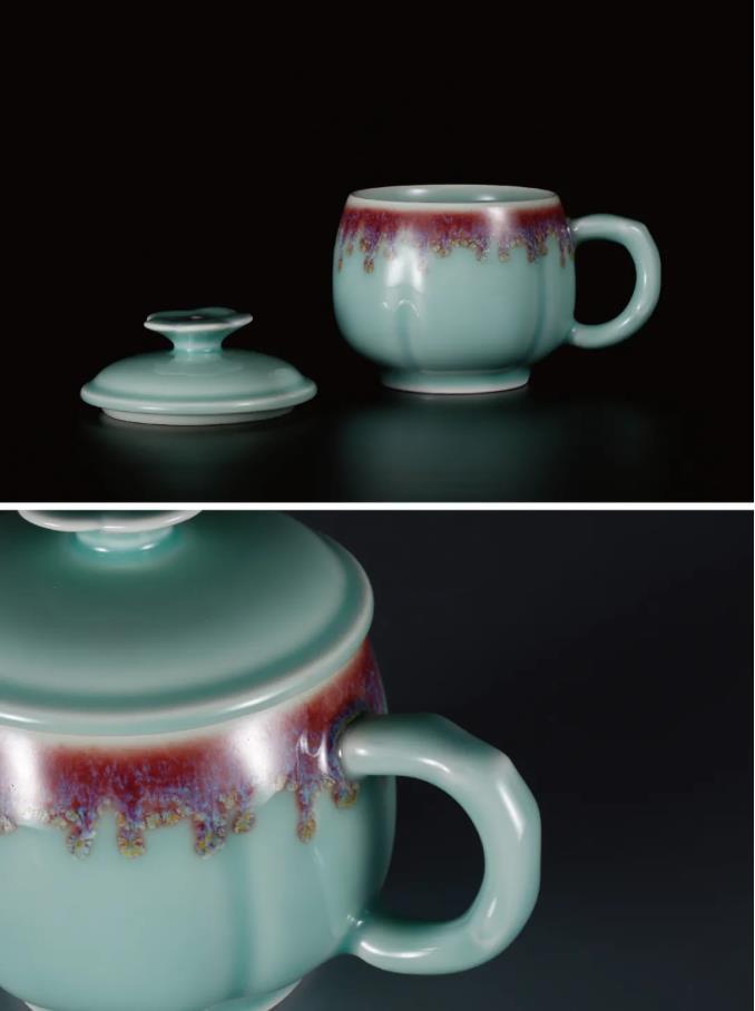 青梅杯整体较为秀气,梅花状盖滴灵巧实用;杯口往下一圈窑变色彩如瀑布般倾泻而下,绚烂出彩。