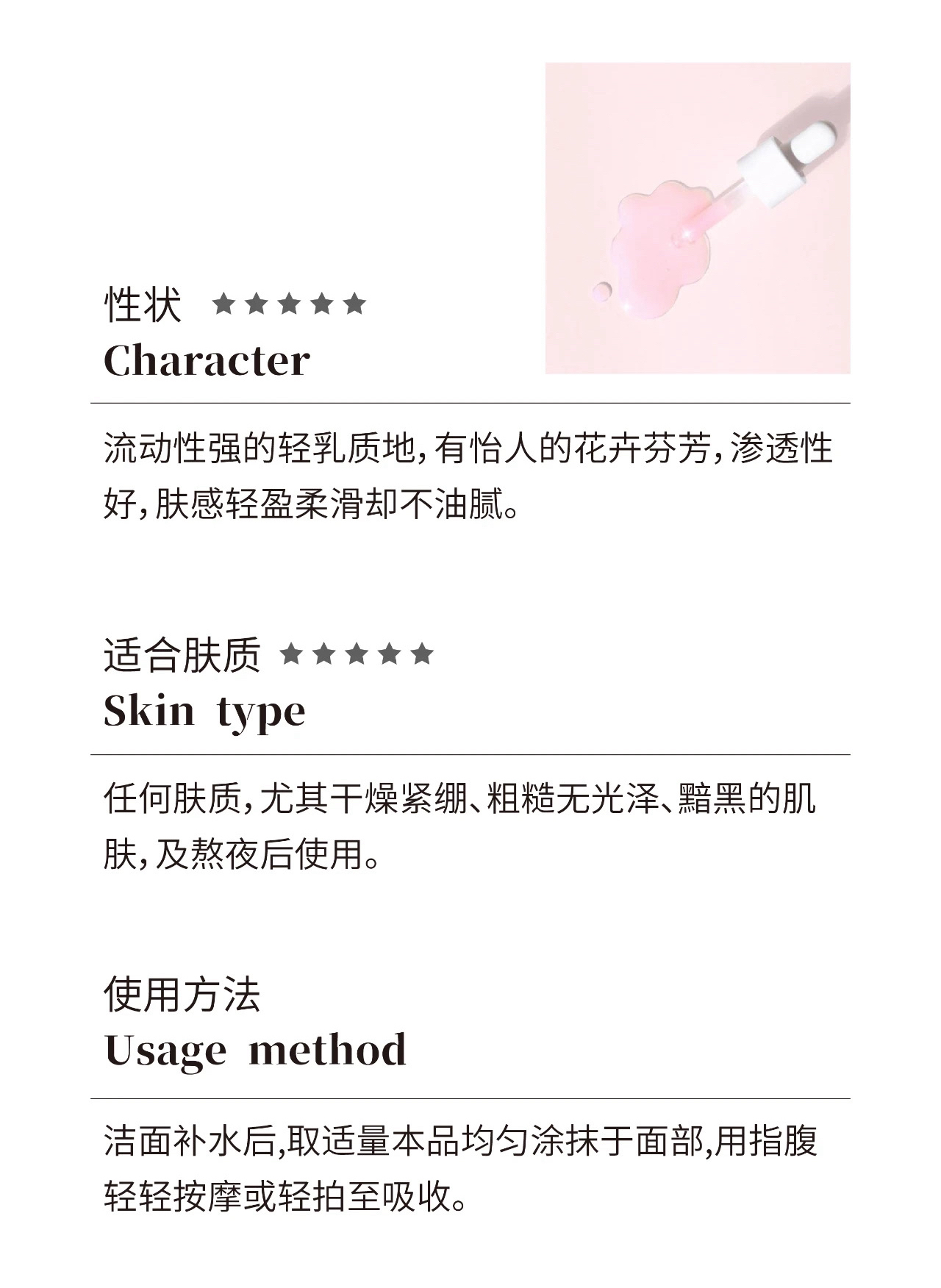 粉水晶般的清透油润质地,上脸润而不油、高效渗透;沁甜瑰香,恍若置身粉色的玫瑰花田,忘却了所有沉重的心绪,整个人都轻盈柔软起来~