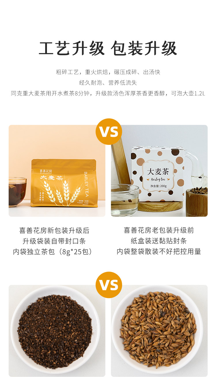 升级后的大麦茶,颗粒比升级前的更细了,这样泡出来的大麦茶,口感更醇厚,更易冲泡,而且是独立小袋,喝不到碎渣;