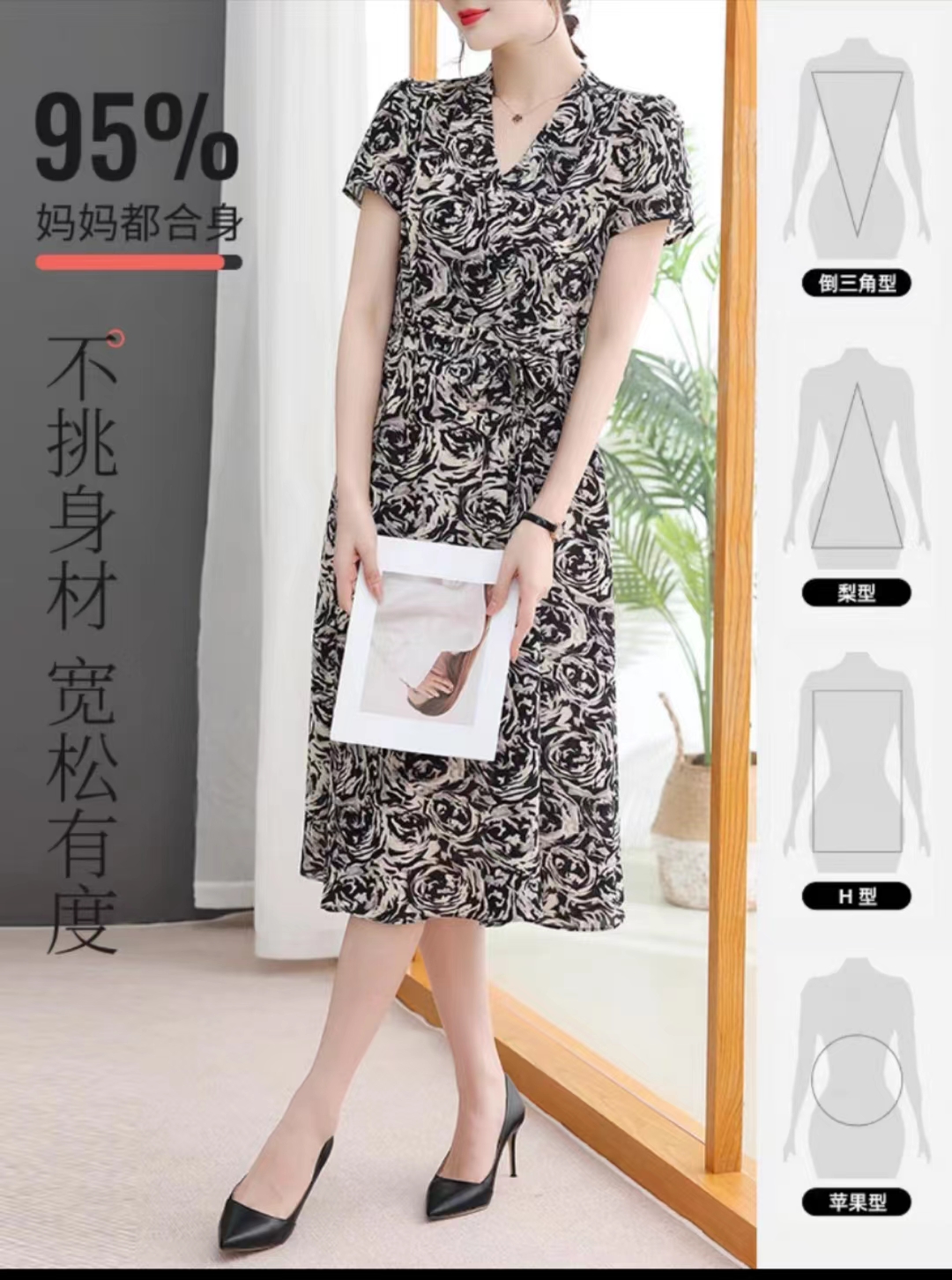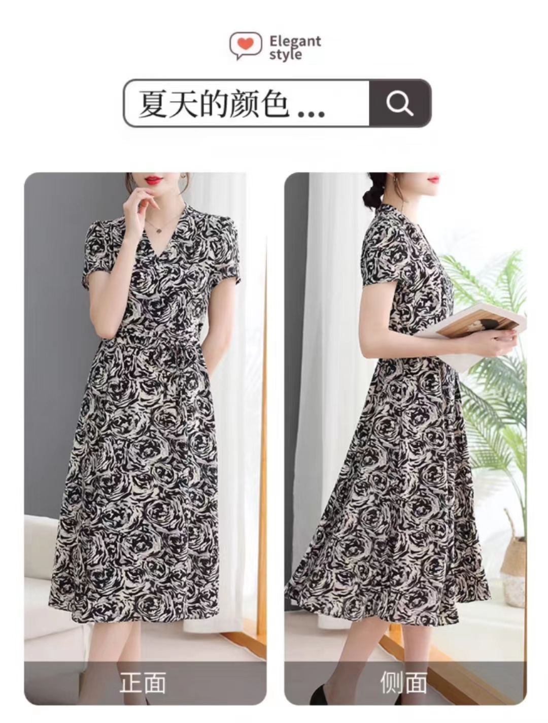 连衣裙玫瑰花色V领分码XLXXL