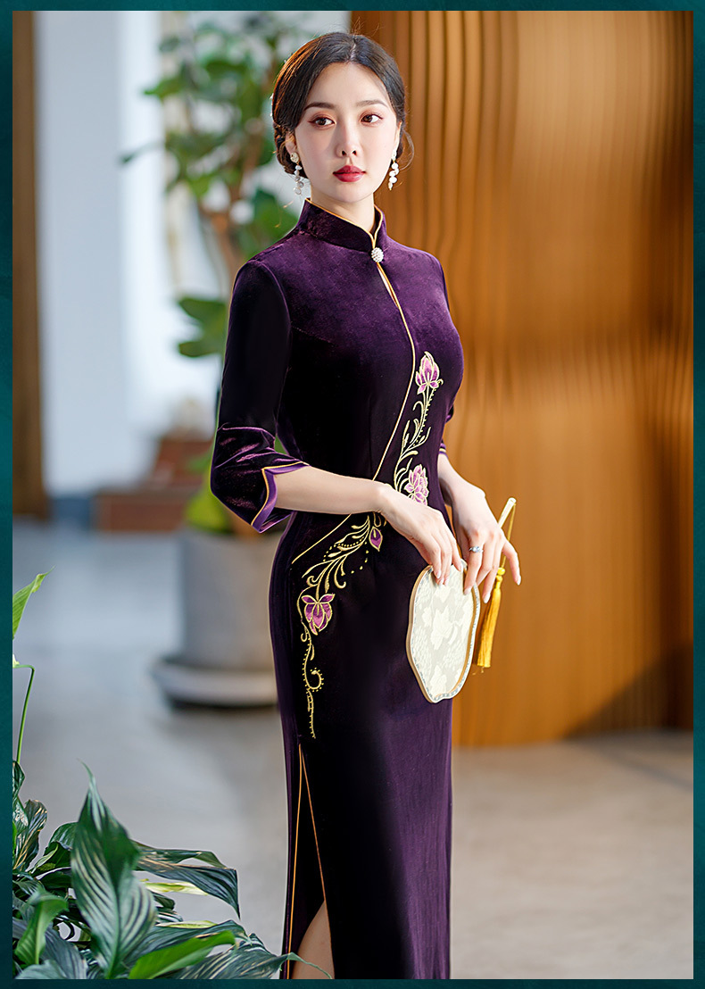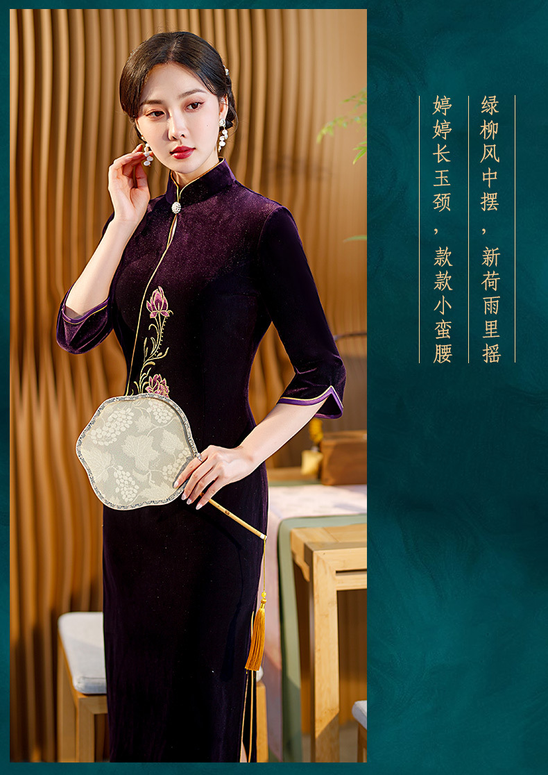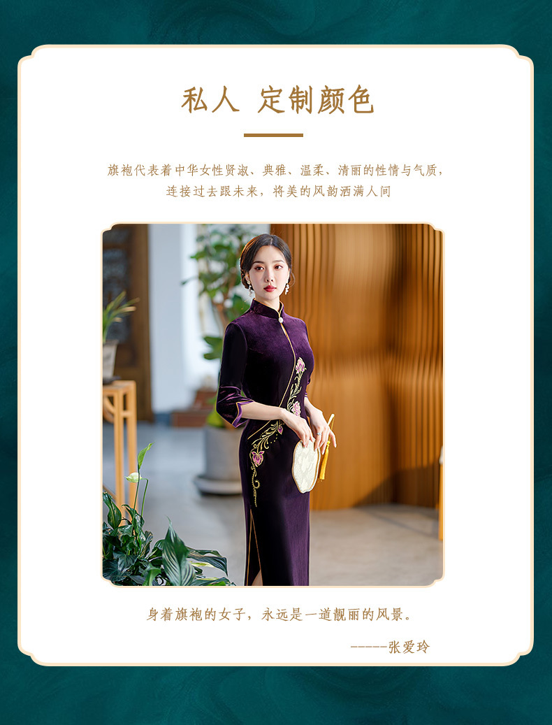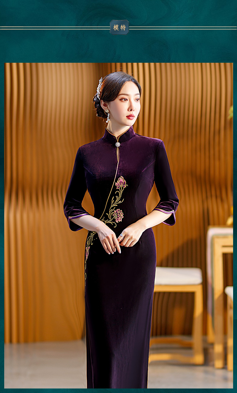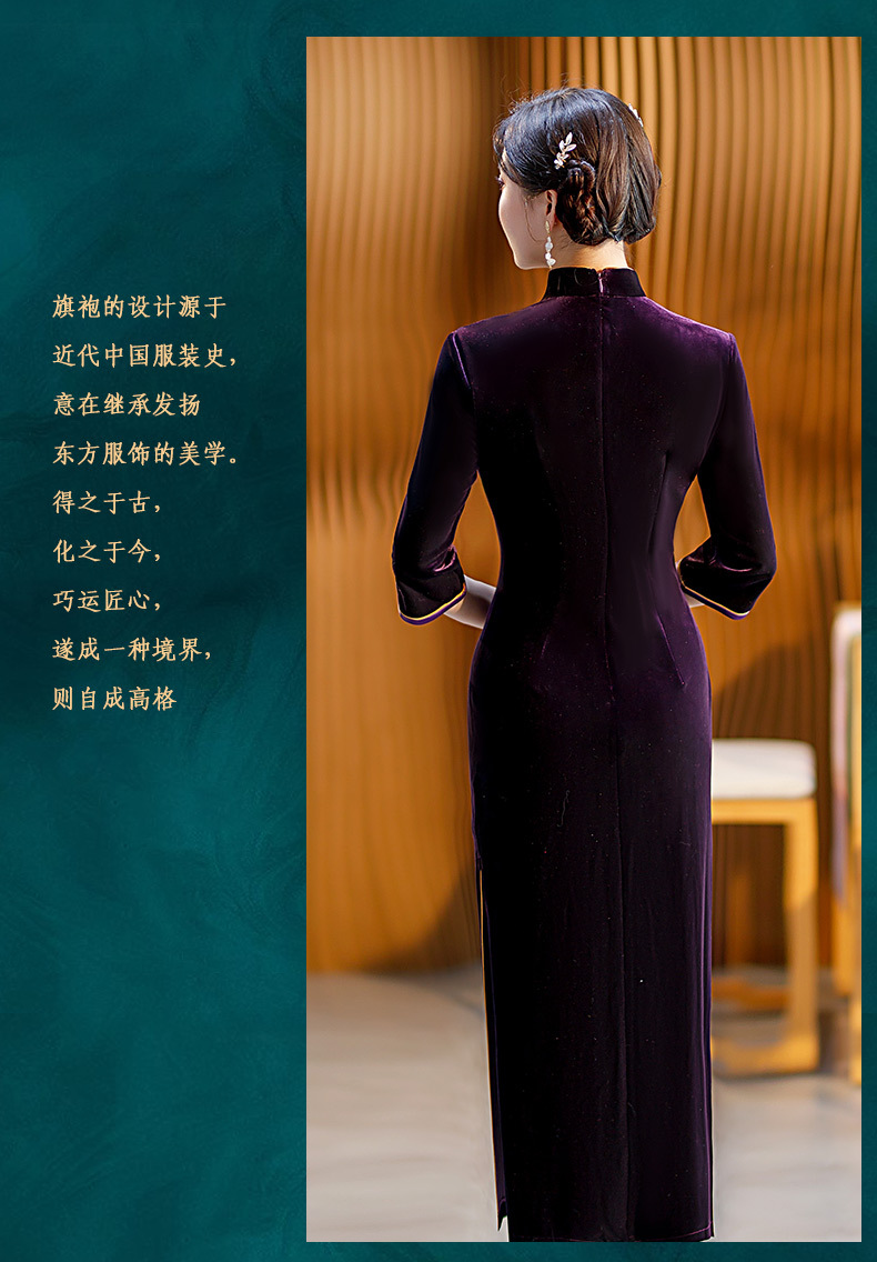 秋季七分袖新款复古旗袍丝绒修身立领长款改良礼服STF-C2170