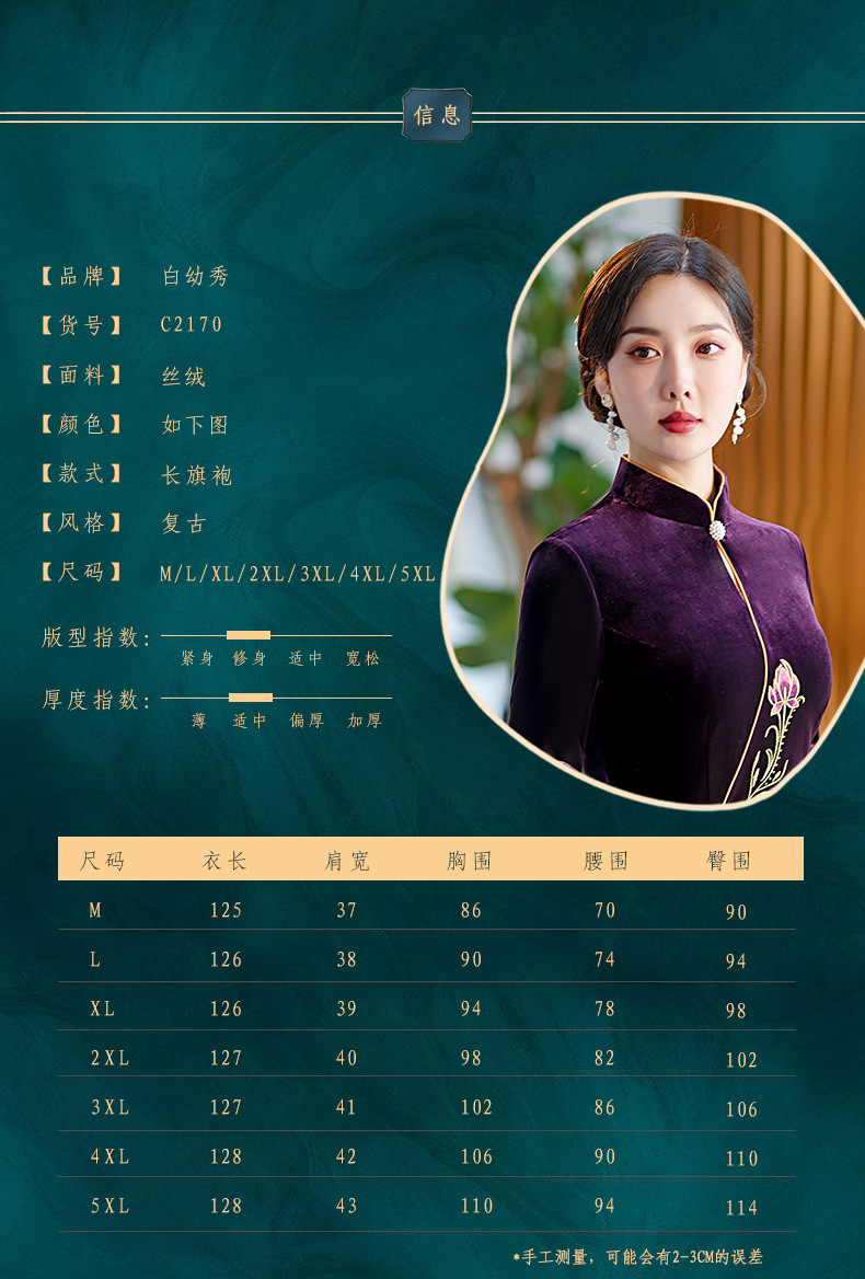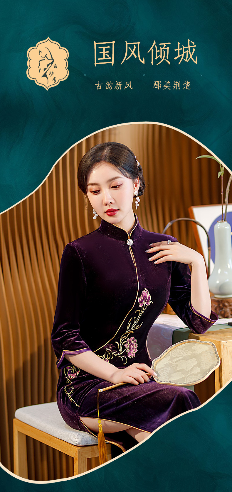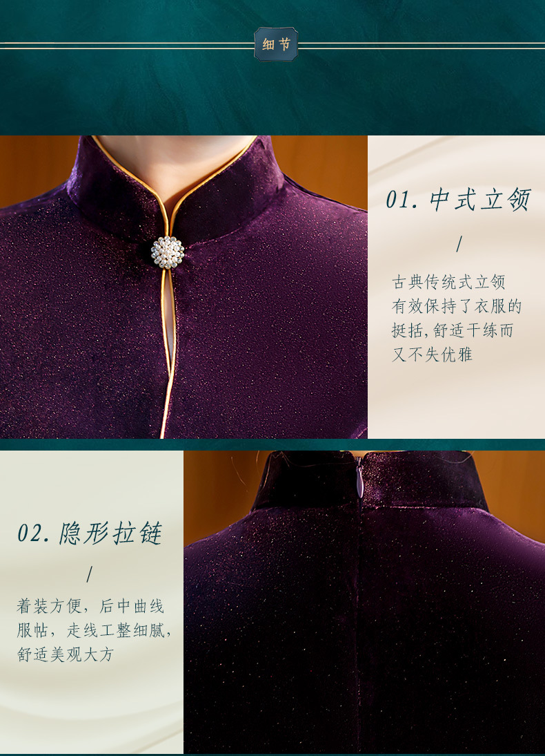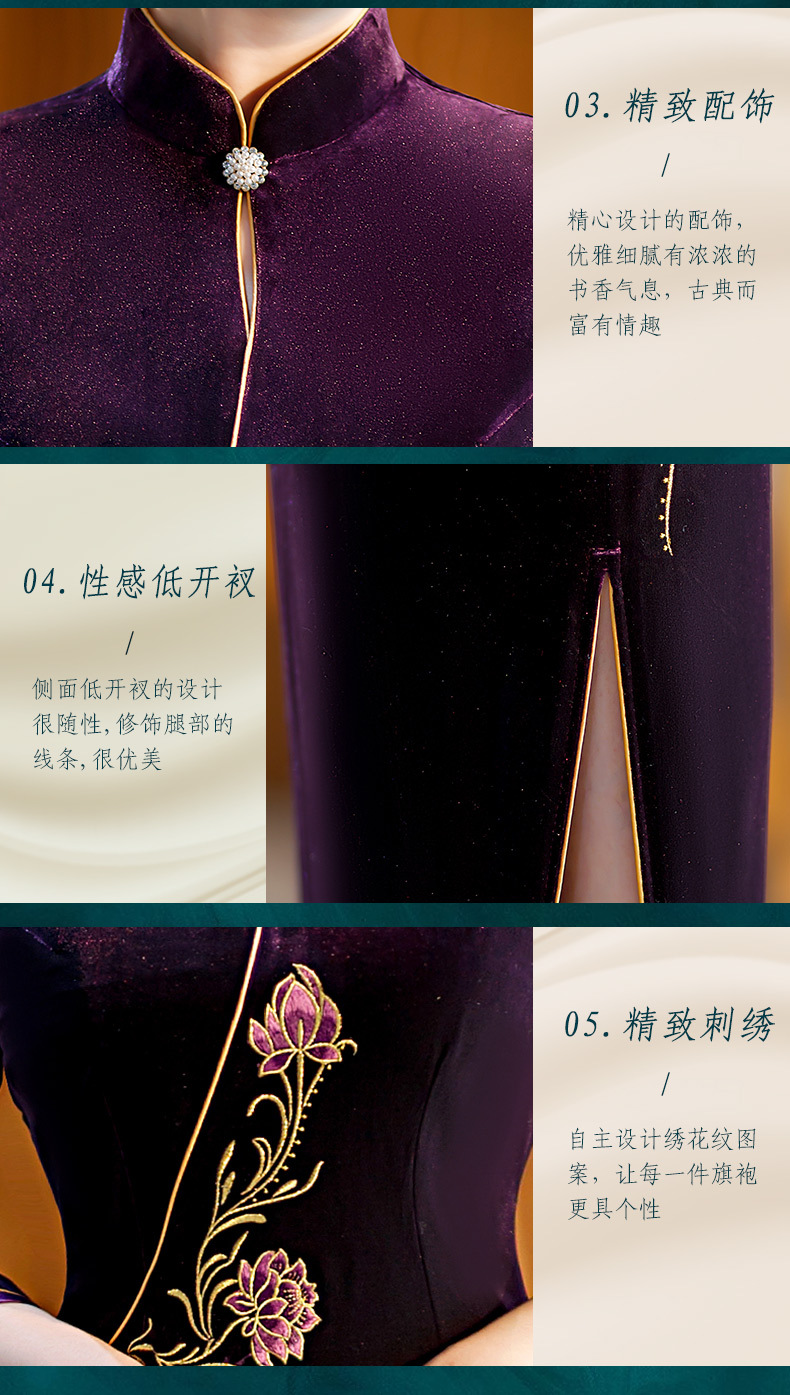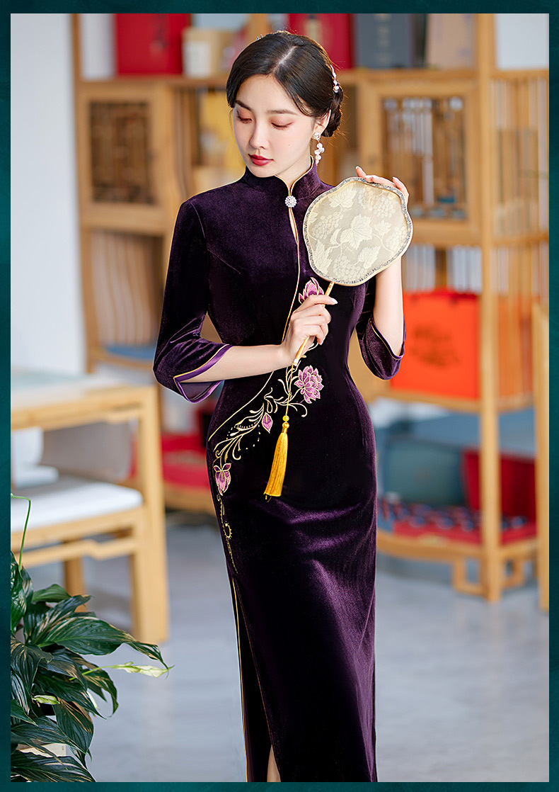 秋季七分袖新款复古旗袍丝绒修身立领长款改良礼服STF-C2170