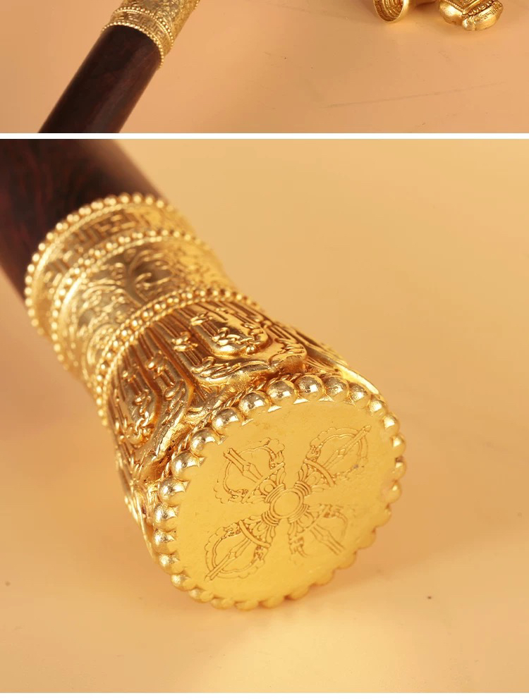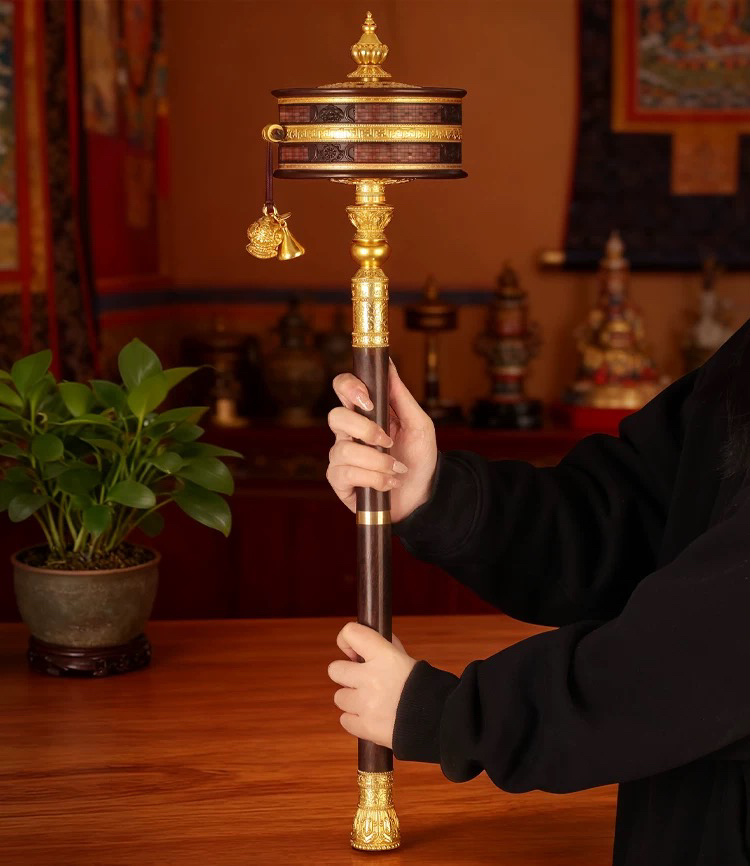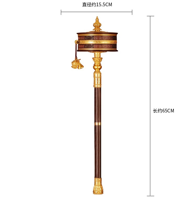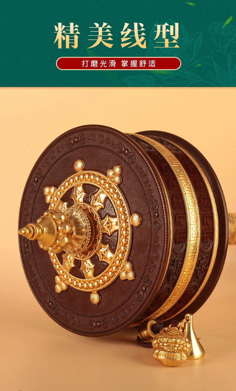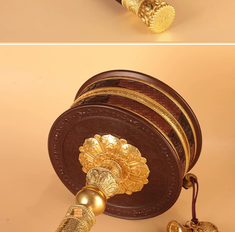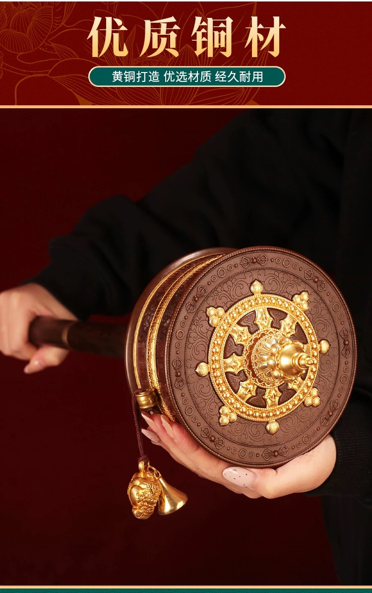 亚青纯铜转经简手摇转金轮底座藏式檀木摆件超大号手持转金桶