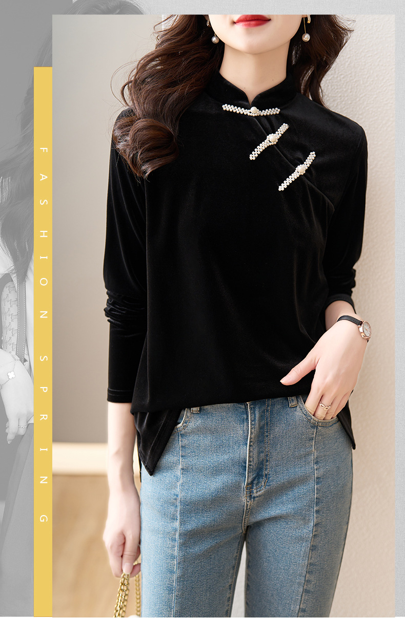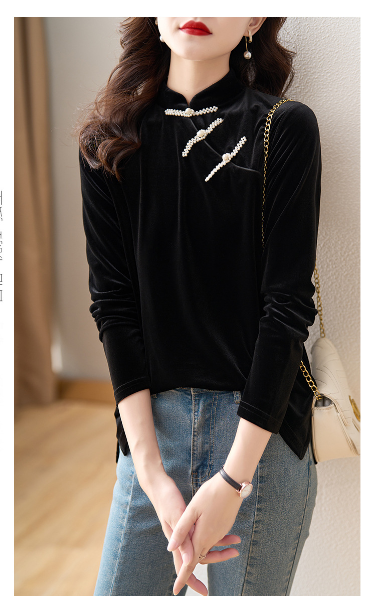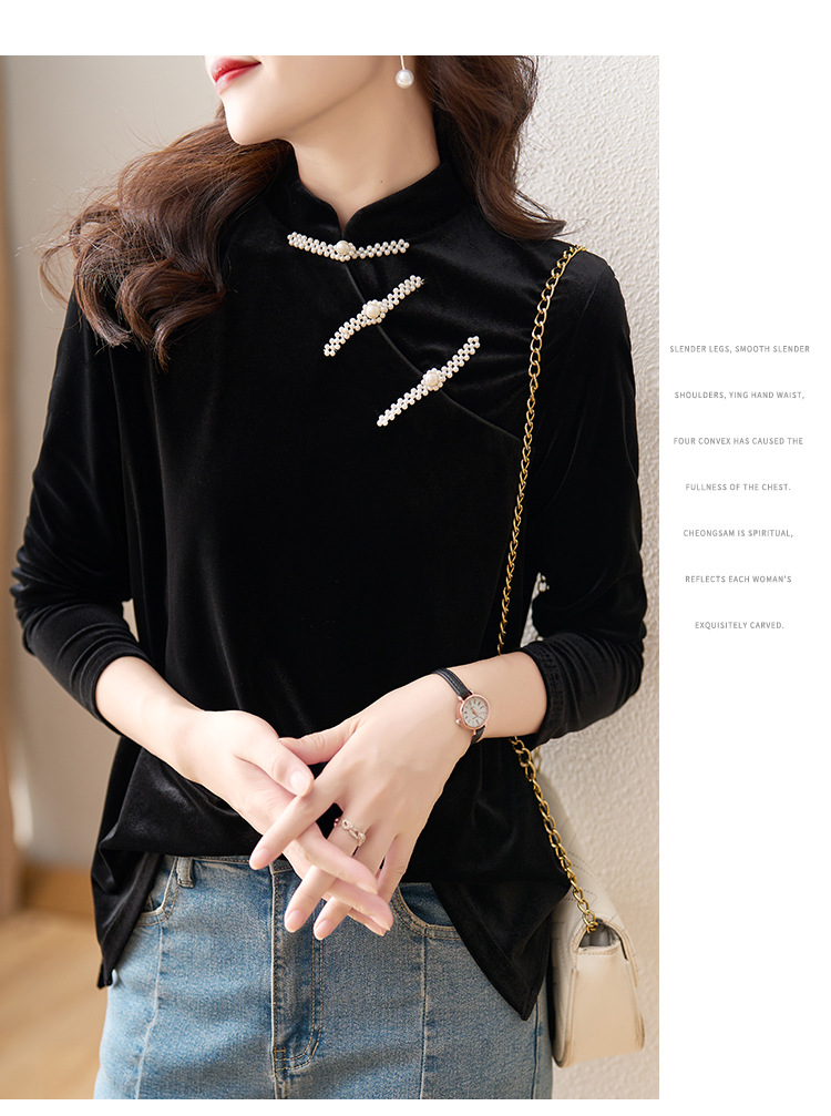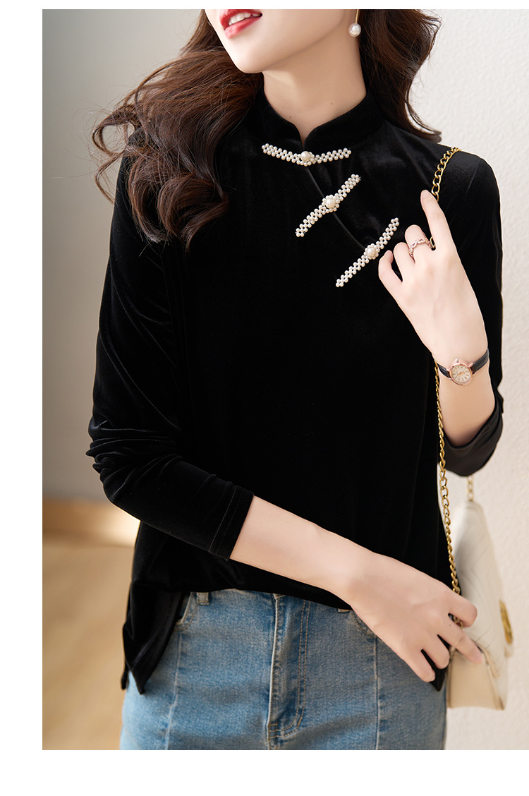 复古立领改良旗袍衬衫,秋冬新款中国风金丝绒珍珠链黑色上衣AHM-ymd1031