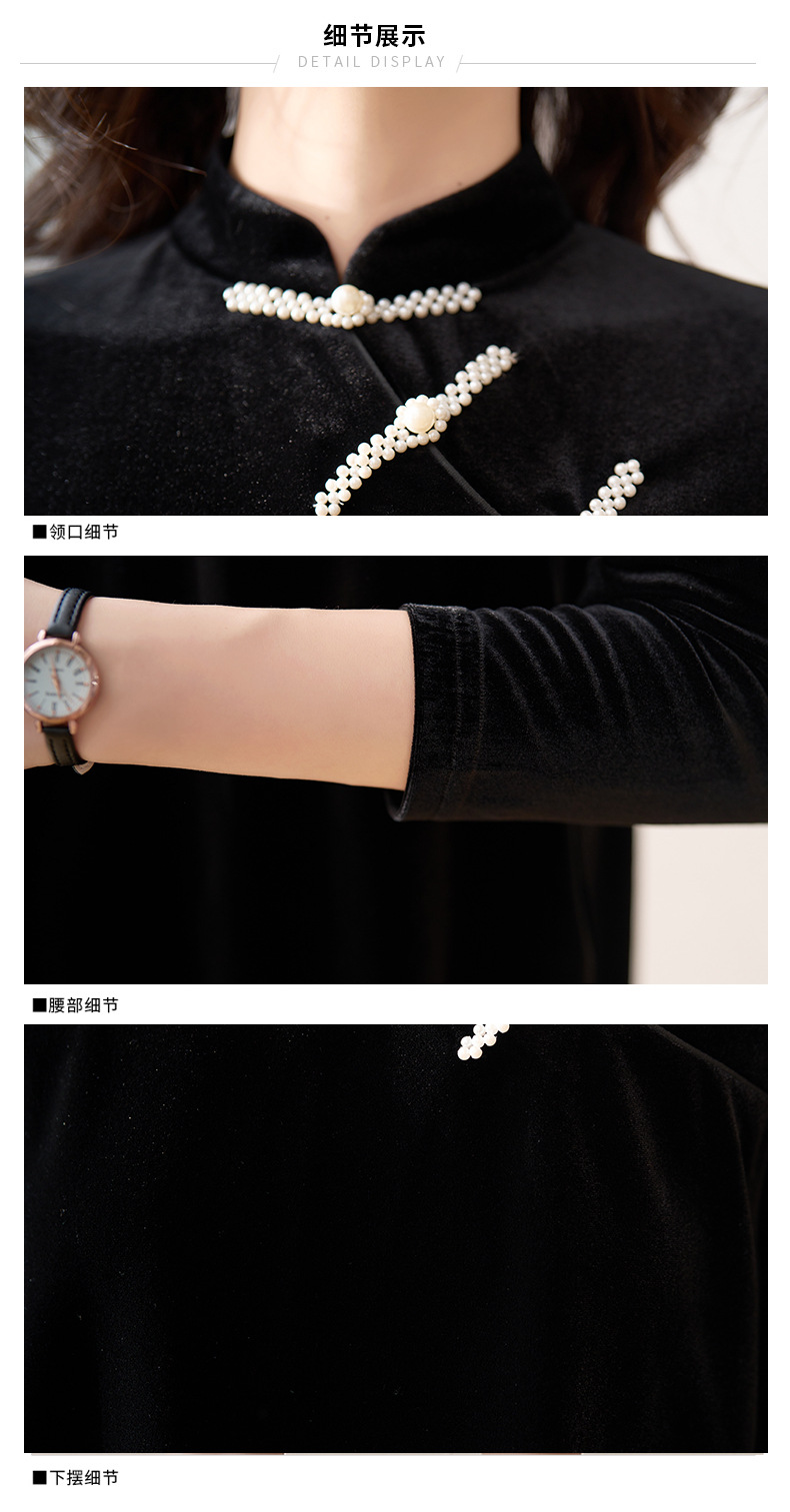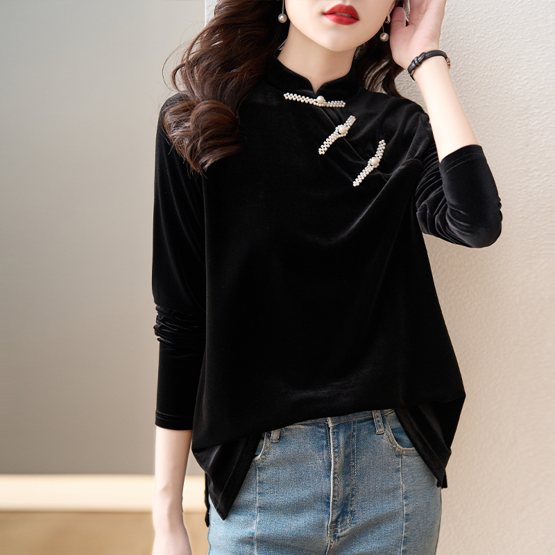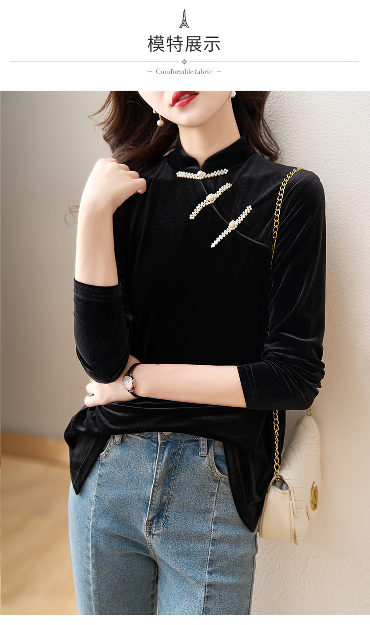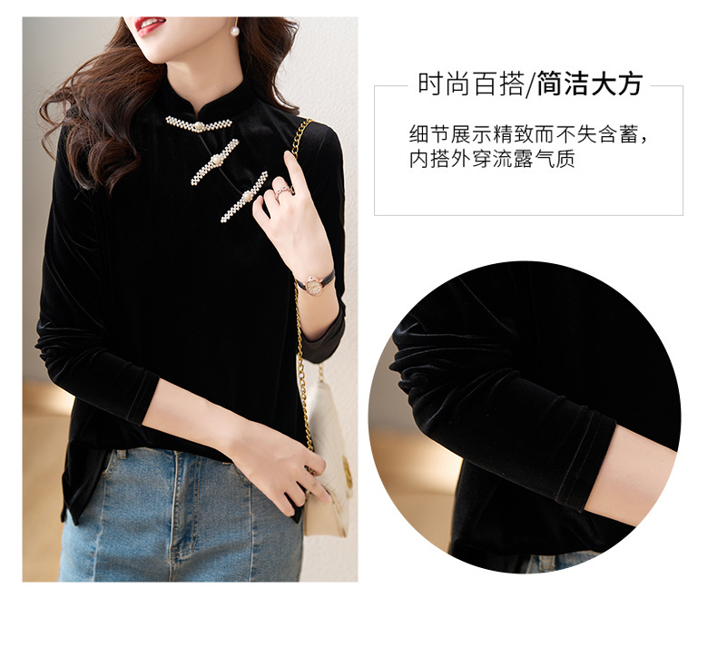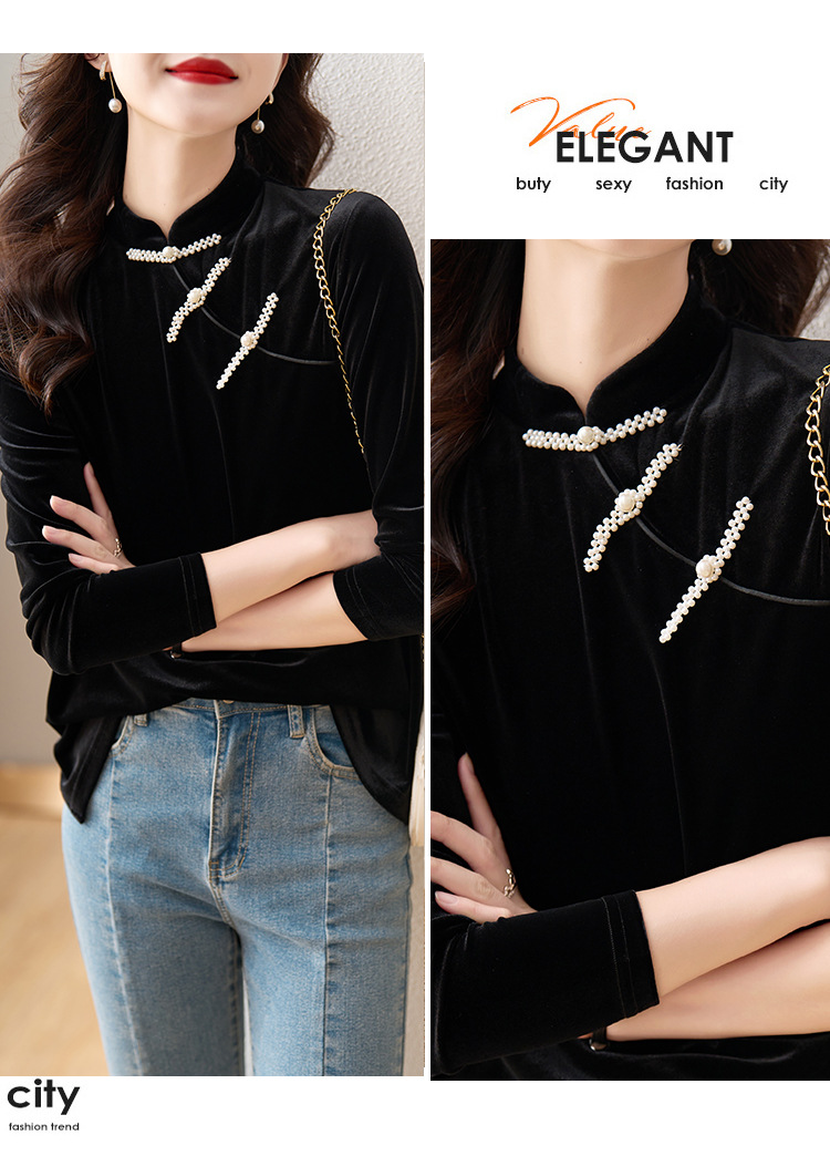 复古立领改良旗袍衬衫,秋冬新款中国风金丝绒珍珠链黑色上衣AHM-ymd1031