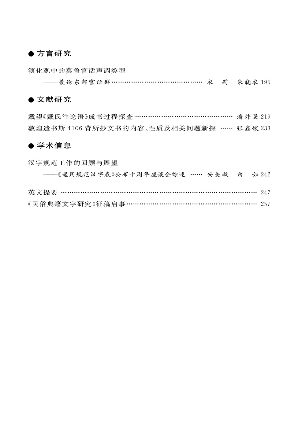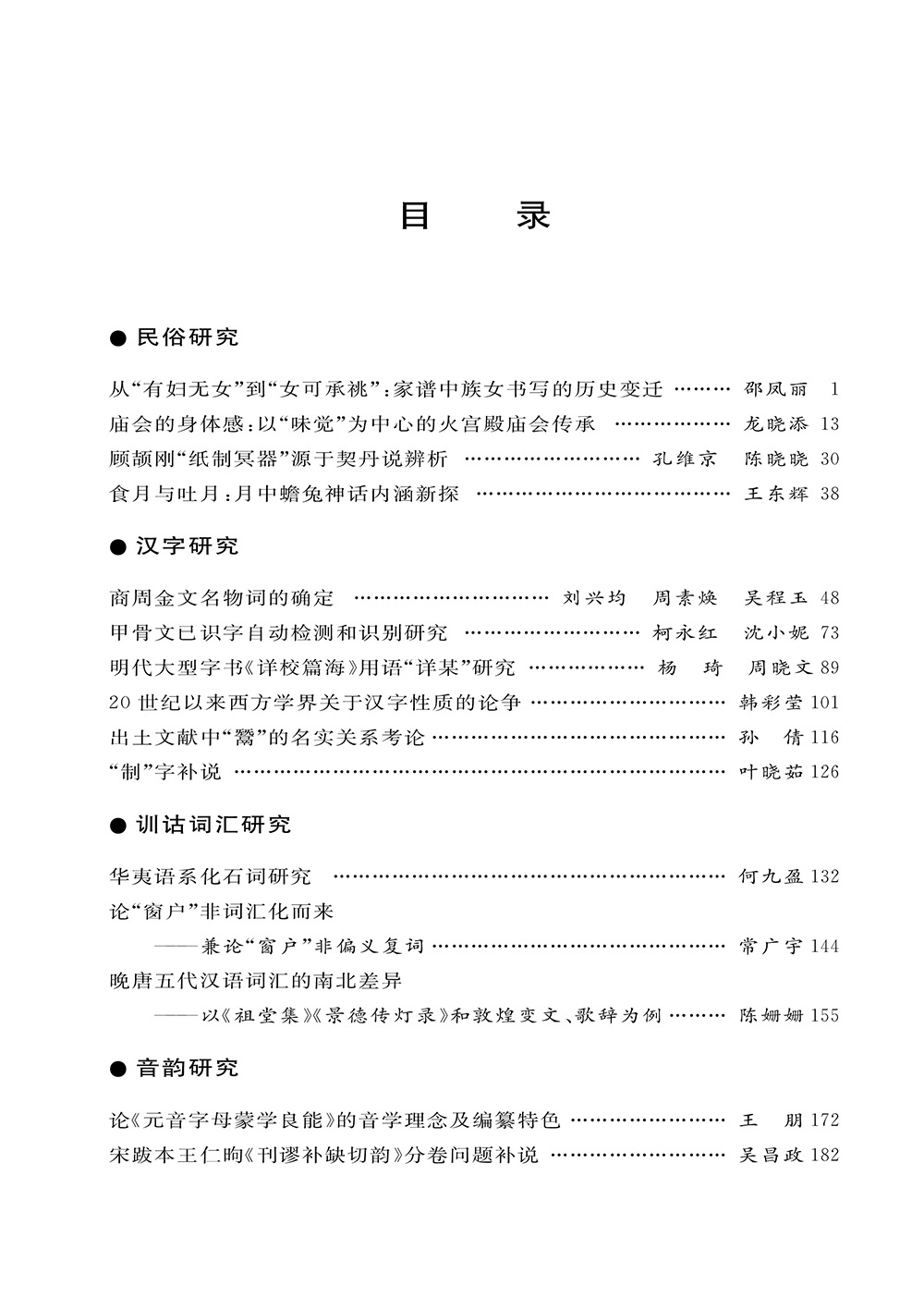 《民俗典籍文字研究》(第31辑),北京师范大学民俗典籍文字研究中心核心刊物,中文社会科学引文索引(CSSCI)来源集刊。本辑共收录论文19篇,设有“民俗研究”“汉字研究”“训诂词汇研究”“音韵学研究”“方言研究” “文献研究”“学术信息”七个栏目。训诂词汇研究方面,通过具体细微的探析,发明新义。音韵学方面,探讨了传统韵书的源流、影响。文字学方面,既有对理论的探讨,又有对传统字书的研究,以及从文字角度看清华简文本的探析。民俗学方面,有对前辈学者的往事追忆及其学术思想的研究,也有对乡村民俗文化遗产的讨论。华语研究所收论文探讨了华语研究的六个视角。本期既收录了学界大家的论文,也有后起新秀的研究成果。内容所涉及范围较广,论文学术含量较高。