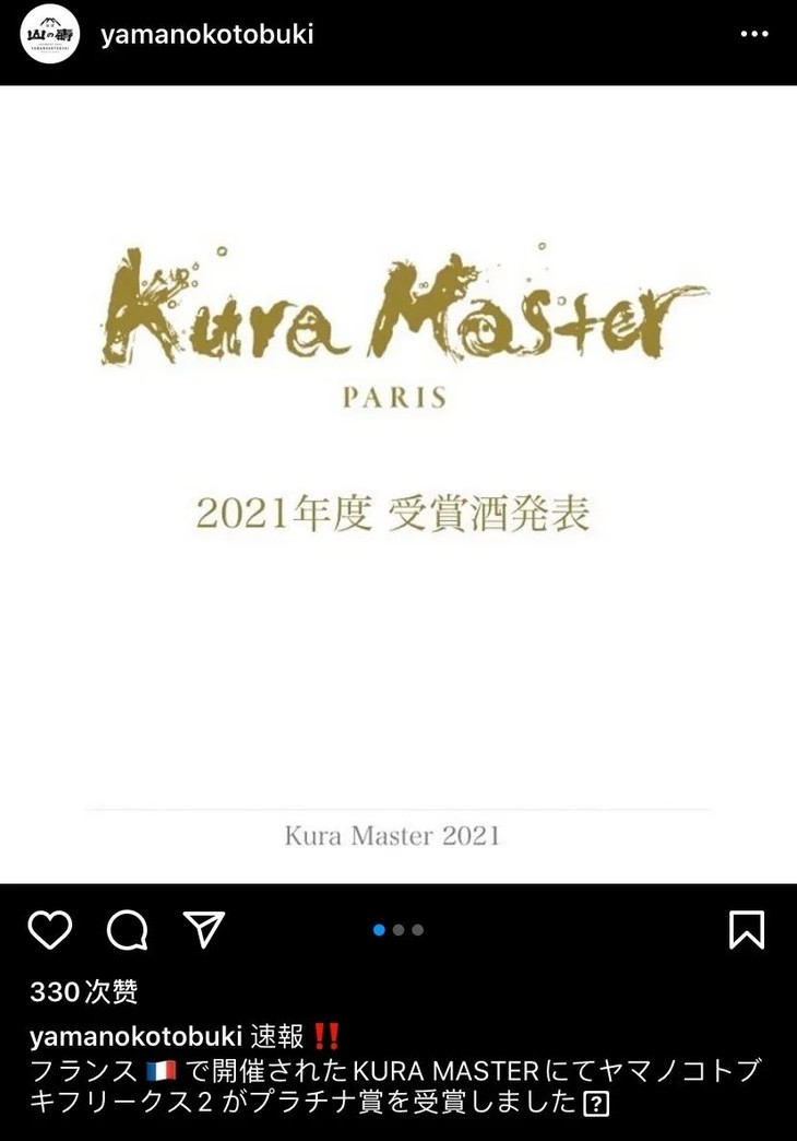 而【山之寿】所独家创作的泡沫发酵法,是在保留清酒发酵时候留下的气泡,在酵母活性最强的时候装瓶密闭,让剩余的酵母继续发酵产生气体,并且不让后段发酵生成的气体流失。其次是严格控制装瓶温度:必须在零下3度的环境中装瓶,让装瓶前已经产生的二氧化碳,最大程度以液体碳酸的形态留在酒液中。所以它的气泡非常绵密细腻,非常的优雅高级,绝对是你没有喝过的味道。而靠着这招独门绝技,它这两年来斩获各种大奖,比如在日本清酒三大奖之一的Kura Master2021中 斩获最高奖