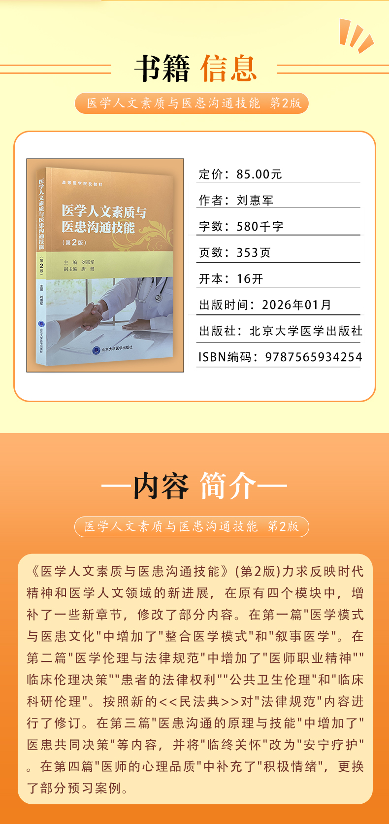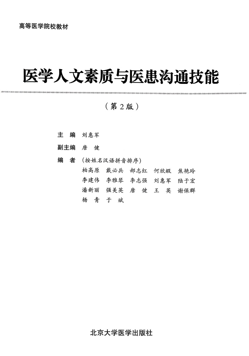 书名:医学人文素质与医患沟通技能(第2版)本科教材